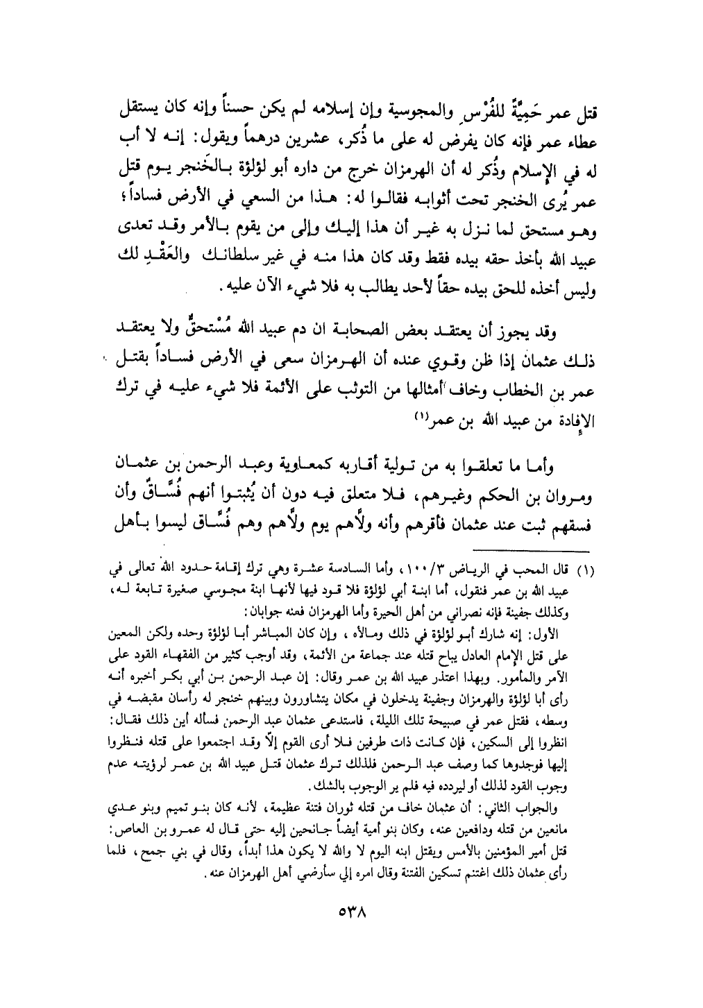 قتل عمر حمية للْفرس والمجوسية وَإِن إِسْلَامه لم يكن حسنا وَإنَّهُ كَانَ يسْتَقلّ عَطاء عمر فَإِنَّهُ كَانَ يفْرض لَهُ على مَا ذكر عشْرين درهما وَيَقُول إِنَّه لَا أَب لَهُ فِي الْإِسْلَام وَذكر لَهُ أَن الهرمزان خرج من دَاره أَبُو لؤلؤة بالخنجر يَوْم قتل عمر يرى الخنجر تَحت أثوابه فَقَالُوا لَهُ هَذَا من السَّعْي فِي الأَرْض فَسَادًا وَهُوَ مُسْتَحقّ لما نزل بِهِ غير أَن هَذَا إِلَيْك وَإِلَى من يقوم بِالْأَمر وَقد تعدى عبيد الله بِأخذ حَقه بِيَدِهِ فَقَط وَقد كَانَ هَذَا مِنْهُ فِي غير سلطانك وَالْعقد لَك وَلَيْسَ أَخذه للحق بِيَدِهِ حَقًا لأحد يُطَالب بِهِ فَلَا شَيْء الْآن عَلَيْهِ