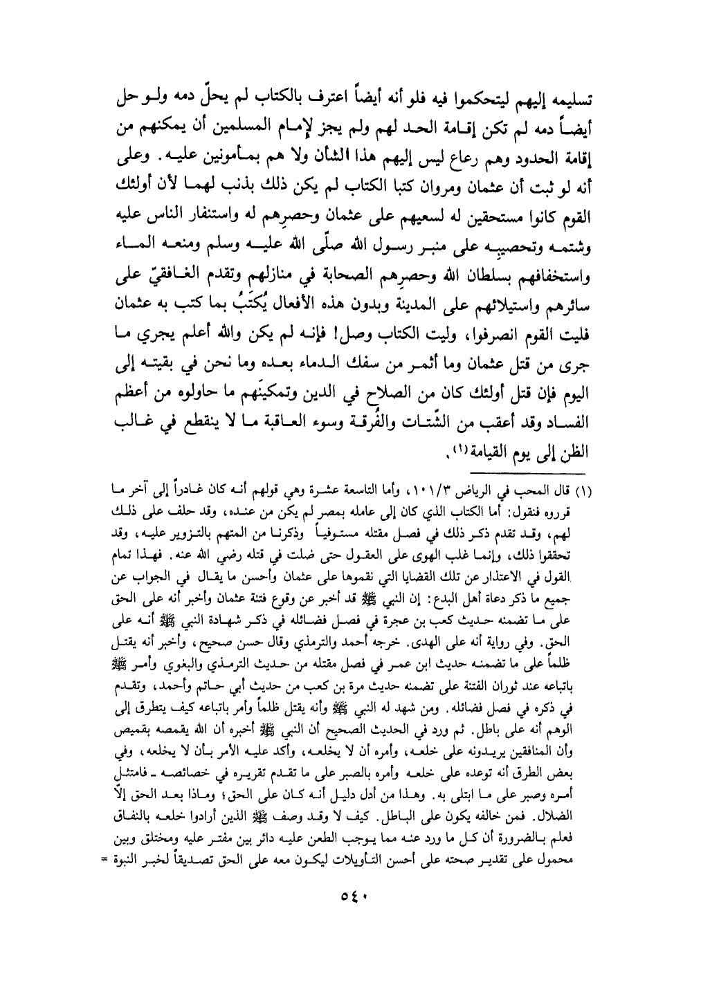 وعَلى أَنه لَو ثَبت أَن عُثْمَان ومروان كتبا الْكتاب لم يكن ذَلِك بذنب لَهما لِأَن أُولَئِكَ الْقَوْم كَانُوا مستحقين لَهُ لسعيهم على عُثْمَان وحصرهم لَهُ واستنفار النَّاس عَلَيْهِ وَشَتمه وتحصيبه على مِنْبَر رَسُول الله صلى الله عَلَيْهِ وَسلم وَمنعه المَاء واستخفافهم بسُلْطَان الله وحصرهم الصَّحَابَة فِي مَنَازِلهمْ وَتقدم الغافقي على سَائِرهمْ واستيلائهم على الْمَدِينَة وَبِدُون هَذِه الْأَفْعَال يكْتب بِمَا كتب بِهِ عُثْمَان فليت الْقَوْم انصرفوا وليت الْكتاب وصل فَإِنَّهُ لم يكن وَالله أعلم يجْرِي مَا جرى من قتل عُثْمَان وَمَا أثمر من سفك الدِّمَاء بعده وَمَا نَحن فِي بَقِيَّته إِلَى الْيَوْم فَإِن قتل أُولَئِكَ كَانَ من الصّلاح فِي الدّين وتمكينهم مَا حاولوه من أعظم الْفساد وَقد أعقب من الشتات والفرقة وَسُوء الْعَاقِبَة مَا لَا يَنْقَطِع فِي غَالب الظَّن إِلَى يَوْم الْقِيَامَة