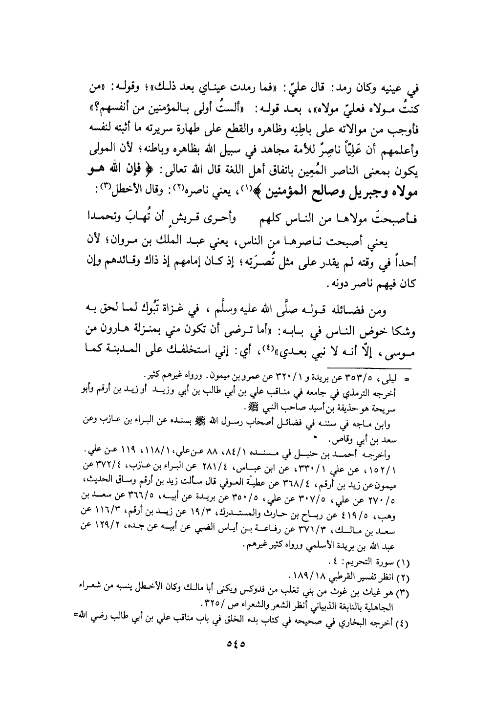 فِي عَيْنَيْهِ وَكَانَ رمد قَالَ عَليّ فَمَا رمدت عَيْنَايَ بعد ذَلِك وَقَوله (من كنت مَوْلَاهُ فعلي مَوْلَاهُ) بعد قَوْله (أَلَسْت أولى بِالْمُؤْمِنِينَ من أنفسهم فَأوجب من موالاته على بَاطِنه وَظَاهره وَالْقطع على طَهَارَة سَرِيرَته مَا أثْبته لنَفسِهِ وأعلمهم أَن عليا نَاصِر للْأمة مُجَاهِد فِي سَبِيل الله بِظَاهِرِهِ وباطنه لِأَن الْمولى يكون بِمَعْنى النَّاصِر الْمعِين بِاتِّفَاق أهل اللُّغَة قَالَ الله تَعَالَى {فَإِن الله هُوَ مَوْلَاهُ وَجِبْرِيل وَصَالح الْمُؤمنِينَ} يَعْنِي ناصره وَقَالَ الأخطل