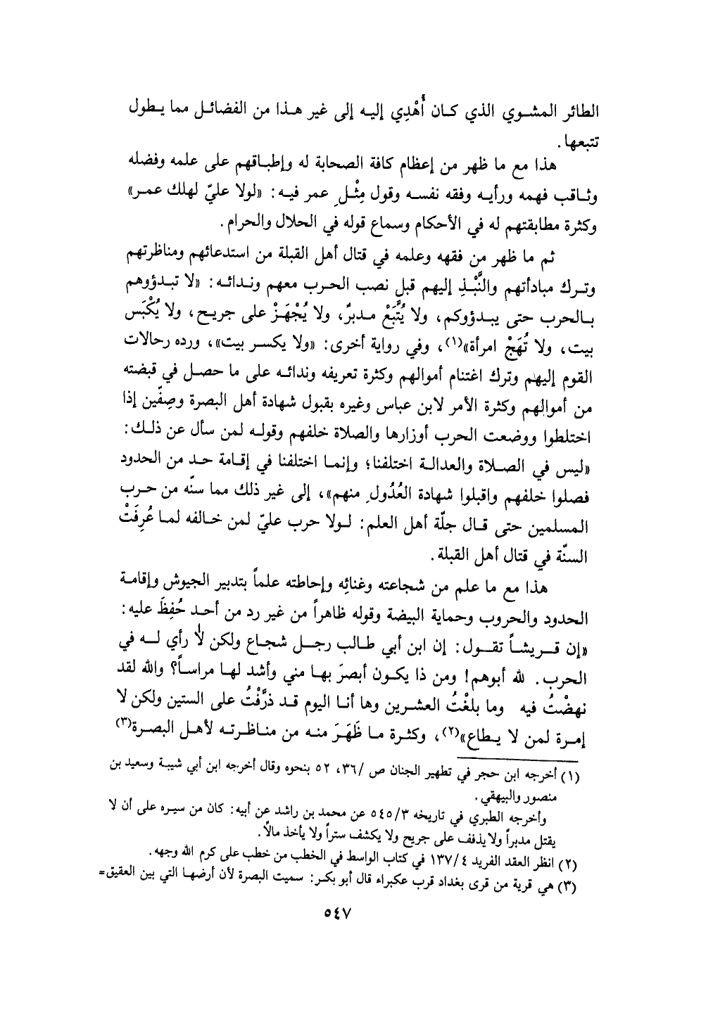 ثمَّ مَا ظهر من فقهه وَعلمه فِي قتال أهل الْقبْلَة من استدعائهم ومناظرتهم وَترك مبادأتهم والنبذ إِلَيْهِم قبل نصب الْحَرْب مَعَهم وندائه (لَا يبدؤوهم بِالْحَرْبِ حَتَّى يبدؤوكم وَلَا يتبع مُدبر وَلَا يُجهز على جريح وَلَا يكبس بَيت وَلَا تهج امْرَأَة) وَفِي رِوَايَة أُخْرَى وَلَا يكسر بَيت ورده رحالات الْقَوْم إِلَيْهِم وَترك اغتنام أَمْوَالهم وَكَثْرَة تَعْرِيفه وندائه على مَا حصل فِي قَبضته من أَمْوَالهم وَكَثْرَة الْأَمر لِابْنِ عَبَّاس وَغَيره بِقبُول شَهَادَة أهل الْبَصْرَة وصفين إِذا اختلطوا وَوضعت الْحَرْب أَوزَارهَا وَالصَّلَاة خَلفهم وَقَوله لمن سَأَلَ عَن ذَلِك (لَيْسَ فِي الصَّلَاة وَالْعَدَالَة اخْتَلَفْنَا وَإِنَّمَا اخْتَلَفْنَا فِي إِقَامَة حد من الْحُدُود فصلوا خَلفهم واقبلوا شَهَادَة الْعُدُول مِنْهُم) إِلَى غير ذَلِك مِمَّا سنه من حَرْب الْمُسلمين حَتَّى قَالَ جلة أهل الْعلم لَوْلَا حَرْب عَليّ لمن خَالفه لما عرفت السّنة فِي قتال أهل الْقبْلَة