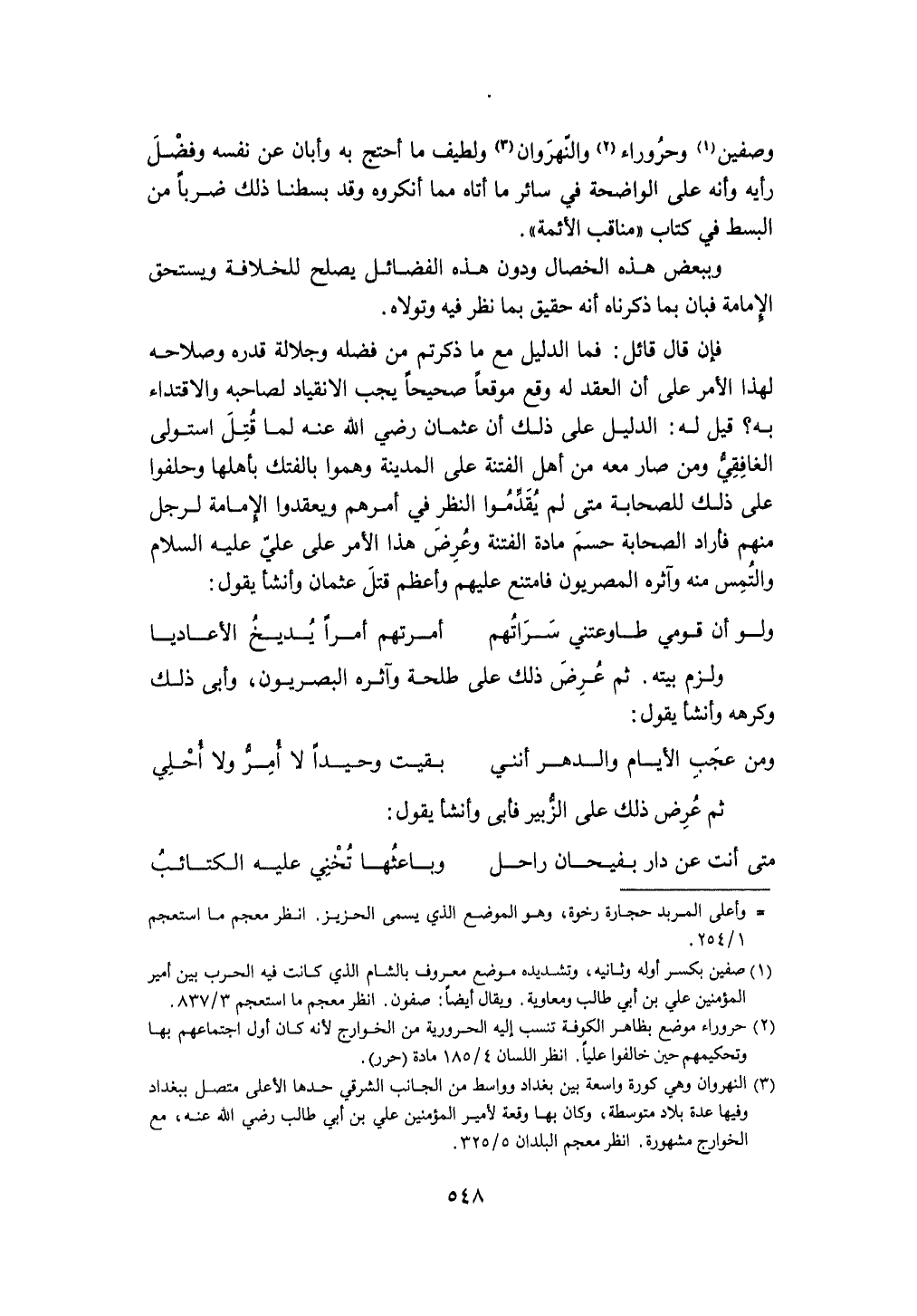 وصفين وحروراء والنهروان ولطيف مَا أحتج بِهِ وَأَبَان عَن نَفسه وَفضل رَأْيه وَأَنه على الْوَاضِحَة فِي سَائِر مَا أَتَاهُ مِمَّا أنكروه وَقد بسطنا ذَلِك ضربا من الْبسط فِي كتاب مَنَاقِب الْأَئِمَّة