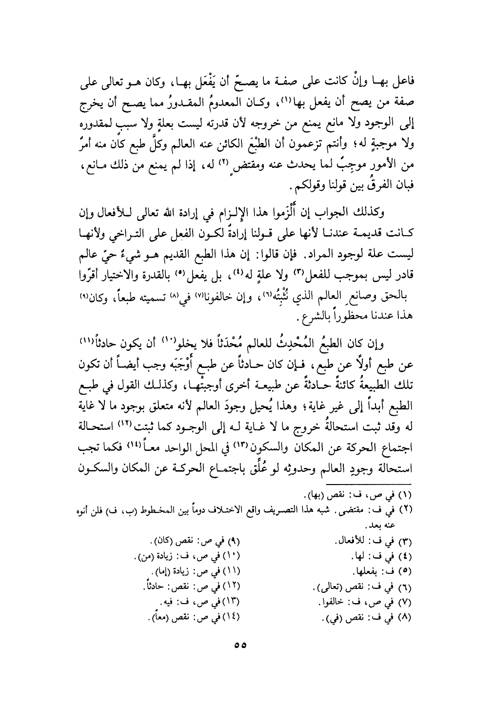 وَإِن كَانَ الطَّبْع الْمُحدث للْعَالم مُحدثا فَلَا يَخْلُو أَن يكون حَادِثا عَن طبع أَولا عَن طبع فَإِن كَانَ حَادِثا عَن طبع أوجبه وَجب أَيْضا أَن تكون تِلْكَ الطبيعة كائنة حَادِثَة عَن طبيعة أُخْرَى أوجبتها وَكَذَلِكَ القَوْل فِي طبع الطَّبْع أبدا إِلَى غير غَايَة وَهَذَا يحِيل وجود الْعَالم لِأَنَّهُ مُتَعَلق بِوُجُود مَا لَا غَايَة لَهُ وَقد ثَبت اسْتِحَالَة خُرُوج مَا لَا غَايَة لَهُ إِلَى الْوُجُود كَمَا ثبتَتْ اسْتِحَالَة اجْتِمَاع الْحَرَكَة عَن الْمَكَان والسكون فِي الْمحل الْوَاحِد مَعًا فَكَمَا تجب اسْتِحَالَة وجود الْعَالم وحدوثه لَو علق باجتماع الْحَرَكَة عَن الْمَكَان والسكون
