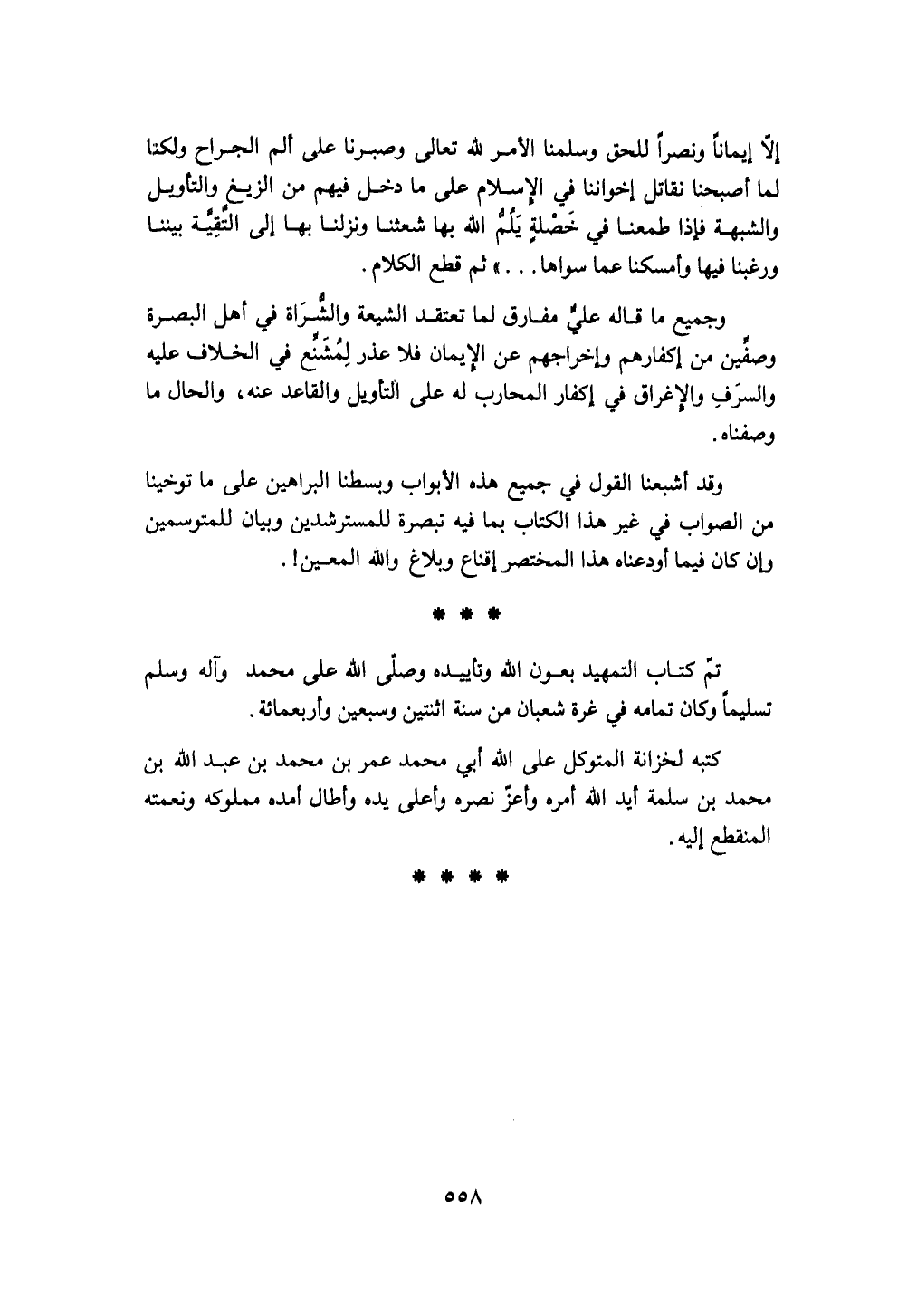 ثمَّ كتاب التَّمْهِيد بعون الله وتأييده وَصلى الله على مُحَمَّد وَآله وَسلم تَسْلِيمًا وَكَانَ تَمَامه فِي غرَّة شعْبَان من سنة اثْنَتَيْنِ وَسبعين وأربعمائه