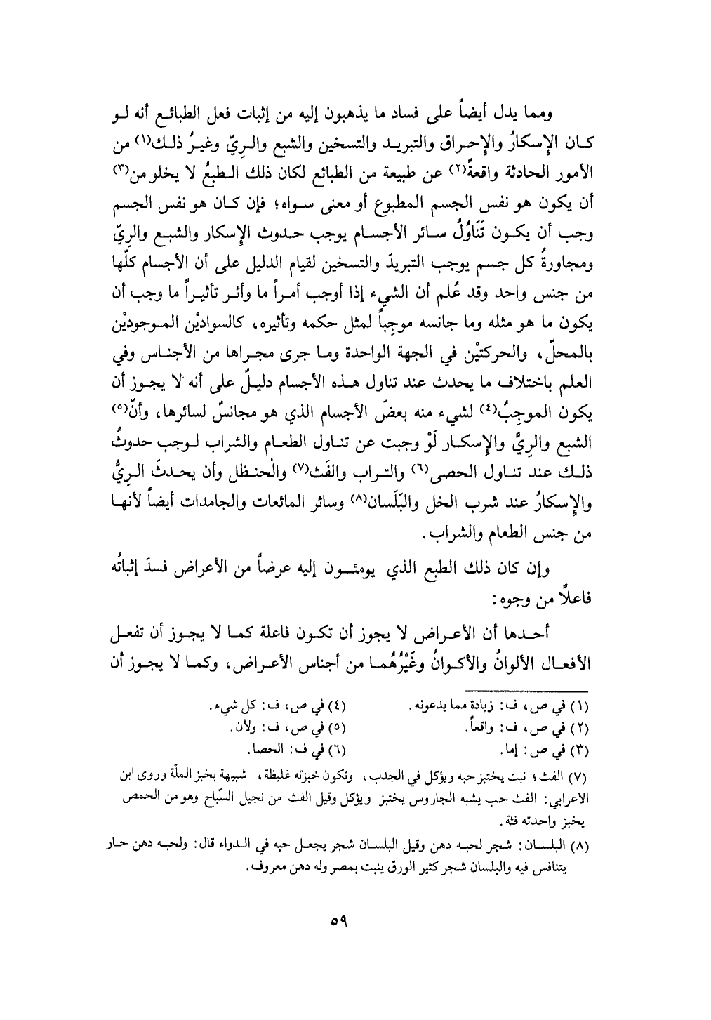 وَمِمَّا يدل أَيْضا على فَسَاد مَا يذهبون إِلَيْهِ من إِثْبَات فعل الطبائع أَنه لَو كَانَ الْإِسْكَار والإحراق والتبريد والتسخين والشبع والري وَغير ذَلِك من الْأُمُور الْحَادِثَة وَاقعَة عَن طبيعة من الطبائع لَكَانَ ذَلِك الطَّبْع لَا يَخْلُو من أَن يكون هُوَ نفس الْجِسْم المطبوع أَو معنى سواهُ فَإِن كَانَ هُوَ نفس الْجِسْم وَجب أَن يكون تنَاول سَائِر الْأَجْسَام يُوجب حُدُوث الْإِسْكَار والشبع والري ومجاورة كل جسم يُوجب التبريد والتسخين لقِيَام الدَّلِيل على أَن الْأَجْسَام كلهَا من جنس وَاحِد وَقد علم أَن الشَّيْء إِذا أوجب أمرا مَا وَأثر تَأْثِيرا مَا وَجب أَن يكون مَا هُوَ مثله وَمَا جانسه مُوجبا لمثل حكمه وتأثيره كالسوادين الْمَوْجُودين بِالْمحل والحركتين فِي الْجِهَة الْوَاحِدَة وَمَا جرى مجْراهَا من الْأَجْنَاس وَفِي الْعلم باخْتلَاف مَا يحدث عِنْد تنَاول هَذِه الْأَجْسَام دَلِيل على أَنه لَا يجوز أَن يكون الْمُوجب لشَيْء مِنْهُ بعض الْأَجْسَام الَّذِي هُوَ مجانس لسائرها وَأَن الشِّبَع والري والإسكار لَو وَجَبت عَن تنَاول الطَّعَام وَالشرَاب لوَجَبَ حُدُوث ذَلِك عِنْد تنَاول الْحَصَى وَالتُّرَاب والفث والحنظل وَأَن يحدث الرّيّ والإسكار عِنْد شرب الْخلّ والبلسان وَسَائِر الْمَائِعَات والجامدات أَيْضا لِأَنَّهَا من جنس الطَّعَام وَالشرَاب