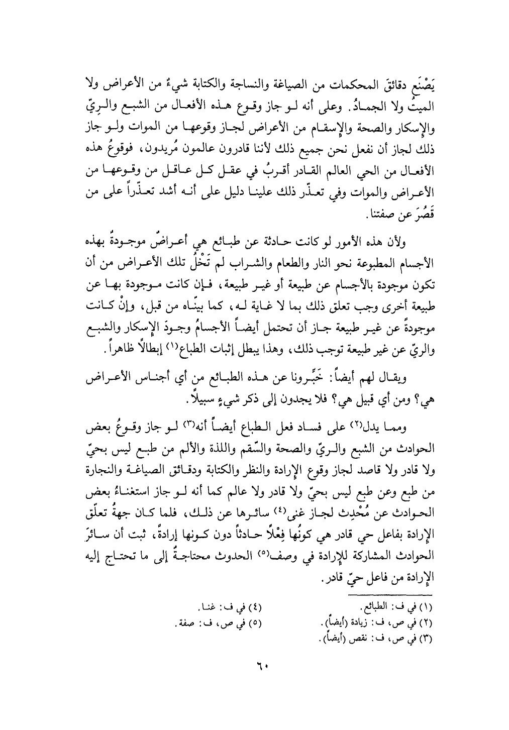 وَمِمَّا يدل على فَسَاد فعل الطباع أَيْضا أَنه لَو جَازَ وُقُوع بعض الْحَوَادِث من الشِّبَع والري وَالصِّحَّة والسقم واللذة والألم من طبع لَيْسَ بحي وَلَا قَادر وَلَا قَاصد لجَاز وُقُوع الْإِرَادَة وَالنَّظَر وَالْكِتَابَة ودقائق الصياغة والنجارة من طبع وَعَن طبع لَيْسَ بحي وَلَا قَادر وَلَا عَالم كَمَا أَنه لَو جَازَ اسْتغْنَاء بعض الْحَوَادِث عَن مُحدث لجَاز غنى سائرها عَن ذَلِك فَلَمَّا كَانَ جِهَة تعلق الْإِرَادَة بفاعل حَيّ قَادر هِيَ كَونهَا فعلا حَادِثا دون كَونهَا إِرَادَة ثَبت أَن سَائِر الْحَوَادِث الْمُشَاركَة للإرادة فِي وصف الْحُدُوث محتاجة إِلَى مَا تحْتَاج إِلَيْهِ الْإِرَادَة من فَاعل حَيّ قَادر