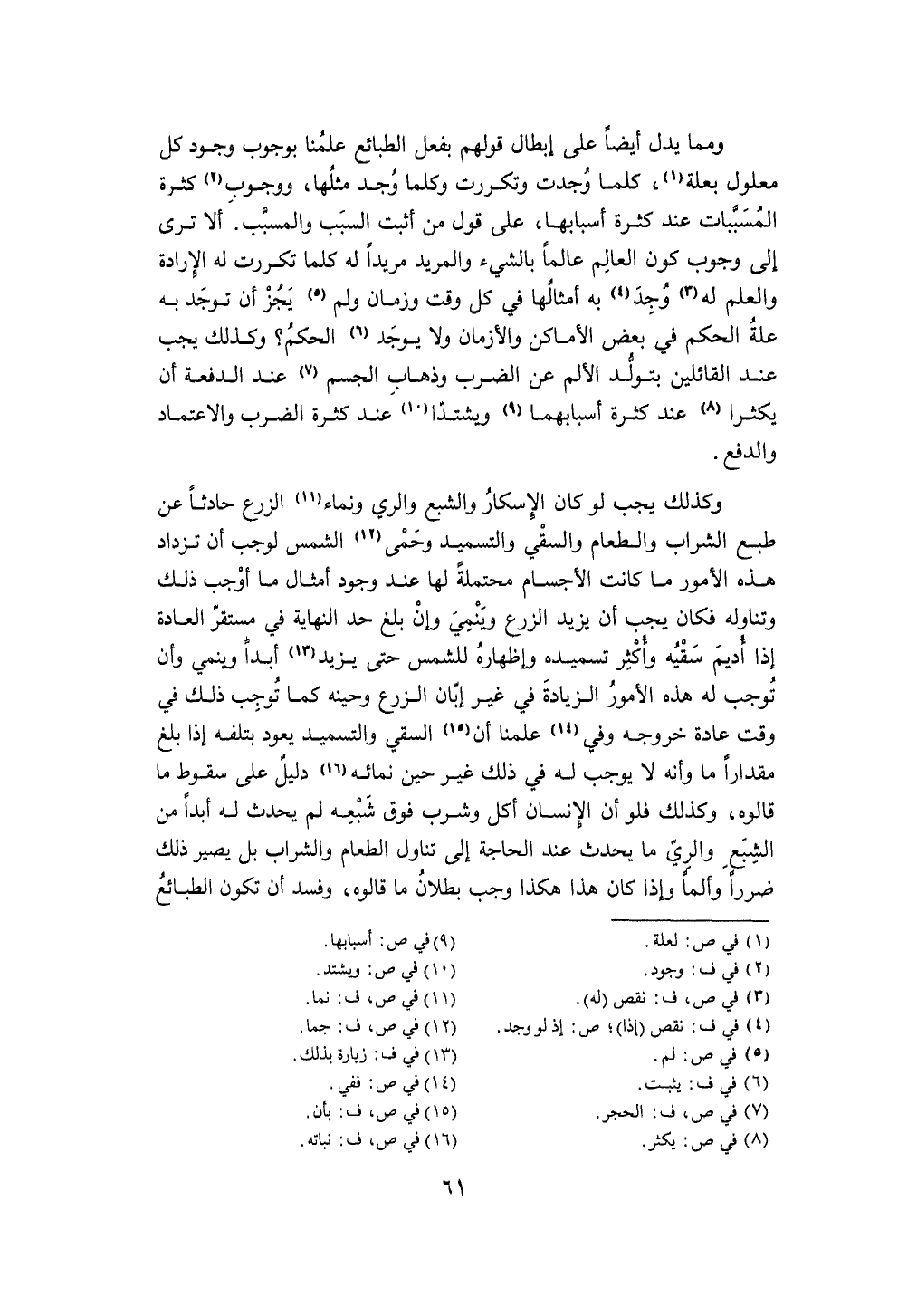 وَمِمَّا يدل أَيْضا على إبِْطَال قَوْلهم بِفعل الطبائع علمنَا بِوُجُوب وجود كل مَعْلُول بعلة كلما وجدت وتكررت وَكلما وجد مثلهَا وَوُجُوب كَثْرَة المسببات عِنْد كَثْرَة أَسبَابهَا على قَول من أثبت السَّبَب والمسبب
