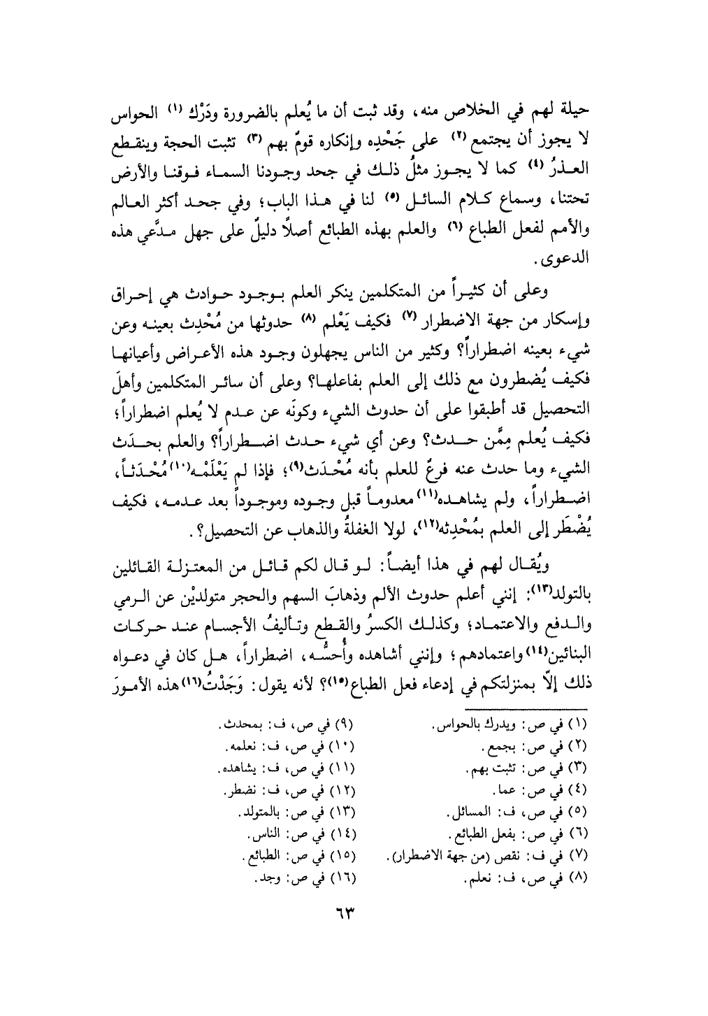 وعَلى أَن كثيرا من الْمُتَكَلِّمين يُنكر الْعلم بِوُجُود حوادث هِيَ إحراق وإسكار من جِهَة الإضطرار فَكيف يعلم حدوثها من مُحدث بِعَيْنِه وَعَن شَيْء بِعَيْنِه اضطرار وَكثير من النَّاس يجهلون وجود هَذِه الْأَعْرَاض وأعيانها فَكيف يضطرون مَعَ ذَلِك إِلَى الْعلم بفاعلها وعَلى أَن سَائِر الْمُتَكَلِّمين وَأهل التَّحْصِيل قد أطبقوا على أَن حُدُوث الشَّيْء وَكَونه عَن عدم لَا يعلم اضطرارا فَكيف يعلم مِمَّن حدث وَعَن أَي شَيْء حدث اضطرارا وَالْعلم بِحَدَث الشَّيْء وَمَا حدث عَنهُ فرع للْعلم بِأَنَّهُ مُحدث فَإِذا لم يُعلمهُ مُحدثا اضطرارا وَلم يُشَاهِدهُ مَعْدُوما قبل وجوده وموجودا بعد عَدمه فَكيف يضْطَر إِلَى الْعلم بمحدثه لَوْلَا الْغَفْلَة والذهاب عَن التَّحْصِيل