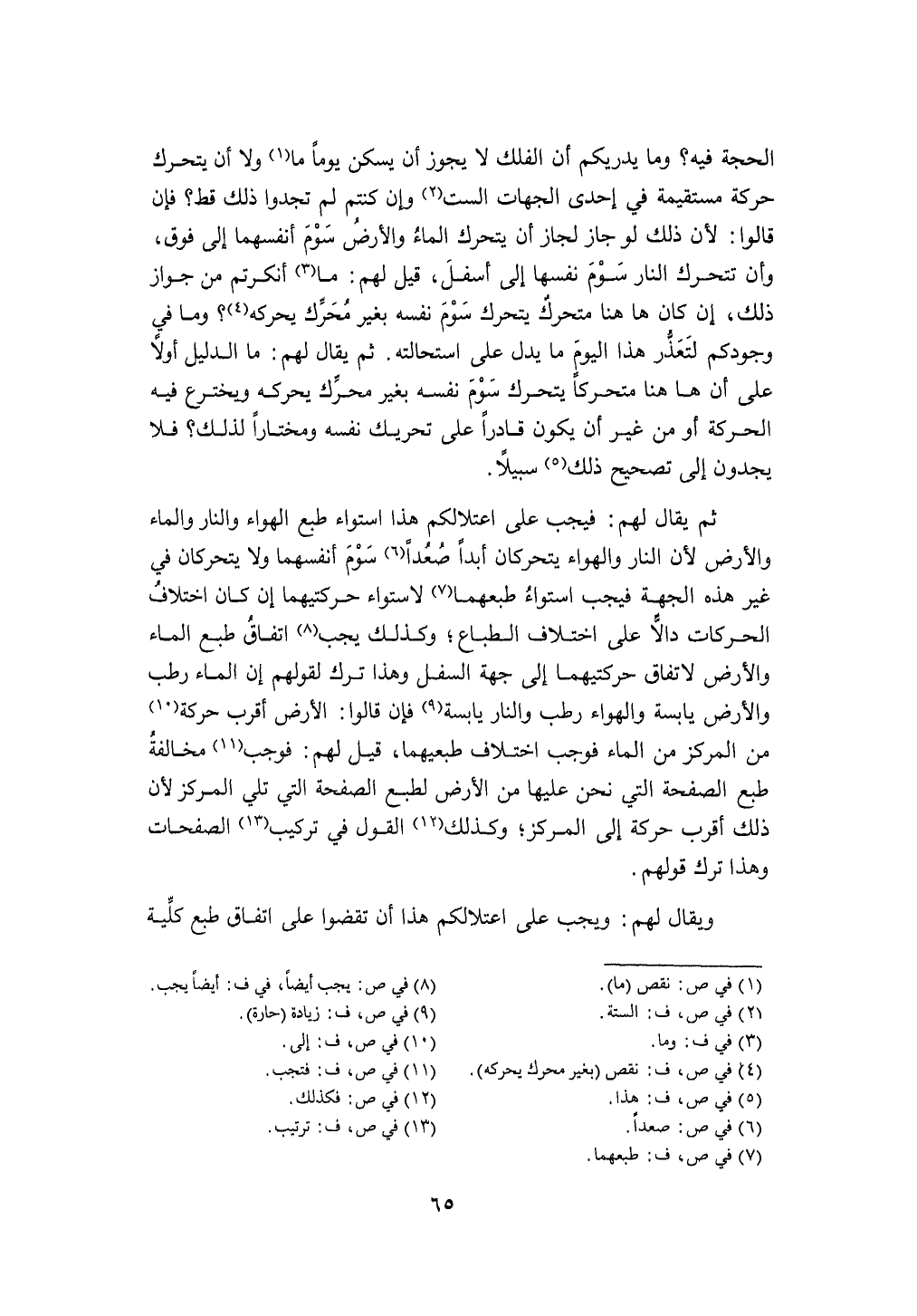 الْحجَّة فِيهِ وَمَا يدريكم أَن الْفلك لَا يجوز أَن يسكن يَوْمًا مَا وَلَا أَن يَتَحَرَّك حَرَكَة مُسْتَقِيمَة فِي إِحْدَى الْجِهَات السِّت وَإِن كُنْتُم لم تَجدوا ذَلِك قطّ فَإِن قَالُوا لِأَن ذَلِك لَو جَازَ لجَاز أَن يَتَحَرَّك المَاء وَالْأَرْض سوم أَنفسهمَا إِلَى فَوق وَأَن تتحرك النَّار سوم نَفسهَا إِلَى أَسْفَل قيل لَهُم مَا أنكرتم من جَوَاز ذَلِك إِن كَانَ هَا هُنَا متحرك يَتَحَرَّك سوم نَفسه بِغَيْر متحرك يحركه وَمَا فِي وجودكم لتعذر هَذَا الْيَوْم مَا يدل على استحالته