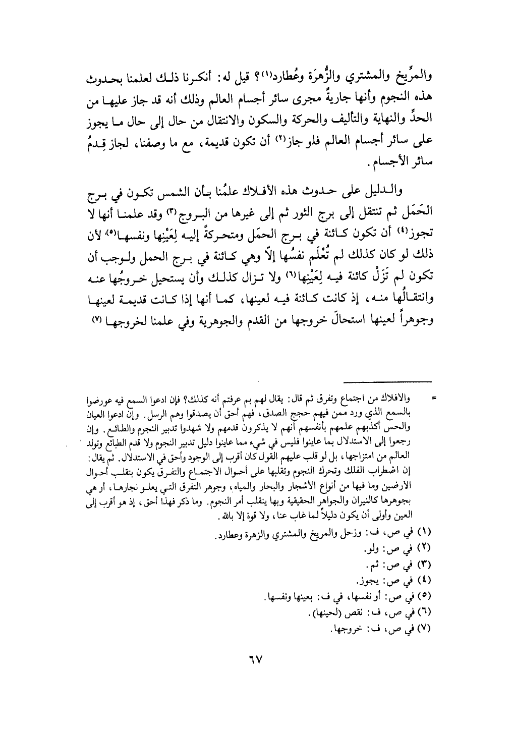 وَالدَّلِيل على حُدُوث هَذِه الأفلاك علمنَا بِأَن الشَّمْس تكون فِي برج الْحمل ثمَّ تنْتَقل إِلَى برج الثور ثمَّ إِلَى غَيرهَا من البروج وَقد علمنَا أَنَّهَا لَا تجوز أَن تكون كائنة فِي برج الْحمل ومتحركة إِلَيْهِ لعينها ونفسها لِأَن ذَلِك لَو كَانَ كَذَلِك لم تعلم نَفسهَا إِلَّا وَهِي كائنة فِي برج الْحمل ولوجب أَن تكون لم تزل كائنة فِيهِ لعينها وَلَا تزَال كَذَلِك وَأَن يَسْتَحِيل خُرُوجهَا عَنهُ وانتقالها مِنْهُ إِذْ كَانَت كائنة فِيهِ لعينها كَمَا أَنَّهَا إِذا كَانَت قديمَة لعينها وجوهرا لعينها اسْتَحَالَ خُرُوجهَا من الْقدَم والجوهرية وَفِي علمنَا لخروجها