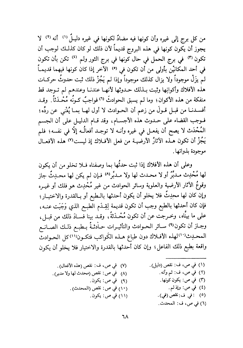 وعَلى أَن هَذِه الأفلاك إِذا ثَبت حدثها بِمَا وصفناه فَلَا تَخْلُو من أَن يكون لَهَا مُحدث مُدبر أَو لَا مُحدث لَهَا وَلَا مُدبر فَإِن لم يكن لَهَا مُحدث جَازَ وُقُوع الْآثَار الأرضية والعلوية وَسَائِر الْحَوَادِث من غير مُحدث هُوَ فلك أَو غَيره وَإِن كَانَ لَهَا مُحدث فَلَا يَخْلُو أَن يكون أحدثها بالطبع أَو بِالْقُدْرَةِ وَالِاخْتِيَار فَإِن كَانَ أحدثها بالطبع وَجب أَن تكون قديمَة لقدم الطَّبْع الَّذِي وَجَبت عَنهُ على مَا بَيناهُ وَخرجت عَن أَن تكون محدثة وَقد بَينا فَسَاد ذَلِك من قبل وَجَاز أَن تكون سَائِر الْحَوَادِث والتأثيرات حَادِثَة بطبع ذَلِك الصَّانِع الْمُحدث لهَذِهِ الأفلاك دون طباع هَذِه الْكَوَاكِب فَتكون كل الْحَوَادِث وَاقعَة بطبع ذَلِك الْفَاعِل وَإِن كَانَ أحدثها بِالْقُدْرَةِ وَالِاخْتِيَار فَلَا يَخْلُو أَن يكون