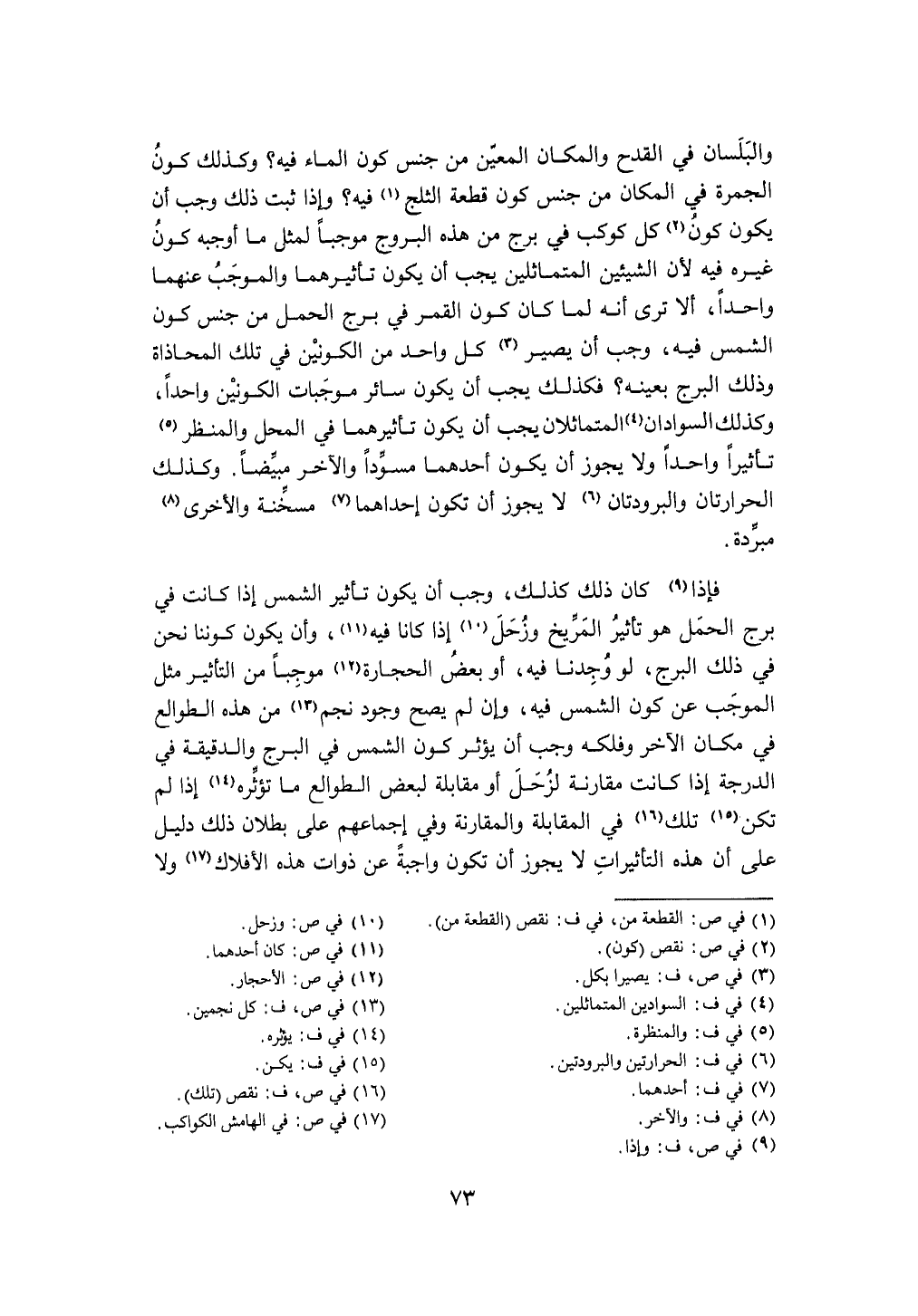 فَإِذا كَانَ ذَلِك كَذَلِك وَجب أَن يكون تَأْثِير الشَّمْس إِذا كَانَت فِي برج الْحمل هُوَ تَأْثِير المريخ وزحل إِذا كَانَا فِيهِ وَأَن يكون كوننا نَحن فِي ذَلِك البرج لَو وجدنَا فِيهِ أَو بعض الْحِجَارَة مُوجبا من التَّأْثِير مثل الْمُوجب عَن كَون الشَّمْس فِيهِ وَإِن لم يَصح وجود نجم من هَذِه الطوالع فِي مَكَان الآخر وفلكه وَجب أَن يُؤثر كَون الشَّمْس فِي البرج والدقيقة فِي الدرجَة إِذا كَانَت مُقَارنَة لزحل أَو مُقَابلَة لبَعض الطوالع مَا تؤثره إِذا لم تكن تِلْكَ فِي الْمُقَابلَة والمقارنة وَفِي إِجْمَاعهم على بطلَان ذَلِك دَلِيل على أَن هَذِه التأثيرات لَا يجوز أَن تكون وَاجِبَة عَن ذَوَات هَذِه الأفلاك وَلَا