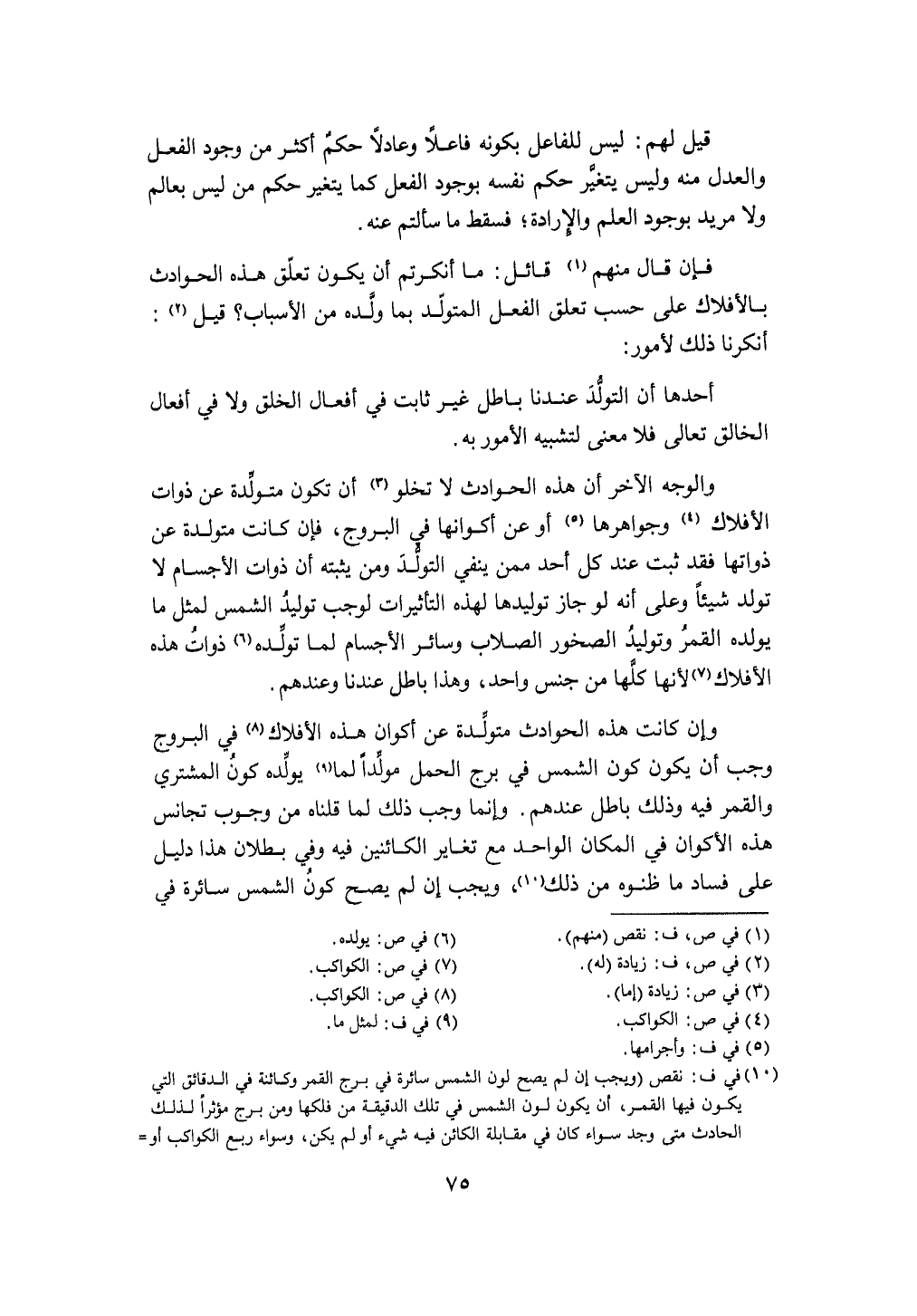 فَإِن قَالَ مِنْهُم قَائِل مَا أنكرتم أَن يكون تعلق هَذِه الْحَوَادِث بالأفلاك على حسب تعلق الْفِعْل الْمُتَوَلد بِمَا وَلَده من الْأَسْبَاب قيل أَنْكَرْنَا ذَلِك لأمور أَحدهَا أَن التولد عندنَا بَاطِل غير ثَابت فِي أَفعَال الْخلق وَلَا فِي أَفعَال الْخَالِق تَعَالَى فَلَا معنى لتشبيه الْأُمُور بِهِ