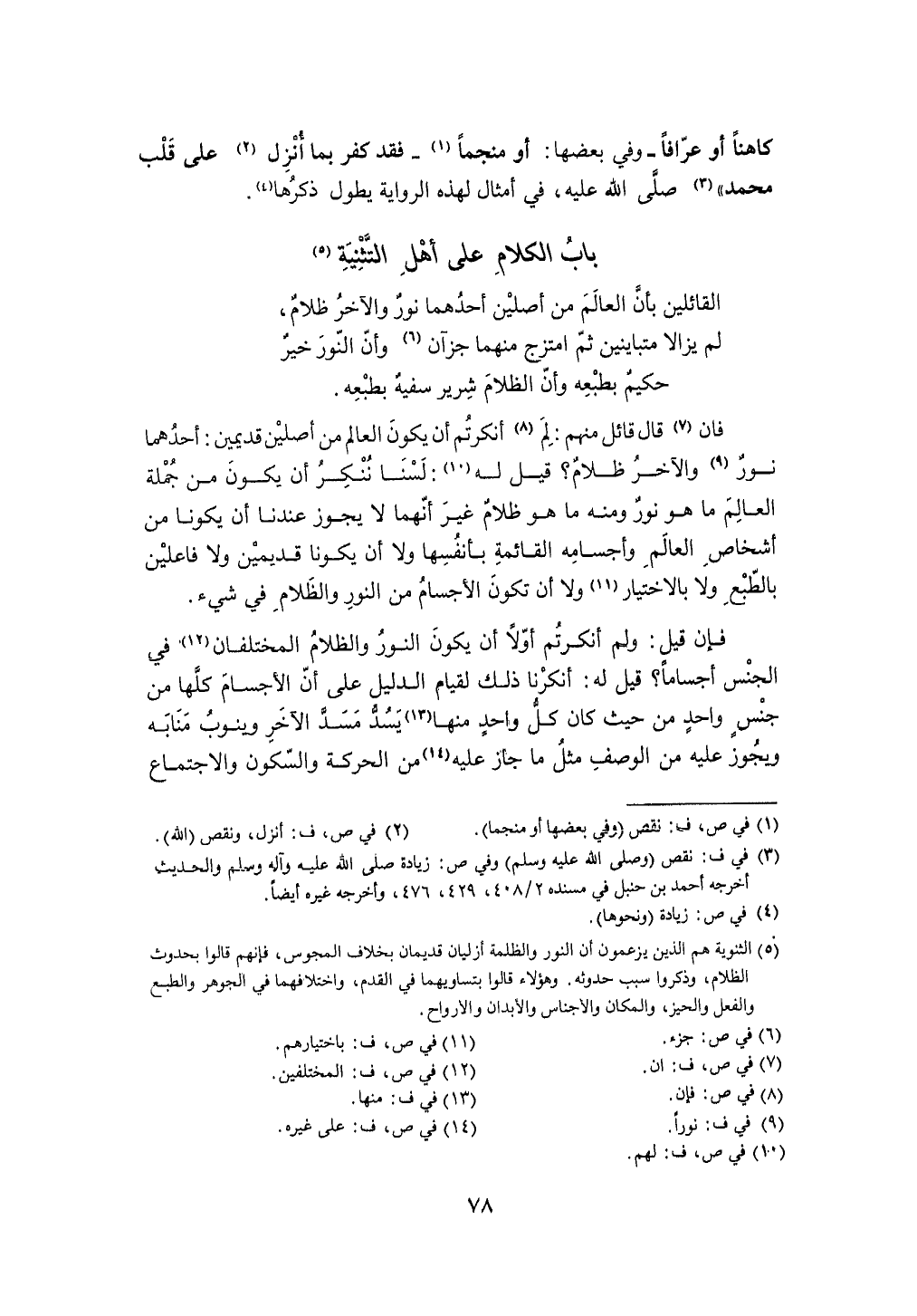 فَإِن قَالَ قَائِل مِنْهُم لم أنكرتم أَن يكون الْعَالم من أصلين قديمين أَحدهمَا نور وَالْآخر ظلام قيل لَهُ لسنا ننكر أَن يكون من جملَة الْعَالم مَا هُوَ نور وَمِنْه مَا هُوَ ظلام غير أَنَّهُمَا لَا يجوز عندنَا أَن يَكُونَا من أشخاص الْعَالم وأجسامه الْقَائِمَة بأنفسها وَلَا أَن يَكُونَا قديمين وَلَا فاعلين بالطبع وَلَا بِالِاخْتِيَارِ وَلَا أَن تكون الْأَجْسَام من النُّور والظلام فِي شَيْء