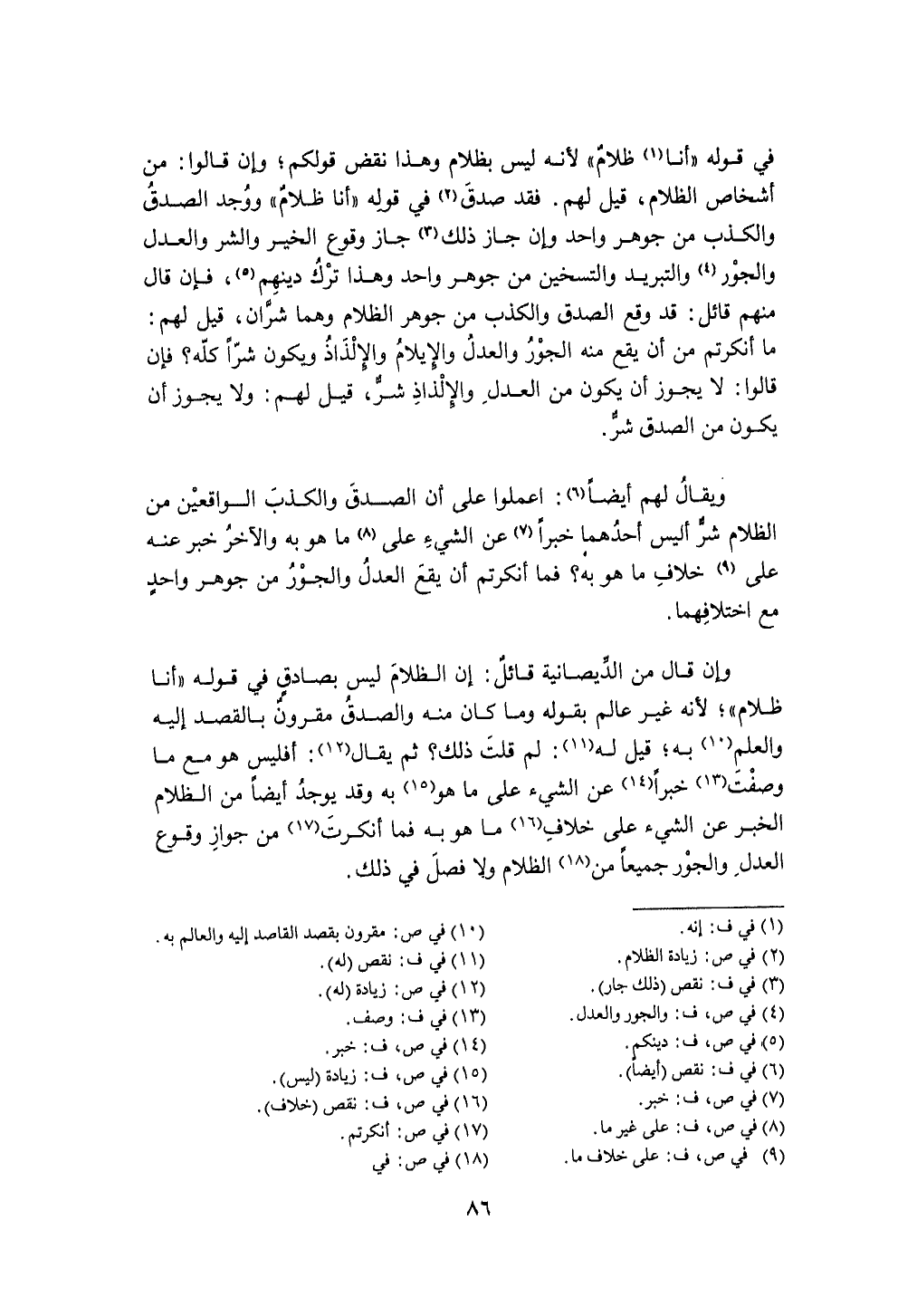 فقد صدق فِي قَوْله أَنا ظلام وَوجد الصدْق وَالْكذب من جَوْهَر وَاحِد وَإِن جَازَ ذَلِك جَازَ وُقُوع الْخَيْر وَالشَّر وَالْعدْل والجور والتبريد والتسخين من جَوْهَر وَاحِد وَهَذَا ترك دينهم فَإِن قَالَ مِنْهُم قَائِل قد وَقع الصدْق وَالْكذب من جَوْهَر الظلام وهما شران قيل لَهُم مَا أنكرتم من أَن يَقع مِنْهُ الْجور وَالْعدْل والإيلام والإلذاد وَيكون شرا كُله فَإِن قَالُوا لَا يجوز أَن يكون من الْعدْل والإلذاذ شَرّ قيل لَهُم وَلَا يجوز أَن يكون من الصدْق شَرّ