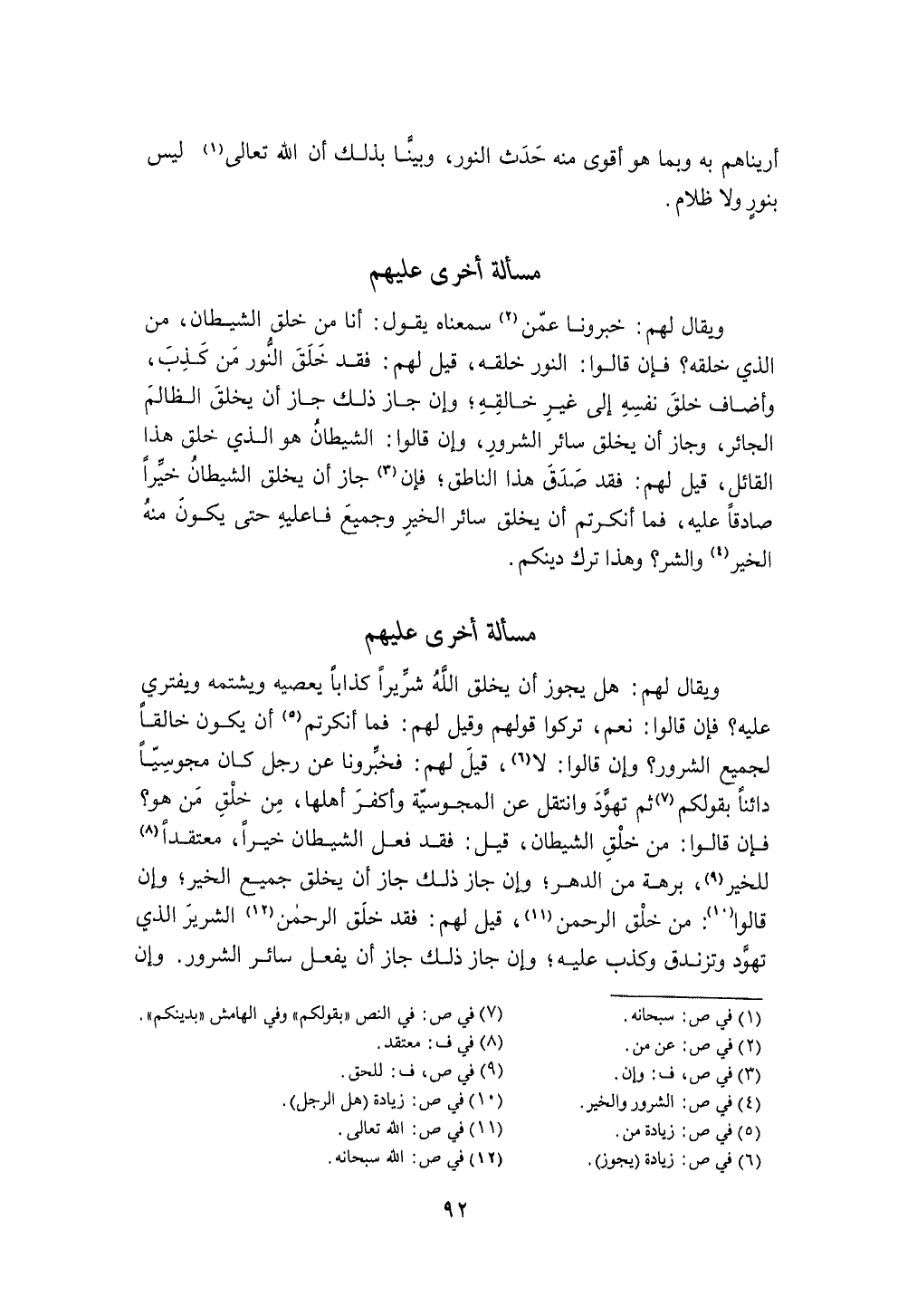 وَيُقَال لَهُم خبرونا عَمَّن سمعناه يَقُول أَنا من خلق الشَّيْطَان من الَّذِي خلقه فَإِن قَالُوا النُّور خلقه قيل لَهُم فقد خلق النُّور من كذب وأضاف خلق نَفسه إِلَى غير خالقه وَإِن جَازَ ذَلِك جَازَ أَن يخلق الظَّالِم الجائر وَجَاز أَن يخلق سَائِر الشرور وَإِن قَالُوا الشَّيْطَان هُوَ الَّذِي خلق هَذَا الْقَائِل قيل لَهُم فقد صدق هَذَا النَّاطِق فَإِن جَازَ أَن يخلق الشَّيْطَان خيرا صَادِقا عَلَيْهِ فَمَا أنكرتم أَن يخلق سَائِر الْخَيْر وَجَمِيع فاعليه حَتَّى يكون مِنْهُ الْخَيْر وَالشَّر وَهَذَا ترك دينكُمْ
