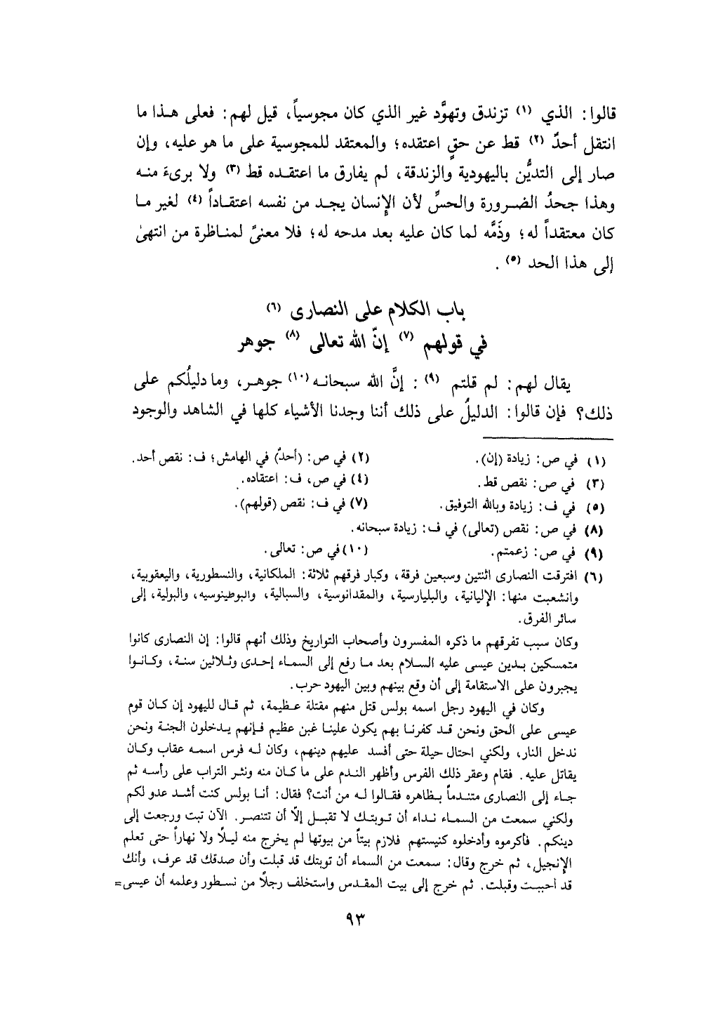 بَاب الْكَلَام على النَّصَارَى فِي قَوْلهم إِن الله تَعَالَى جَوْهَر