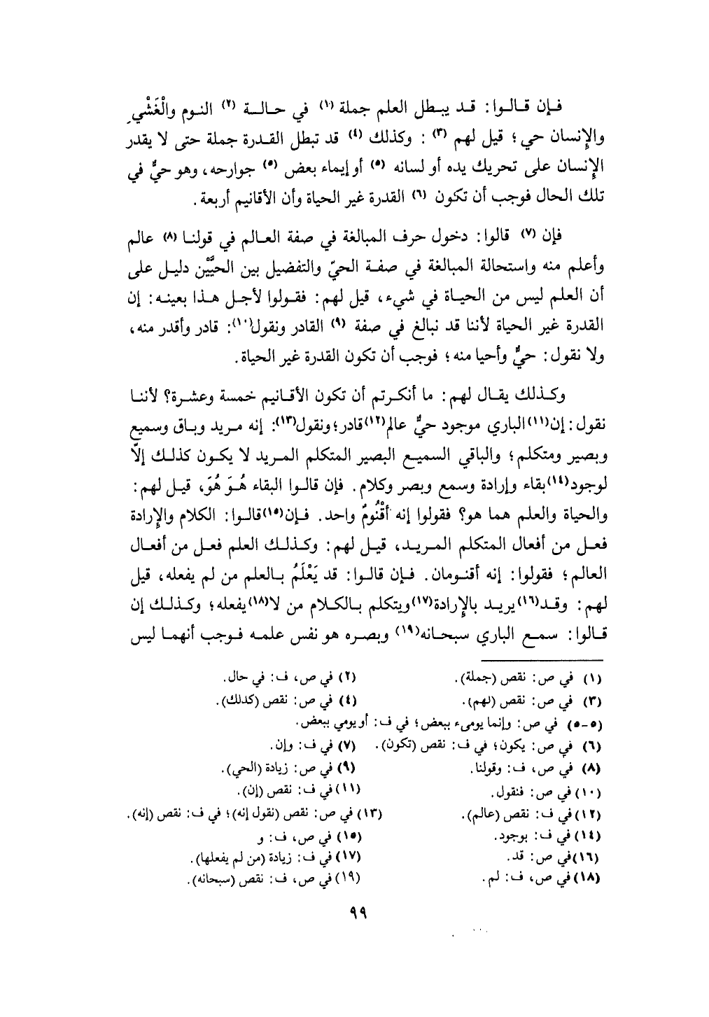 وَكَذَلِكَ يُقَال لَهُم مَا أنكرتم أَن تكون الأقانيم خَمْسَة وَعشرَة لأننا نقُول إِن الْبَارِي مَوْجُود حَيّ عَالم قَادر ونقول إِنَّه مُرِيد وباق وَسميع وبصير ومتكلم وَالْبَاقِي السَّمِيع الْبَصِير الْمُتَكَلّم المريد لَا يكون كَذَلِك إِلَّا لوُجُود بَقَاء وَإِرَادَة وَسمع وبصر وَكَلَام