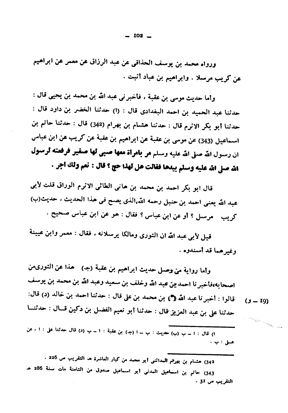وَرَوَاهُ مُحَمَّدُ بْنُ يُوسُفَ الْحُذَاقِيُّ عَنْ عَبْدِ الرَّزَّاقِ عَنْ مَعْمَرٍ عَنْ إِبْرَاهِيمَ عَنْ كُرَيْبٍ مُرْسَلًا وَإِبْرَاهِيمُ بْنُ عَبَّادٍ أَثْبَتُ وَأَمَّا حَدِيثُ مُوسَى بْنِ عُقْبَةَ فَأَخْبَرَنِي عَبْدُ اللَّهِ بْنُ مُحَمَّدِ بْنِ يَحْيَى قَالَ حَدَّثَنَا عَبْدُ الْحَمِيدِ بْنُ أَحْمَدَ الْبَغْدَادِيُّ قَالَ حَدَّثَنَا الْخَضِرُ بْنُ دَاوُدَ قَالَ حَدَّثَنَا أَبُو بَكْرٍ الْأَثْرَمُ قَالَ حَدَّثَنَا هِشَامُ بْنُ بَهْرَامٍ قَالَ حَدَّثَنَا حَاتِمُ بْنُ إِسْمَاعِيلَ عَنْ مُوسَى بْنِ عُقْبَةَ عَنْ إِبْرَاهِيمَ بْنِ عُقْبَةَ عَنْ كُرَيْبٍ عَنِ ابْنِ عَبَّاسٍ أَنَّ رَسُولَ اللَّهِ صَلَّى اللَّهُ عَلَيْهِ وَسَلَّمَ مَرَّ بِامْرَأَةٍ مَعَهَا صَبِيٌّ لَهَا صَغِيرٌ فَرَفَعَتْهُ لِرَسُولِ اللَّهِ صَلَّى اللَّهُ عَلَيْهِ وَسَلَّمَ بِيَدِهَا فَقَالَتْ هَلْ لِهَذَا حَجٌّ قَالَ نَعَمْ وَلَكِ أَجْرٌ قَالَ أَبُو بَكْرٍ أَحْمَدُ بْنُ محمد بن هاني الطَّائِيُّ الْأَثْرَمُ الْوَرَّاقُ قُلْتُ لِأَبِي عَبْدِ اللَّهِ يَعْنِي أَحْمَدَ بْنَ حَنْبَلٍ رَحِمَهُ اللَّهُ الَّذِي يَصِحُّ فِي هَذَا الْحَدِيثِ حَدِيثِ كُرَيْبٍ مُرْسَلٌ أَوْ عَنِ ابْنِ عَبَّاسٍ فَقَالَ هُوَ عَنِ ابْنِ عَبَّاسٍ صَحِيحٌ قِيلَ لِأَبِي عَبْدِ اللَّهِ إِنَّ الثَّوْرِيَّ وَمَالِكًا يُرْسِلَانِهِ فَقَالَ مَعْمَرٌ وَابْنُ عُيَيْنَةَ وَغَيْرُهُمَا قَدْ أَسْنَدُوهُ وَأَمَّا رِوَايَةُ مَنْ وَصَلَ حَدِيثَ إِبْرَاهِيمَ بْنِ عُقْبَةَ هَذَا عَنِ الثَّوْرِيِّ مِنْ أَصْحَابِهِ فَأَخْبَرَنَا أَحْمَدُ بْنُ عَبْدِ اللَّهِ وَخَلَفُ بْنُ سَعِيدٍ وَعَبْدُ اللَّهِ بْنُ مُحَمَّدِ بْنِ يُوسُفَ قَالُوا أَخْبَرَنَا عَبْدُ اللَّهِ بْنُ مُحَمَّدِ بْنِ عَلِيٍّ قَالَ حَدَّثَنَا أَحْمَدُ بْنُ خَالِدٍ قَالَ حَدَّثَنَا عَلِيُّ بْنُ عَبْدِ الْعَزِيزِ قَالَ حَدَّثَنَا أَبُو نُعَيْمٍ الْفَضْلُ بْنُ دُكَيْنٍ قَالَ حَدَّثَنَا