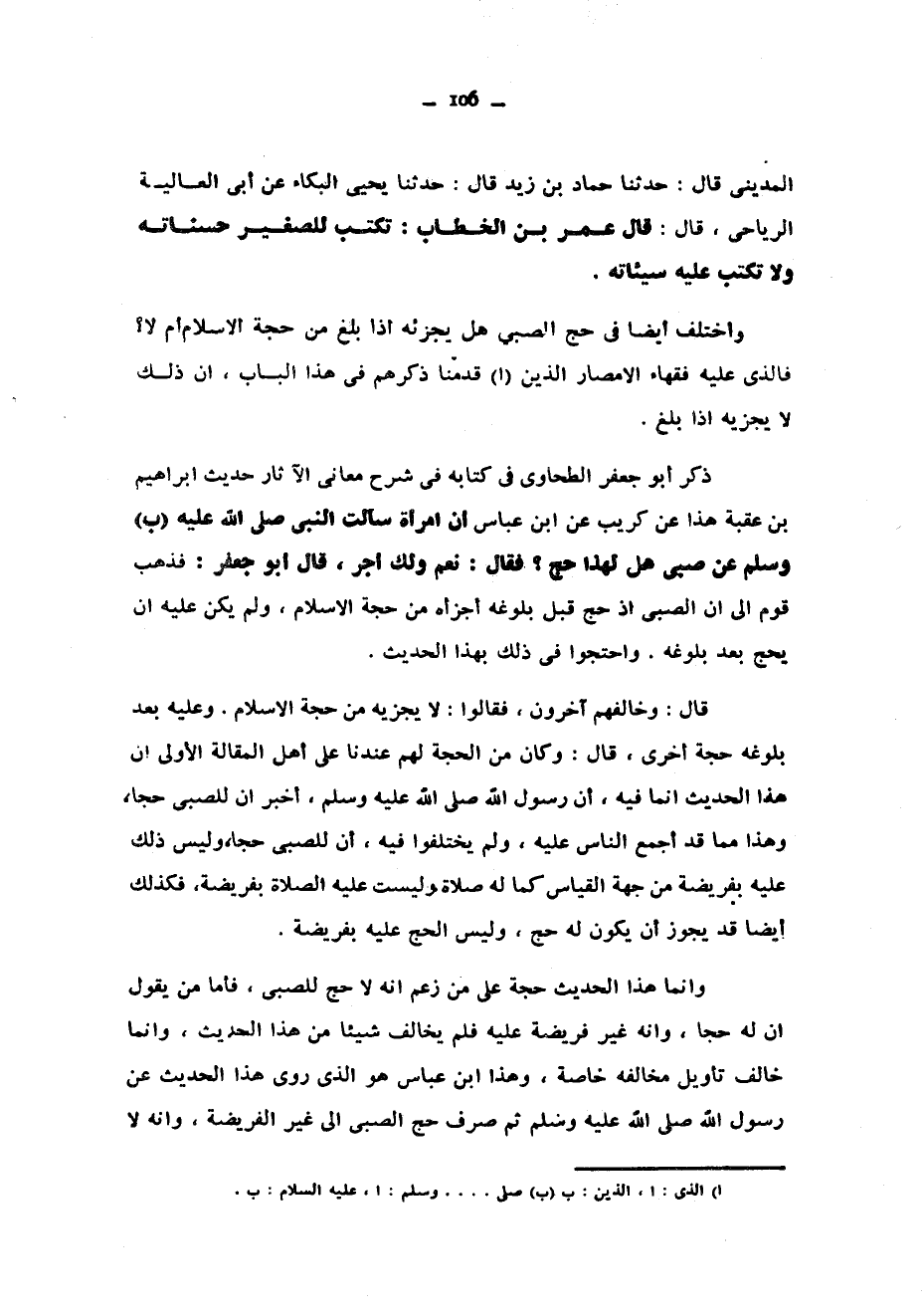 الْمَدِينِيِّ قَالَ حَدَّثَنَا حَمَّادُ بْنُ زَيْدٍ قَالَ حَدَّثَنَا يَحْيَى الْبَكَّاءُ عَنْ أَبِي الْعَالِيَةِ الرِّيَاحِيِّ قَالَ قَالَ عُمَرُ بْنُ الْخَطَّابِ تُكْتَبُ لِلصَّغِيرِ حَسَنَاتُهُ وَلَا تُكْتَبُ عَلَيْهِ سَيِّئَاتُهُ وَاخْتُلِفَ أَيْضًا فِي حَجِّ الصَّبِيِّ هَلْ يُجْزِئُهُ إِذَا بَلَغَ مِنْ حَجَّةِ الْإِسْلَامِ أَمْ لَا فَالَّذِي عَلَيْهِ فُقَهَاءُ الْأَمْصَارِ الَّذِينَ قَدَّمْنَا ذِكْرَهُمْ فِي هَذَا الْبَابِ أَنَّ ذَلِكَ لَا يَجْزِيهِ إِذَا بَلَغَ ذَكَرَ أَبُو جَعْفَرٍ الطَّحَاوِيُّ فِي كِتَابِهِ فِي شَرْحِ مَعَانِي الْآثَارِ حَدِيثَ إِبْرَاهِيمَ بْنِ عُقْبَةَ هَذَا عَنْ كُرَيْبٍ عَنِ ابْنِ عَبَّاسٍ أَنَّ امْرَأَةً سَأَلَتِ النَّبِيَّ صَلَّى اللَّهُ عَلَيْهِ وَسَلَّمَ عَنْ صَبِيٍّ هَلْ لِهَذَا حَجٌّ فَقَالَ نَعَمْ وَلَكِ أَجْرٌ قَالَ أَبُو جَعْفَرٍ فَذَهَبَ قَوْمٌ إِلَى أَنَّ الصَّبِيَّ إِذْ حَجَّ قَبْلَ بُلُوغِهِ أَجْزَأَهُ مِنْ حَجَّةِ الْإِسْلَامِ وَلَمْ يَكُنْ عَلَيْهِ أَنْ يَحُجَّ بَعْدَ بُلُوغِهِ وَاحْتَجُّوا فِي ذَلِكَ بهذا الحديث قال وخالفهم أخرون فقالوا لايجزيه من جحه الْإِسْلَامِ وَعَلَيْهِ بَعْدَ بُلُوغِهِ حَجَّةٌ أُخْرَى قَالَ وَكَانَ مِنَ الْحُجَّةِ لَهُمْ عِنْدَنَا عَلَى أَهْلِ الْمَقَالَةِ الْأُولَى أَنَّ هَذَا الْحَدِيثَ إِنَّمَا فِيهِ أَنَّ رَسُولَ اللَّهِ صَلَّى اللَّهُ عَلَيْهِ وسلم أَخْبَرَ أَنَّ لِلصَّبِيِّ حَجًّا وَهَذَا مِمَّا قَدْ أَجْمَعَ النَّاسُ عَلَيْهِ وَلَمْ يَخْتَلِفُوا فِيهِ أَنَّ لِلصَّبِيِّ حَجًّا وَلَيْسَ ذَلِكَ عَلَيْهِ بِفَرِيضَةٍ مِنْ جِهَةِ الْقِيَاسِ كَمَا لَهُ صَلَاةٌ وَلَيْسَتْ عَلَيْهِ الصَّلَاةُ بِفَرِيضَةٍ فَكَذَلِكَ أَيْضًا قَدْ يَجُوزُ أَنْ يَكُونَ لَهُ حَجٌّ وَلَيْسَ الْحَجُّ عَلَيْهِ بِفَرِيضَةٍ وَإِنَّمَا هَذَا الْحَدِيثُ حُجَّةٌ عَلَى مَنْ زَعَمَ انه لاحج لِلصَّبِيِّ فَأَمَّا مَنْ يَقُولُ إِنَّ لَهُ حَجًّا وَإِنَّهُ غَيْرُ فَرِيضَةٍ عَلَيْهِ فَلَمْ يُخَالِفْ شَيْئًا مِنْ هَذَا الْحَدِيثِ وَإِنَّمَا خَالَفَ تَأْوِيلَ مُخَالِفِهِ خَاصَّةً وَهَذَا ابْنُ عَبَّاسٍ هُوَ الَّذِي رَوَى هَذَا الْحَدِيثَ عَنْ رَسُولِ اللَّهِ صَلَّى اللَّهُ عَلَيْهِ وَسَلَّمَ ثُمَّ صَرَفَ حَجَّ الصَّبِيِّ إِلَى غَيْرِ الْفَرِيضَةِ وَأَنَّهُ لَا