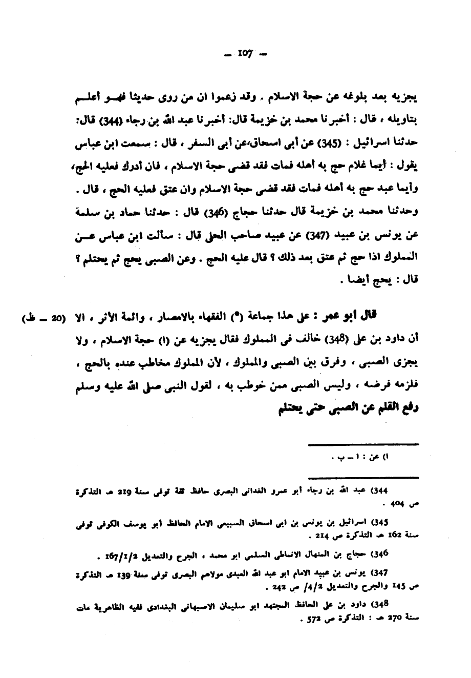 يُجْزِيهِ بَعْدَ بُلُوغِهِ عَنْ حَجَّةِ الْإِسْلَامِ وَقَدْ زَعَمُوا أَنَّ مَنْ رَوَى حَدِيثًا فَهُوَ أَعْلَمُ بِتَأْوِيلِهِ قَالَ أَخْبَرَنَا مُحَمَّدُ بْنُ خُزَيْمَةَ قَالَ أَخْبَرَنَا عَبْدُ اللَّهِ بْنُ رَجَاءٍ قَالَ حَدَّثَنَا إِسْرَائِيلُ عَنْ أَبِي إِسْحَاقَ عَنْ أَبِي السَّفَرِ قَالَ سَمِعْتُ ابْنَ عَبَّاسٍ يَقُولُ أَيُّمَا غُلَامٍ حج به أهله فمات فقد قضى حجة الْإِسْلَامِ فَإِنْ أَدْرَكَ فَعَلَيْهِ الْحَجُّ وَأَيُّمَا عَبْدٍ حج به أهله فمات فقد قضى حجة الْإِسْلَامِ وَإِنْ عُتِقَ فَعَلَيْهِ الْحَجُّ قَالَ وَحَدَّثَنَا مُحَمَّدُ بْنُ خُزَيْمَةَ قَالَ حَدَّثَنَا حَجَّاجٌ قَالَ حَدَّثَنَا حَمَّادُ بْنُ سَلَمَةَ عَنْ يُونُسَ بْنِ عُبَيْدٍ عَنْ عُبَيْدٍ صَاحِبِ الْحُلِيِّ قَالَ سَأَلْتُ ابْنَ عَبَّاسٍ عَنِ الْمَمْلُوكِ إِذَا حَجَّ ثُمَّ عُتِقَ بَعْدَ ذَلِكَ قَالَ عَلَيْهِ الْحَجُّ وَعَنِ الصَّبِيِّ يَحُجُّ ثُمَّ يَحْتَلِمُ قَالَ يَحُجُّ أَيْضًا قَالَ أَبُو عُمَرَ عَلَى هَذَا جَمَاعَةُ الْفُقَهَاءِ بِالْأَمْصَارِ وَأَئِمَّةُ الْأَثَرِ إِلَّا أَنَّ دَاوُدَ بْنَ عَلِيٍّ خَالَفَ فِي الْمَمْلُوكِ فَقَالَ يَجْزِيهِ عَنْ حَجَّةِ الْإِسْلَامِ وَلَا يَجْزِي الصَّبِيَّ وَفَرَّقَ بَيْنَ الصَّبِيِّ وَالْمَمْلُوكِ لِأَنَّ الْمَمْلُوكَ مُخَاطَبٌ عِنْدَهُ بِالْحَجِّ فَلَزِمَهُ فَرْضُهُ وَلَيْسَ الصَّبِيُّ مِمَّنْ خُوطِبَ بِهِ لِقَوْلِ النَّبِيِّ صَلَّى اللَّهُ عَلَيْهِ وَسَلَّمَ رُفِعَ الْقَلَمُ عَنِ الصَّبِيِّ حَتَّى يَحْتَلِمَ