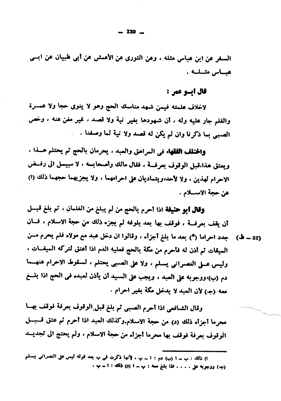 السَّفَرِ عَنِ ابْنِ عَبَّاسٍ مِثْلَهُ وَعَنِ الثَّوْرِيِّ عن الأعمش عن ابي ظبيان عن أبي عَبَّاسٍ مِثْلَهُ قَالَ أَبُو عُمَرَ لَا خِلَافًا عَلِمْتُهُ فِيمَنْ شَهِدَ مَنَاسِكَ الْحَجِّ وَهُوَ لَا يَنْوِي حَجًّا وَلَا عُمْرَةً وَالْقَلَمُ جَارٍ عَلَيْهِ وَلَهُ أَنَّ شُهُودَهَا بِغَيْرِ نِيَّةٍ وَلَا قَصْدٍ غَيْرُ مُغْنٍ عَنْهُ وَخَصَّ الصَّبِيَّ بِمَا ذَكَرْنَا وَإِنْ لَمْ يَكُنْ لَهُ قَصْدٌ وَلَا نِيَّةٌ لِمَا وَصَفْنَا وَاخْتَلَفَ الْفُقَهَاءُ فِي الْمُرَاهِقِ وَالْعَبْدِ يُحْرِمَانِ بِالْحَجِّ ثُمَّ يَحْتَلِمُ هَذَا وَيُعْتَقُ هَذَا قيل الْوُقُوفِ بِعَرَفَةَ فَقَالَ مَالِكٌ وَأَصْحَابُهُ لَا سَبِيلَ إِلَى رَفْضِ الْإِحْرَامِ لِهَذَيْنِ وَلَا لِأَحَدٍ وَيَتَمَادَيَانِ عَلَى إِحْرَامِهِمَا وَلَا يَجْزِيهِمَا حَجُّهُمَا ذَلِكَ عَنْ حَجَّةِ الْإِسْلَامِ وَقَالَ أَبُو حَنِيفَةَ إِذَا أَحْرَمَ بِالْحَجِّ مَنْ لَمْ يَبْلُغْ مِنَ الْغِلْمَانِ ثُمَّ بَلَغَ قَبْلَ أَنْ يَقِفَ بِعَرَفَةَ فَوَقَفَ بِهَا بَعْدَ بُلُوغِهِ لَمْ يُجْزِهِ ذَلِكَ مِنْ حَجَّةِ الاسلام فان جدد احراما بعد ما بَلَغَ أَجْزَأَهُ وَقَالُوا إِنْ دَخَلَ عَبْدٌ مَعَ مَوْلَاهُ فَلَمْ يُحْرِمْ مِنَ الْمِيقَاتِ ثُمَّ أَذِنَ لَهُ فَأَحْرَمَ مِنْ مَكَّةَ بِالْحَجِّ فَعَلَيْهِ الدَّمُ ذا أُعْتِقَ لِتَرْكِهِ الْمِيقَاتَ وَلَيْسَ عَلَى النَّصْرَانِيِّ يُسْلِمُ وَلَا عَلَى الصَّبِيِّ يَحْتَلِمُ لِسُقُوطِ الْإِحْرَامِ عَنْهُمَا دَمٌ وَوُجُوبِهِ عَلَى الْعَبْدِ وَيَجِبُ عَلَى السَّيِّدِ أَنْ يَأْذَنَ لِعَبْدِهِ فِي الْحَجِّ إِذَا بَلَغَ مَعَهُ لِأَنَّ الْعَبْدَ لَا يَدْخُلُ مَكَّةَ بِغَيْرِ إِحْرَامٍ وَقَالَ الشَّافِعِيُّ إِذَا أَحْرَمَ الصَّبِيُّ ثُمَّ بَلَغَ قَبْلَ الْوُقُوفِ بِعَرَفَةَ فَوَقَفَ بِهَا مُحْرِمًا أَجْزَأَهُ ذَلِكَ مِنْ حَجَّةِ الْإِسْلَامِ وَكَذَلِكَ الْعَبْدُ إِذَا أَحْرَمَ ثُمَّ عُتِقَ قَبْلَ الْوُقُوفِ بِعَرَفَةَ بِهَا مُحْرِمًا أَجْزَأَهُ مِنْ حَجَّةِ الْإِسْلَامِ وَلَمْ يَحْتَجْ إِلَى تَجْدِيدِ
