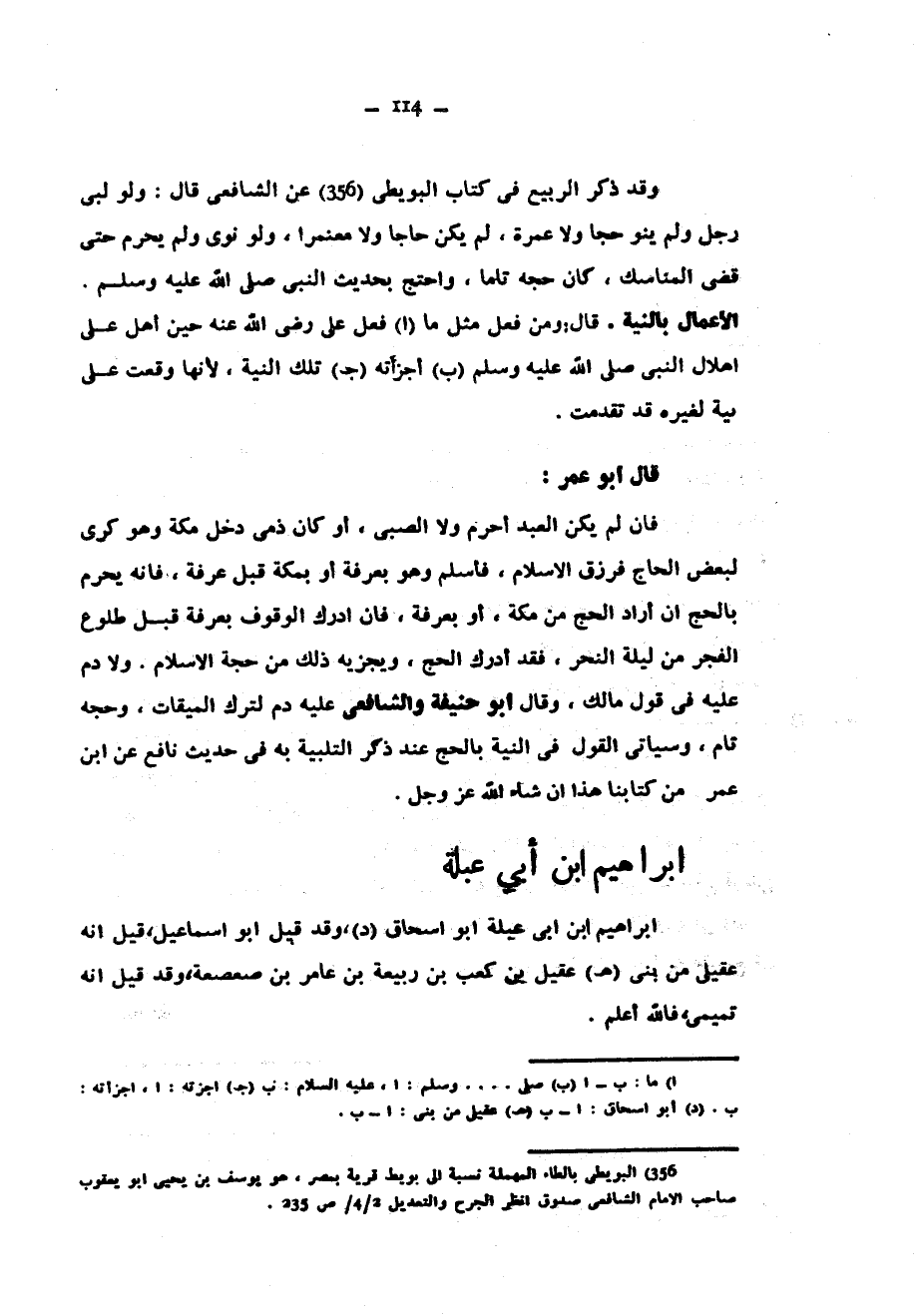 وَقَدْ ذَكَرَ الرَّبِيعُ فِي كِتَابِ الْبُوَيْطِيِّ عَنِ الشَّافِعِيِّ قَالَ وَلَوْ لَبَّى رَجُلٌ وَلَمْ يَنْوِ حَجًّا وَلَا عُمْرَةً لَمْ يَكُنْ حَاجًّا وَلَا مُعْتَمِرًا وَلَوْ نَوَى وَلَمْ يُحْرِمْ حَتَّى قَضَى الْمَنَاسِكَ كَانَ حَجُّهُ تَامًّا وَاحْتَجَّ بِحَدِيثِ النَّبِيِّ صَلَّى اللَّهُ عَلَيْهِ وَسَلَّمَ الْأَعْمَالُ بِالنِّيَّةِ قَالَ وَمَنْ فَعَلَ مِثْلَ مَا فَعَلَ عَلِيٌّ رَضِيَ اللَّهُ عَنْهُ حِينَ أَهَلَّ عَلَى إِهْلَالِ النَّبِيِّ صَلَّى اللَّهُ عَلَيْهِ وَسَلَّمَ أَجْزَأَتْهُ تِلْكَ النِّيَّةُ لِأَنَّهَا وَقَعَتْ عَلَى نِيَّةٍ لِغَيْرِهِ قَدْ تَقَدَّمَتْ قَالَ أَبُو عُمَرَ فَإِنْ لَمْ يَكُنِ الْعَبْدُ أَحْرَمَ وَلَا الصَّبِيُّ أَوْ كَانَ ذِمِّيٌّ دَخَلَ مَكَّةَ وَهُوَ كِرًى لِبَعْضِ الْحَاجِّ فَرُزِقَ الْإِسْلَامَ فَأَسْلَمَ وَهُوَ بِعَرَفَةَ أَوْ بِمَكَّةَ قَبْلَ عَرَفَةَ فَإِنَّهُ يُحْرِمُ بِالْحَجِّ إِنْ أَرَادَ الْحَجَّ مِنْ مَكَّةَ أَوْ بِعَرَفَةَ فَإِنْ أَدْرَكَ الْوُقُوفَ بِعَرَفَةَ قَبْلَ طُلُوعِ الْفَجْرِ مِنْ لَيْلَةِ النَّحْرِ فَقَدْ أَدْرَكَ الْحَجَّ وَيُجْزِيهِ ذَلِكَ مِنْ حَجَّةِ الْإِسْلَامِ وَلَا دَمَ عَلَيْهِ فِي قَوْلِ مَالِكٍ وَقَالَ أَبُو حَنِيفَةَ وَالشَّافِعِيُّ عَلَيْهِ دَمٌ لِتَرْكِ الْمِيقَاتِ وَحَجُّهُ تَامٌّ وَسَيَأْتِي الْقَوْلُ فِي النِّيَّةِ بِالْحَجِّ عِنْدَ ذِكْرِ التَّلْبِيَةِ بِهِ فِي حَدِيثِ نَافِعٍ عَنِ ابْنِ عُمَرَ مِنْ كِتَابِنَا هَذَا إِنْ شَاءَ اللَّهُ عَزَّ وَجَلَّ إبراهيم ابن أبي عبلة ابراهيم ابن أَبِي عَبْلَةَ أَبُو إِسْحَاقَ وَقَدْ قِيلَ أَبُو اسماعيل قيل انه عقيل من بني (هـ) عَقِيلِ بْنِ كَعْبِ بْنِ رَبِيعَةَ بْنِ عَامِرِ بْنِ صَعْصَعَةَ وَقَدْ قِيلَ إِنَّهُ تَمِيمِيٌّ فَاللَّهُ أعلم