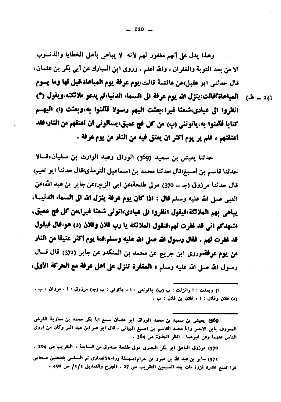 حَدَّثَنَا يَعِيشُ بْنُ سَعِيدٍ الْوَرَّاقُ وَعَبْدُ الْوَارِثِ بْنُ سُفْيَانَ قَالَا حَدَّثَنَا قَاسِمُ بْنُ أَصْبَغَ قَالَ حَدَّثَنَا مُحَمَّدُ بْنُ إِسْمَاعِيلَ التِّرْمِذِيُّ قَالَ حَدَّثَنَا أَبُو نُعَيْمٍ قَالَ حَدَّثَنَا مَرْزُوقٌ مَوْلَى طَلْحَةَ عَنْ أَبِي الزُّبَيْرِ عَنْ جَابِرِ بْنِ عَبْدِ اللَّهِ عَنِ النَّبِيِّ صَلَّى اللَّهُ عَلَيْهِ وَسَلَّمَ قَالَ إِذَا كَانَ يَوْمُ عَرَفَةَ يَنْزِلُ اللَّهُ إِلَى السَّمَاءِ الدُّنْيَا يُبَاهِي بِهِمُ الْمَلَائِكَةَ فَيَقُولُ انْظُرُوا إِلَى عِبَادِي أَتَوْنِي شُعْثًا غُبْرًا مِنْ كُلِّ فَجٍّ عَمِيقٍ أُشْهِدُكُمْ أَنِّي قَدْ غَفَرْتُ لَهُمْ فَتَقُولُ الْمَلَائِكَةُ يَا رَبِّ فُلَانٌ وَفُلَانٌ هُوَ قَالَ فَيَقُولُ قَدْ غَفَرْتُ لَهُمْ فَقَالَ رَسُولُ اللَّهِ صَلَّى اللَّهُ عَلَيْهِ وَسَلَّمَ فَمَا يَوْمٌ أَكْثَرُ عَتِيقًا مِنَ النَّارِ مِنْ يَوْمِ عَرَفَةَ وَرَوَى ابْنُ جُرَيْجٍ عَنْ مُحَمَّدِ بْنِ الْمُنْكَدِرِ عَنْ جَابِرٍ قَالَ قَالَ رَسُولُ اللَّهِ صَلَّى اللَّهُ عَلَيْهِ وَسَلَّمَ الْمَغْفِرَةُ تَنْزِلُ عَلَى أَهْلِ عَرَفَةَ مَعَ الحركة الأولى