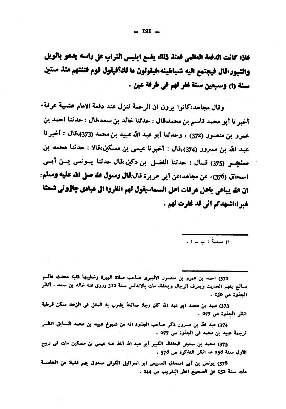 وَقَالَ مُجَاهِدٌ كَانُوا يَرَوْنَ أَنَّ الرَّحْمَةَ تَنْزِلُ عِنْدَ دَفْعَةِ الْإِمَامِ عَشِيَّةَ عَرَفَةَ أَخْبَرَنَا أَبُو مُحَمَّدٍ قَاسِمُ بْنُ مُحَمَّدٍ قَالَ حَدَّثَنَا خَالِدُ بْنُ سَعْدٍ قَالَ حَدَّثَنَا أَحْمَدُ بْنُ عَمْرِو بْنِ مَنْصُورٍ وَحَدَّثَنَا أَبُو عَبْدِ اللَّهِ عُبَيْدُ بْنُ مُحَمَّدٍ قَالَ أَخْبَرَنَا عَبْدُ اللَّهِ بْنُ مَسْرُورٍ قَالَ أَخْبَرَنَا عِيسَى بْنُ مِسْكِينٍ قَالَا حَدَّثَنَا مُحَمَّدُ بْنُ سِنْجِرٍ قَالَ حَدَّثَنَا الْفَضْلُ بْنُ دُكَيْنٍ قَالَ حَدَّثَنَا يُونُسُ بْنُ أَبِي إِسْحَاقَ عَنْ مُجَاهِدٍ عَنْ أَبِي هُرَيْرَةَ قَالَ قَالَ رَسُولُ اللَّهِ صَلَّى الله عليه وسلم إن اللَّهَ يُبَاهِي بِأَهْلِ عَرَفَاتٍ أَهْلَ السَّمَاءِ يَقُولُ لهم انظروا إلى عبادي جاؤوني شُعْثًا غُبْرًا أُشْهِدُكُمْ أَنِّي قَدْ غَفَرْتُ لَهُمْ