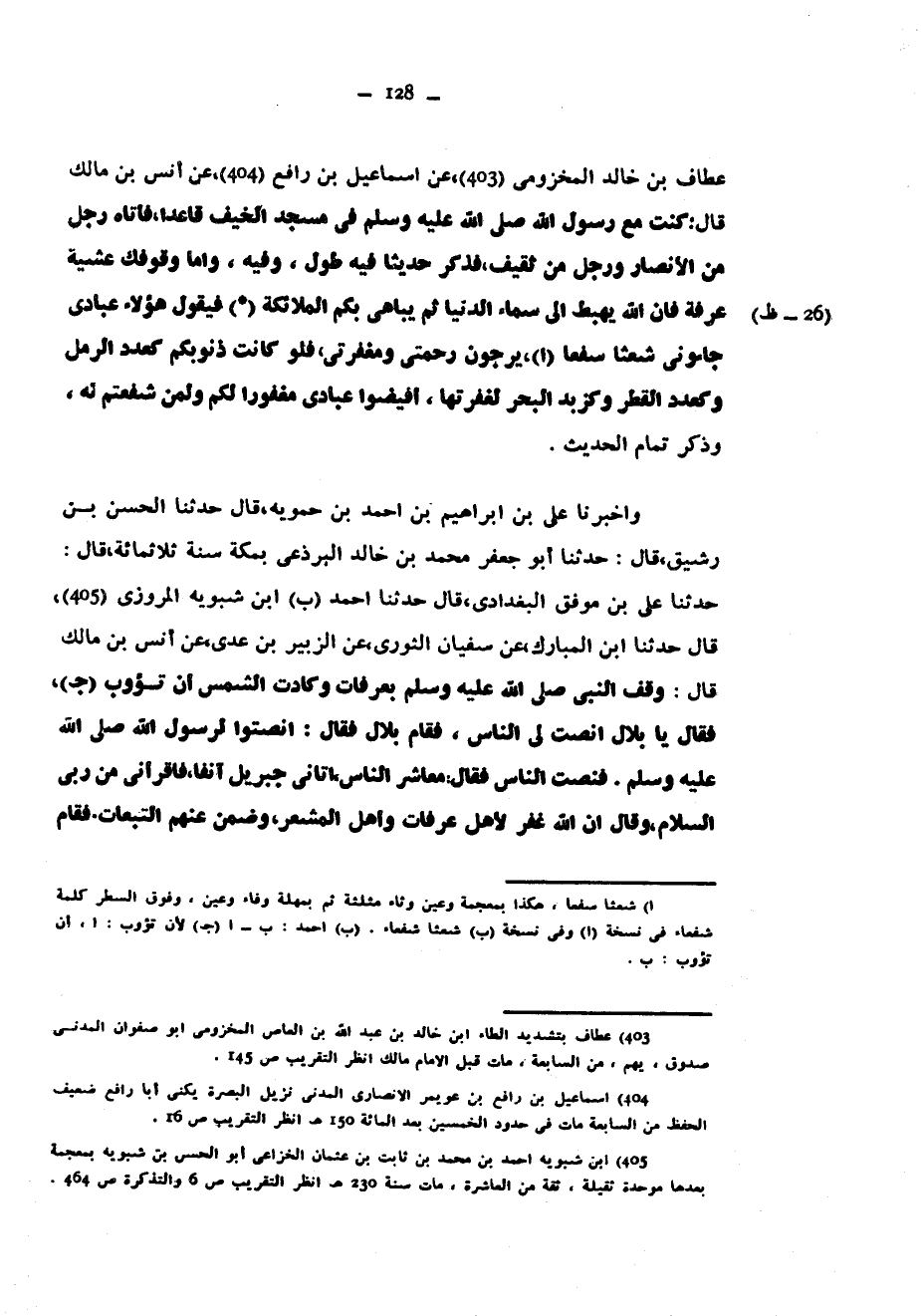 عَطَّافُ بْنُ خَالِدٍ الْمَخْزُومِيُّ عَنْ إِسْمَاعِيلَ بْنِ رَافِعٍ عَنْ أَنَسِ بْنِ مَالِكٍ قَالَ كُنْتُ مَعَ رَسُولِ اللَّهِ صَلَّى اللَّهُ عَلَيْهِ وَسَلَّمَ فِي مَسْجِدِ الْخَيْفِ قَاعِدًا فَأَتَاهُ رَجُلٌ مِنَ الْأَنْصَارِ وَرَجُلٌ مِنْ ثَقِيفٍ فَذَكَرَ حَدِيثًا فِيهِ طُولٌ وَفِيهِ وَأَمَّا وُقُوفُكَ عَشِيَّةَ عَرَفَةَ فَإِنَّ اللَّهَ يَهْبِطُ إِلَى سَمَاءِ الدُّنْيَا ثُمَّ يُبَاهِي بِكُمُ الْمَلَائِكَةَ فَيَقُولُ هَؤُلَاءِ عِبَادِي جَاءُونِي شُعْثًا سفعا يرجون رحمتي ومغفرتي فلو كانت ذونوبكم كَعَدَدِ الرَّمْلِ وَكَعَدَدِ الْقَطْرِ وَكَزَبَدِ الْبَحْرِ لَغَفَرْتُهَا أَفِيضُوا عِبَادِي مَغْفُورًا لَكُمْ وَلِمَنْ شَفَعْتُمْ لَهُ وَذَكَرَ تَمَامَ الْحَدِيثِ وَأَخْبَرَنَا عَلِيُّ بْنُ إِبْرَاهِيمَ بْنِ أَحْمَدَ بْنِ حَمُّوَيْهِ قَالَ حَدَّثَنَا الْحَسَنُ بْنُ رَشِيقٍ قَالَ حَدَّثَنَا أَبُو جَعْفَرٍ مُحَمَّدُ بْنُ خَالِدٍ الْبَرْذَعِيُّ بِمَكَّةَ سَنَةَ ثَلَاثِمِائَةٍ قَالَ حدنا عَلِيُّ بْنُ مُوَفَّقٍ الْبَغْدَادِيُّ قَالَ حَدَّثَنَا أَحْمَدُ ابن شَبُّوَيْهِ الْمَرْوَزِيُّ قَالَ حَدَّثَنَا ابْنُ الْمُبَارَكِ عَنْ سُفْيَانَ الثَّوْرِيِّ عَنِ الزُّبَيْرِ بْنِ عَدِيٍّ عَنْ أَنَسِ بْنِ مَالِكٍ قَالَ وَقَفَ النَّبِيُّ صَلَّى اللَّهُ عَلَيْهِ وَسَلَّمَ بِعَرَفَاتٍ وَكَادَتِ الشَّمْسُ أَنْ تؤوب فَقَالَ يَا بِلَالُ أَنْصِتْ لِيَ النَّاسَ فَقَامَ بِلَالُ فَقَالَ أَنْصِتُوا لِرَسُولِ اللَّهِ صَلَّى اللَّهُ عَلَيْهِ وَسَلَّمَ فَنَصَتَ النَّاسُ فَقَالَ مَعَاشِرَ النَّاسِ أَتَانِي جِبْرِيلُ آنِفًا فَأَقْرَأَنِي مَنْ رَبِّيَ السَّلَامَ وَقَالَ إِنَّ اللَّهَ غَفَرَ لِأَهْلِ عَرَفَاتٍ وَأَهْلِ الْمَشْعَرِ وَضَمِنَ عَنْهُمُ التَّبِعَاتِ فَقَامَ