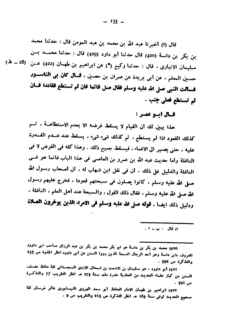 قَالَ أَخْبَرَنَا عَبْدُ اللَّهِ بْنُ مُحَمَّدِ بْنِ عَبْدِ الْمُومِنِ قَالَ حَدَّثَنَا مُحَمَّدُ بْنُ بَكْرِ بْنِ دَاسَةَ قَالَ حَدَّثَنَا أَبُو دَاوُدَ قَالَ حَدَّثَنَا مُحَمَّدُ بْنُ سُلَيْمَانَ الْأَنْبَارِيُّ قَالَ حَدَّثَنَا وَكِيعٌ عَنْ إِبْرَاهِيمَ بْنِ طَهْمَانَ عَنْ حُسَيْنٍ الْمُعَلِّمِ عَنْ أَبِي بُرَيْدَةَ عَنْ عِمْرَانَ بْنِ حُصَيْنٍ قَالَ كَانَ بِي النَّاسُورُ فَسَأَلْتُ النَّبِيَّ صَلَّى اللَّهُ عَلَيْهِ وَسَلَّمَ فَقَالَ صَلِّ قَائِمًا فَإِنْ لَمْ تَسْتَطِعْ فَقَاعِدًا فَإِنْ لَمْ تَسْتَطِعْ فَعَلَى جَنْبٍ قَالَ أَبُو عُمَرَ هَذَا يُبَيِّنُ لَكَ أَنَّ الْقِيَامَ لَا يَسْقُطُ فَرْضُهُ إِلَّا بِعَدَمِ الِاسْتِطَاعَةِ ثُمَّ كَذَلِكَ الْقُعُودُ إِذَا لَمْ يَسْتَطِعْ ثُمَّ كَذَلِكَ شَيْءٌ شَيْءٌ يَسْقُطُ عِنْدَ عَدَمِ الْقُدْرَةِ عَلَيْهِ حَتَّى يَصِيرَ إِلَى الْإِغْمَاءِ فَيَسْقُطُ جَمِيعُ ذَلِكَ وَهَذَا كُلُّهُ فِي الْفَرْضِ لَا فِي النَّافِلَةِ وَأَمَّا حَدِيثُ عَبْدِ اللَّهِ بْنِ عَمْرِو بْنِ الْعَاصِي فِي هَذَا الْبَابِ فَإِنَّمَا هُوَ فِي النَّافِلَةِ وَالدَّلِيلُ عَلَى ذَلِكَ أَنَّ فِي نَقْلِ ابْنِ شِهَابٍ لَهُ أَنَّ أَصْحَابَ رَسُولِ اللَّهِ صَلَّى اللَّهُ عَلَيْهِ وسلم كَانُوا يُصَلُّونَ فِي سُبْحَتِهِمْ قُعُودًا فَخَرَجَ عَلَيْهِمْ رَسُولُ اللَّهِ صَلَّى اللَّهُ عَلَيْهِ وَسَلَّمَ فقال ذَلِكَ الْقَوْلَ وَالسُّبْحَةُ عِنْدَ أَهْلِ الْعِلْمِ النَّافِلَةُ وَدَلِيلُ ذَلِكَ أَيْضًا قَوْلُهُ صَلَّى اللَّهُ عَلَيْهِ وَسَلَّمَ في الامراء الذين يوخرون الصلاة