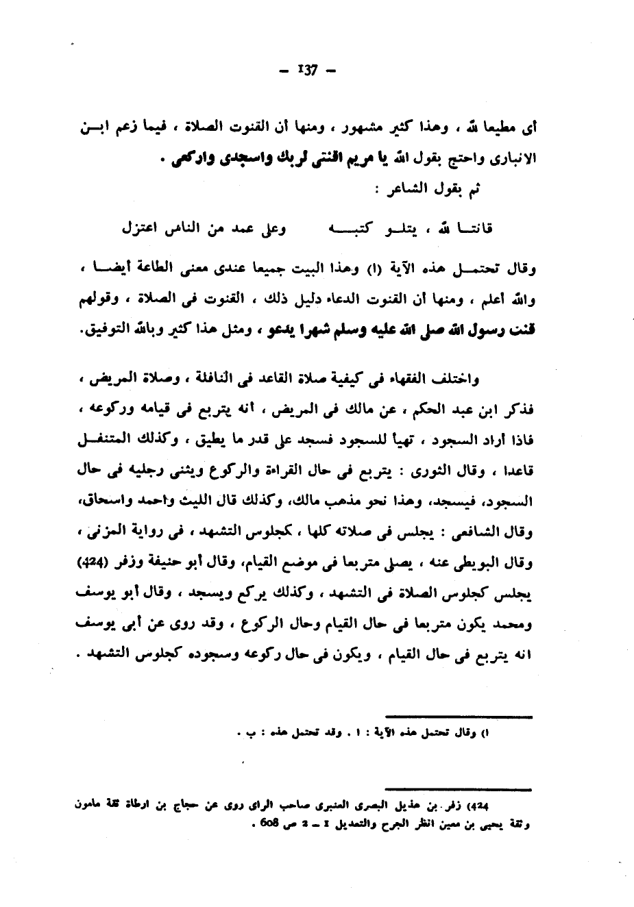 أَيْ مُطِيعًا لِلَّهِ وَهَذَا كَثِيرٌ مَشْهُورٌ وَمِنْهَا أَنَّ الْقُنُوتَ الصَّلَاةُ فِيمَا زَعَمَ ابْنُ الْأَنْبَارِيِّ واحتج بقول الله يا مريم اقْنُتِي لِرَبِّكِ وَاسْجُدِي وَارْكَعِي ثُمَّ بِقَوْلِ الشَّاعِرِ ... قَانِتًا لِلَّهِ يَتْلُو كُتُبَهُ ... وَعَلَى عَمْدٍ مِنَ النَّاسِ اعْتَزَلَ ... وَقَالَ تَحْتَمِلُ هَذِهِ الْآيَةُ وَهَذَا الْبَيْتُ جَمِيعًا عِنْدِي مَعْنَى الطَّاعَةِ أَيْضًا وَاللَّهُ أَعْلَمُ وَمِنْهَا أَنَّ الْقُنُوتَ الدُّعَاءُ دَلِيلُ ذَلِكَ الْقُنُوتُ فِي الصَّلَاةِ وَقَوْلُهُمْ قَنَتَ رَسُولُ اللَّهِ صَلَّى اللَّهُ عَلَيْهِ وَسَلَّمَ شَهْرًا يَدْعُو وَمِثْلُ هَذَا كَثِيرٌ وَبِاللَّهِ التَّوْفِيقُ وَاخْتَلَفَ الْفُقَهَاءُ فِي كَيْفِيَّةِ صَلَاةِ الْقَاعِدِ فِي النَّافِلَةِ وَصَلَاةِ الْمَرِيضِ فَذَكَرَ ابْنُ عَبْدِ الْحَكَمِ عَنْ مَالِكٍ فِي الْمَرِيضِ أَنَّهُ يَتَرَبَّعُ فِي قِيَامِهِ وَرُكُوعِهِ فَإِذَا أَرَادَ السُّجُودَ تَهَيَّأَ لِلسُّجُودِ فَسَجَدَ عَلَى قَدْرِ مَا يُطِيقُ وَكَذَلِكَ الْمُتَنَفِّلُ قَاعِدًا وَقَالَ الثَّوْرِيُّ يَتَرَبَّعُ فِي حَالِ الْقِرَاءَةِ وَالرُّكُوعِ وَيَثْنِي رِجْلَيْهِ فِي حَالِ السُّجُودِ فَيَسْجُدُ وَهَذَا نَحْوَ مَذْهَبِ مَالِكٍ وَكَذَلِكَ قَالَ اللَّيْثُ وَأَحْمَدُ وَإِسْحَاقُ وَقَالَ الشَّافِعِيُّ يَجْلِسُ فِي صَلَاتِهِ كُلِّهَا كَجُلُوسِ التَّشَهُّدِ فِي رِوَايَةِ الْمُزَنِيِّ وَقَالَ الْبُوَيْطِيُّ عَنْهُ يُصَلِّي مُتَرَبِّعًا فِي مَوْضِعِ الْقِيَامِ وَقَالَ أَبُو حَنِيفَةَ وَزُفَرُ يَجْلِسُ كَجُلُوسِ الصَّلَاةِ فِي التَّشَهُّدِ وَكَذَلِكَ يَرْكَعُ وَيَسْجُدُ وَقَالَ أَبُو يُوسُفَ وَمُحَمَّدٌ يَكُونُ مُتَرَبِّعًا فِي حَالِ الْقِيَامِ وَحَالِ الرُّكُوعِ وَقَدْ رُوِيَ عَنْ أَبِي يُوسُفَ أَنَّهُ يَتَرَبَّعُ فِي حَالِ الْقِيَامِ وَيَكُونُ فِي حَالِ رُكُوعِهِ وَسُجُودِهِ كجلوس التشهد