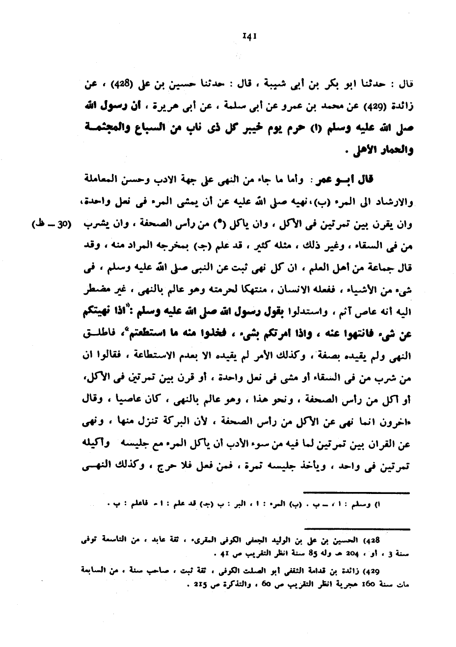 قَالَ حَدَّثَنَا أَبُو بَكْرِ بْنُ أَبِي شَيْبَةَ قَالَ حَدَّثَنَا حُسَيْنُ بْنُ عَلِيٍّ عَنْ زَائِدَةَ عَنْ مُحَمَّدِ بْنِ عَمْرٍو عَنْ أَبِي سَلَمَةَ عَنْ أَبِي هُرَيْرَةَ أَنَّ رَسُولَ اللَّهِ صَلَّى اللَّهُ عَلَيْهِ وَسَلَّمَ حَرَّمَ يَوْمَ خَيْبَرَ كُلَّ ذِي نَابٍ مِنَ السِّبَاعِ وَالْمُجَثَّمَةَ وَالْحِمَارَ الْأَهْلِيَّ قَالَ أَبُو عُمَرَ وَأَمَّا مَا جَاءَ مِنَ النَّهْيِ عَلَى جِهَةِ الْأَدَبِ وَحُسْنِ الْمُعَامَلَةِ وَالْإِرْشَادِ إِلَى الْمَرْءِ نَهْيُهُ صَلَّى اللَّهُ عَلَيْهِ وَسَلَّمَ عَنْ أَنْ يَمْشِيَ الْمَرْءُ فِي نَعْلٍ وَاحِدَةٍ وَأَنْ يَقْرِنَ بَيْنَ تَمْرَتَيْنِ فِي الْأَكْلِ وَأَنْ يأكل من أس الصَّحْفَةِ وَأَنْ يَشْرَبَ مِنْ فِيِّ السِّقَاءِ وَغَيْرُ ذَلِكَ مِثْلُهُ كَثِيرٌ قَدْ عُلِمَ بِمَخْرَجِهِ الْمُرَادُ مِنْهُ وَقَدْ قَالَ جَمَاعَةٌ مِنْ أَهْلِ الْعِلْمِ إِنَّ كُلَّ نَهْيٍ ثَبَتَ عَنِ النَّبِيِّ صَلَّى اللَّهُ عَلَيْهِ وَسَلَّمَ فِي شَيْءٍ مِنَ الْأَشْيَاءِ فَفَعَلَهُ الْإِنْسَانُ مُنْتَهِكًا لِحُرْمَتِهِ وَهُوَ عَالِمٌ بِالنَّهْيِ غي مُضْطَرٍّ إِلَيْهِ أَنَّهُ عَاصٍ آثِمٌ وَاسْتَدَلُّوا بِقَوْلِ رَسُولِ اللَّهِ صَلَّى اللَّهُ عَلَيْهِ وَسَلَّمَ إِذَا نَهَيْتُكُمْ عَنْ شَيْءٍ فَانْتَهُوا عَنْهُ وَإِذَا أَمَرْتُكُمْ بشيء فخذوا عنه مَا اسْتَطَعْتُمْ فَأَطْلَقَ النَّهْيَ وَلَمْ يُقَيِّدْهُ بِصِفَةٍ وَكَذَلِكَ الْأَمْرُ لَمْ يُقَيِّدْهُ إِلَّا بِعَدَمِ الِاسْتِطَاعَةِ فَقَالُوا إِنَّ مَنْ شَرِبَ مِنْ فِيِّ السِّقَاءِ أَوْ مَشَى فِي نَعْلٍ وَاحِدَةٍ أَوْ قَرَنَ بَيْنَ تَمْرَتَيْنِ فِي الْأَكْلِ أَوْ أَكَلَ مِنْ رَأْسِ الصَّحْفَةِ وَنَحْوُ هَذَا وَهُوَ عَالِمٌ بِالنَّهْيِ كَانَ عَاصِيًا وَقَالَ آخَرُونَ إِنَّمَا نَهَى عَنِ الْأَكْلِ مِنْ رَأْسِ الصَّحْفَةِ لِأَنَّ الْبَرَكَةَ تَنَزَّلُ مِنْهَا وَنَهَى عَنِ الْقِرَانِ بَيْنَ تَمْرَتَيْنِ لِمَا فِيهِ مِنْ سُوءِ الْأَدَبِ أَنْ يَأْكُلَ الْمَرْءُ مَعَ جَلِيسِهِ وَأَكِيلِهِ تَمْرَتَيْنِ فِي وَاحِدٍ وَيَأْخُذُ جَلِيسُهُ تَمْرَةً فَمَنْ فَعَلَ فَلَا حَرَجَ وَكَذَلِكَ النهى