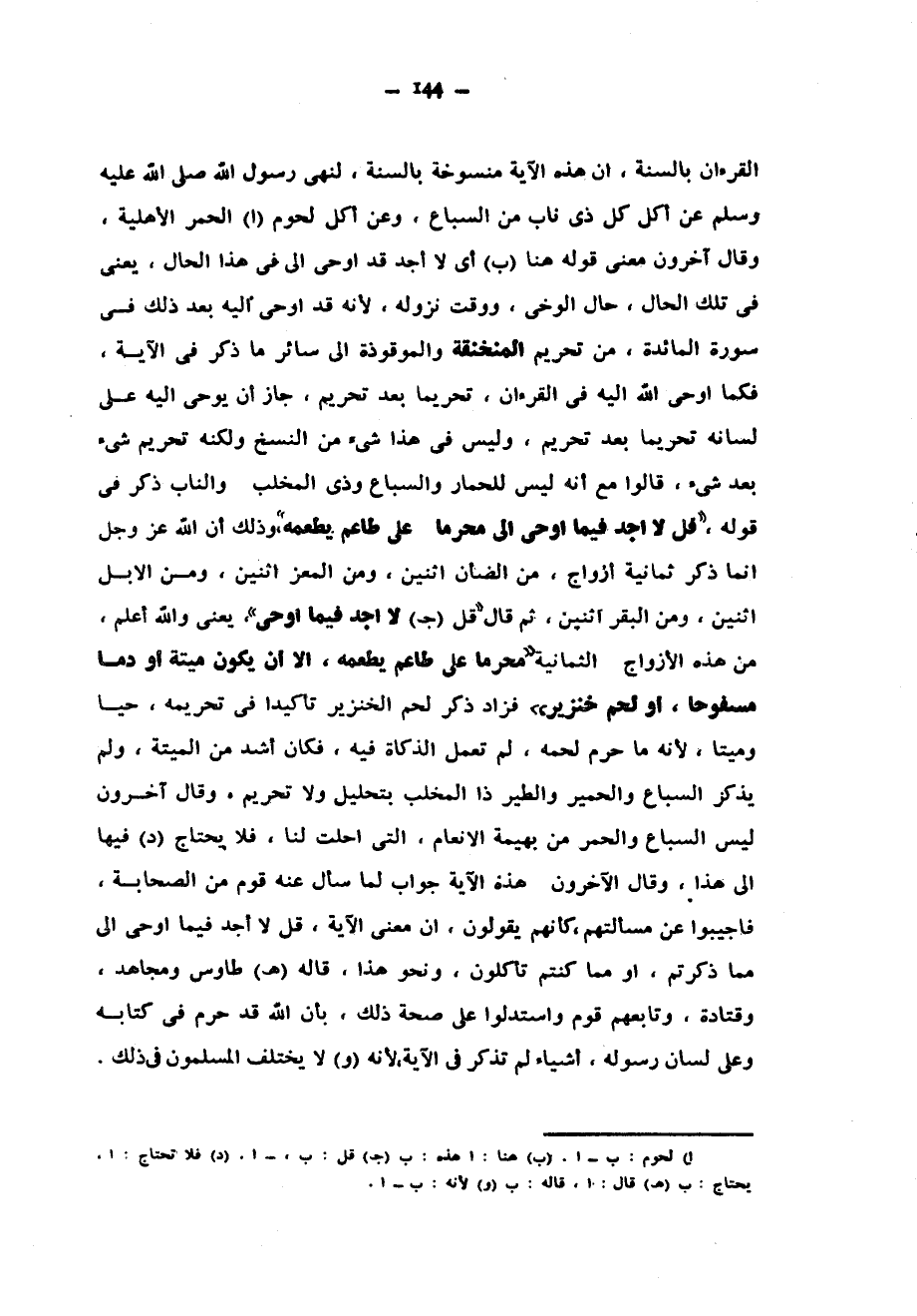 القرءان بِالسُّنَّةِ إِنَّ هَذِهِ الْآيَةَ مَنْسُوخَةٌ بِالسُّنَّةِ لِنَهْيِ رَسُولِ اللَّهِ صَلَّى اللَّهُ عَلَيْهِ وَسَلَّمَ عَنْ أَكْلِ كُلِّ ذِي نَابٍ مِنَ السِّبَاعِ وَعَنْ أَكْلِ لُحُومِ الْحُمُرِ الْأَهْلِيَّةِ وَقَالَ آخَرُونَ مَعْنَى قَوْلِهِ هُنَا أَيْ لَا أَجِدُ قَدْ أُوحِيَ إِلَيَّ فِي هَذَا الْحَالِ يَعْنِي فِي تِلْكَ الحال حال الوخي وَوَقْتَ نُزُولِهِ لِأَنَّهُ قَدْ أُوحِيَ إِلَيْهِ بَعْدَ ذَلِكَ فِي سُورَةِ الْمَائِدَةِ مِنْ تَحْرِيمِ الْمُنْخَنِقَةِ وَالْمَوْقُوذَةِ إِلَى سَائِرِ مَا ذُكِرَ فِي الْآيَةِ فكما اوحى الله اليه في القرءان تَحْرِيمًا بَعْدَ تَحْرِيمٍ جَازَ أَنَّ يُوحِيَ إِلَيْهِ عَلَى لِسَانِهِ تَحْرِيمًا بَعْدَ تَحْرِيمٍ وَلَيْسَ فِي هَذَا شَيْءٌ مِنَ النَّسْخِ وَلَكِنَّهُ تَحْرِيمُ شَيْءٍ بَعْدَ شَيْءٍ قَالُوا مَعَ أَنَّهُ لَيْسَ لِلْحِمَارِ وَالسِّبَاعِ وَذِي الْمِخْلَبِ وَالنَّابِ ذِكْرٌ فِي قَوْلِهِ قل لا اجد فيما أُوحِيَ إِلَيَّ مُحَرَّمًا عَلَى طَاعِمٍ يَطْعَمُهُ وَذَلِكَ أَنَّ اللَّهَ عَزَّ وَجَلَّ إِنَّمَا ذَكَرَ ثَمَانِيَةَ أَزْوَاجٍ مِنَ الضَّأْنِ اثْنَيْنِ وَمِنَ الْمَعْزِ اثْنَيْنِ وَمِنَ الْإِبِلِ اثْنَيْنِ وَمِنَ الْبَقَرِ اثْنَيْنِ ثُمَّ قال قل لا اجد فيما أُوحِيَ يَعْنِي وَاللَّهُ أَعْلَمُ مِنْ هَذِهِ الْأَزْوَاجِ الثَّمَانِيَةِ مُحَرَّمًا عَلَى طَاعِمٍ يَطْعَمُهُ إِلَّا أَنْ يَكُونَ مَيْتَةً أَوْ دَمًا مَسْفُوحًا أَوْ لَحْمَ خِنْزِيرٍ فَزَادَ ذِكْرَ لَحْمِ الْخِنْزِيرِ تَأْكِيدًا فِي تَحْرِيمِهِ حَيًّا وَمَيِّتًا لِأَنَّهُ مَا حُرِّمَ لَحْمُهُ لَمْ تَعْمَلِ الذَّكَاةُ فِيهِ فَكَانَ أَشَدَّ مِنَ الميتة ولم يذكر السباع والحمير والطير ذات الْمِخْلَبِ بِتَحْلِيلٍ وَلَا تَحْرِيمٍ وَقَالَ آخَرُونَ لَيْسَ السِّبَاعُ وَالْحُمُرُ مِنْ بَهِيمَةِ الْأَنْعَامِ الَّتِي أُحِلَّتْ لَنَا فَلَا يُحْتَاجُ فِيهَا إِلَى هَذَا وَقَالَ الْآخَرُونَ هَذِهِ الْآيَةُ جَوَابٌ لِمَا سَأَلَ عَنْهُ قَوْمٌ مِنَ الصَّحَابَةِ فَأُجِيبُوا عَنْ مَسْأَلَتِهِمْ كَأَنَّهُمْ يَقُولُونَ إِنَّ مَعْنَى الْآيَةِ قُلْ لَا أَجِدُ فِيمَا أُوحِيَ إِلَيَّ مِمَّا ذَكَرْتُمْ أَوْ مِمَّا كنتم تأكلون ونحو هذا قاله (هـ) طَاوُسٌ وَمُجَاهِدٌ وَقَتَادَةُ وَتَابَعَهُمْ قَوْمٌ وَاسْتَدَلُّوا عَلَى صِحَّةِ ذَلِكَ بِأَنَّ اللَّهَ قَدْ حَرَّمَ فِي كِتَابِهِ وَعَلَى لِسَانِ رَسُولِهِ أَشْيَاءَ لَمْ تُذْكَرْ فِي الْآيَةِ لِأَنَّهُ لَا يَخْتَلِفُ الْمُسْلِمُونَ فِي ذلك