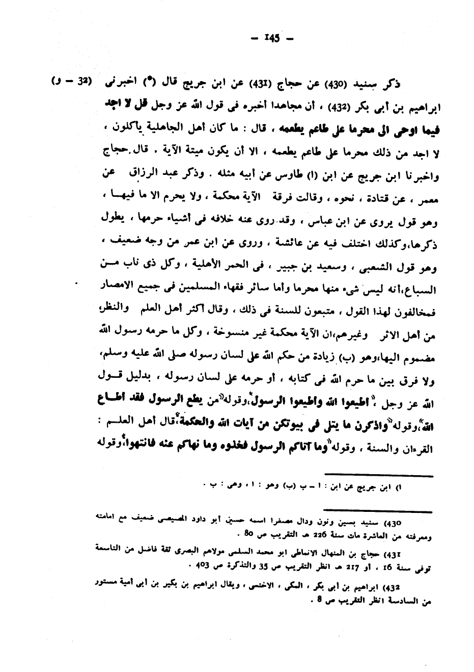 ذَكَرَ سُنَيْدٌ عَنْ حَجَّاجٍ عَنِ ابْنِ جُرَيْجٍ قَالَ أَخْبَرَنِي إِبْرَاهِيمُ بْنُ أَبِي بَكْرٍ أَنَّ مُجَاهِدًا أَخْبَرَهُ فِي قَوْلِ اللَّهِ عَزَّ وَجَلَّ قُلْ لَا أَجِدُ فيما أُوحِيَ إِلَيَّ مُحَرَّمًا عَلَى طَاعِمٍ يَطْعَمُهُ قَالَ مَا كَانَ أَهْلُ الْجَاهِلِيَّةِ يَأْكُلُونَ لَا أَجِدُ مِنْ ذَلِكَ مُحَرَّمًا عَلَى طَاعِمٍ يَطْعَمُهُ إِلَّا أَنْ يَكُونَ مَيْتَةً الْآيَةَ قَالَ حَجَّاجٌ وَأَخْبَرَنَا ابْنُ جُرَيْجٍ عَنِ ابْنِ طَاوُسٍ عَنْ أَبِيهِ مِثْلَهُ وَذَكَرَ عَبْدُ الرَّزَّاقِ عَنْ مَعْمَرٍ عَنْ قَتَادَةَ نَحْوَهُ وَقَالَتْ فِرْقَةٌ الْآيَةُ مُحْكَمَةٌ وَلَا يَحْرُمُ إِلَّا مَا فِيهَا وَهُوَ قَوْلٌ يُرْوَى عَنِ ابْنِ عَبَّاسٍ وَقَدْ رُوِيَ عَنْهُ خِلَافُهُ فِي أَشْيَاءَ حَرَّمَهَا يَطُوْلُ ذِكْرُهَا وَكَذَلِكَ اخْتُلِفَ فِيهِ عَنْ عَائِشَةَ وَرُوِيَ عَنِ ابْنِ عُمَرَ مِنْ وَجْهٍ ضَعِيفٍ وَهُوَ قَوْلُ الشَّعْبِيِّ وَسَعِيدِ بْنِ جُبَيْرٍ فِي الْحُمُرِ الْأَهْلِيَّةِ وَكُلِّ ذِي نَابٍ مِنَ السِّبَاعِ أَنَّهُ لَيْسَ شَيْءٌ مِنْهَا مُحَرَّمًا وَأَمَّا سَائِرُ فُقَهَاءِ الْمُسْلِمِينَ فِي جَمِيعِ الْأَمْصَارِ فَمُخَالِفُونَ لِهَذَا الْقَوْلِ مُتَّبِعُونَ لِلسُّنَّةِ فِي ذَلِكَ وَقَالَ أَكْثَرُ أَهْلِ الْعِلْمِ وَالنَّظَرِ مَنْ أَهْلِ الْأَثَرِ وَغَيْرِهِمْ إِنَّ الْآيَةَ مَحْكَمَةٌ غَيْرُ مَنْسُوخَةٍ وَكُلُّ مَا حَرَّمَهُ رَسُولُ اللَّهِ مَضْمُومٌ إِلَيْهَا وَهُوَ زِيَادَةٌ مِنْ حُكْمِ اللَّهِ عَلَى لِسَانِ رَسُولِهِ صَلَّى اللَّهُ عَلَيْهِ وَسَلَّمَ وَلَا فَرْقَ بَيْنَ مَا حَرَّمَ اللَّهُ فِي كِتَابِهِ أَوْ حَرَّمَهُ عَلَى لِسَانِ رَسُولِهِ بِدَلِيلِ قَوْلِ اللَّهِ عَزَّ وَجَلَّ أَطِيعُوا اللَّهَ وَأَطِيعُوا الرَّسُولَ وَقَوْلِهِ مَنْ يُطِعِ الرَّسُولَ فَقَدْ أَطَاعَ اللَّهَ وَقَوْلِهِ وَاذْكُرْنَ مَا يُتْلَى فِي بُيُوتِكُنَّ مِنْ آيَاتِ الله والحكمة قال أهل العلم القرءان وَالسُّنَّةُ وَقَوْلِهِ وَمَا آتَاكُمُ الرَّسُولُ فَخُذُوهُ وَمَا نَهَاكُمْ عَنْهُ فَانْتَهُوا وَقَوْلِهِ