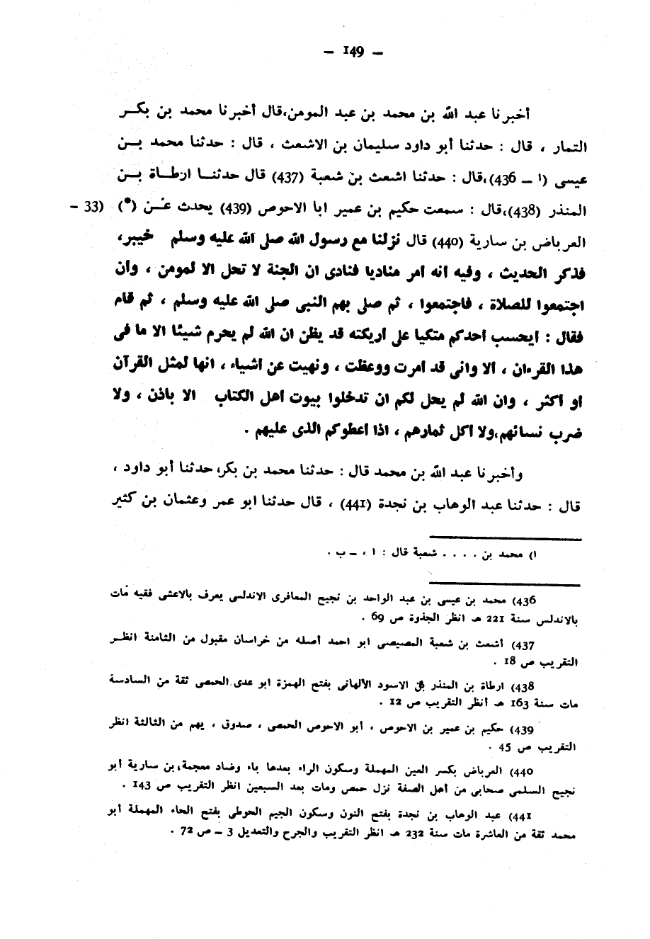 أَخْبَرَنَا عَبْدُ اللَّهِ بْنُ مُحَمَّدِ بْنِ عَبْدِ المومن قَالَ أَخْبَرَنَا مُحَمَّدُ بْنُ بَكْرٍ التَّمَّارُ قَالَ حَدَّثَنَا أَبُو دَاوُدَ سُلَيْمَانُ بْنُ الْأَشْعَثِ قَالَ حَدَّثَنَا مُحَمَّدُ بْنُ عِيسَى قَالَ حَدَّثَنَا أَشْعَثُ بْنُ شُعْبَةَ قَالَ حَدَّثَنَا أَرْطَأَةُ بْنُ الْمُنْذِرِ قَالَ سَمِعْتُ حَكِيمَ بْنَ عُمَيْرٍ أَبَا الْأَحْوَصِ يُحَدِّثُ عَنِ الْعِرْبَاضِ بْنِ سَارِيَةَ قَالَ نَزَلْنَا مَعَ رَسُولِ اللَّهِ صَلَّى اللَّهُ عَلَيْهِ وَسَلَّمَ خَيْبَرَ فَذَكَرَ الْحَدِيثَ وَفِيهِ أَنَّهُ أَمَرَ مُنَادِيًا فَنَادَى إِنَّ الْجَنَّةَ لَا تَحِلُّ إِلَّا لِمُؤْمِنٍ وَأَنِ اجْتَمِعُوا لِلصَّلَاةِ فَاجْتَمَعُوا ثُمَّ صَلَّى بِهِمُ النَّبِيُّ صَلَّى اللَّهُ عَلَيْهِ وَسَلَّمَ ثُمَّ قَامَ فقال أيحسب أحدكم متكيا عَلَى أَرِيكَتِهِ قَدْ يَظُنُّ أَنَّ اللَّهَ لَمْ يحرم شيئا الا ما في هذا القرءان أَلَا وَإِنِّي قَدْ أَمَرْتُ وَوَعَظْتُ وَنَهَيْتُ عَنْ أَشْيَاءَ إِنَّهَا لَمِثْلُ الْقُرْآنِ أَوْ أَكْثَرُ وَإِنَّ اللَّهَ لَمْ يُحِلَّ لَكُمْ أَنْ تَدْخُلُوا بُيُوتَ أَهْلِ الْكِتَابِ إِلَّا بِإِذْنٍ وَلَا ضَرْبَ نِسَائِهِمْ وَلَا أَكْلَ ثِمَارِهِمْ إِذَا أَعْطَوْكُمُ الَّذِي عَلَيْهِمْ وَأَخْبَرَنَا عَبْدُ اللَّهِ بْنُ مُحَمَّدٍ قَالَ حَدَّثَنَا مُحَمَّدُ بْنُ بَكْرٍ حَدَّثَنَا أَبُو دَاوُدَ قَالَ حَدَّثَنَا عَبْدُ الْوَهَّابِ بْنُ نَجْدَةَ قَالَ حَدَّثَنَا ابو عمر وعثمان بن كثير