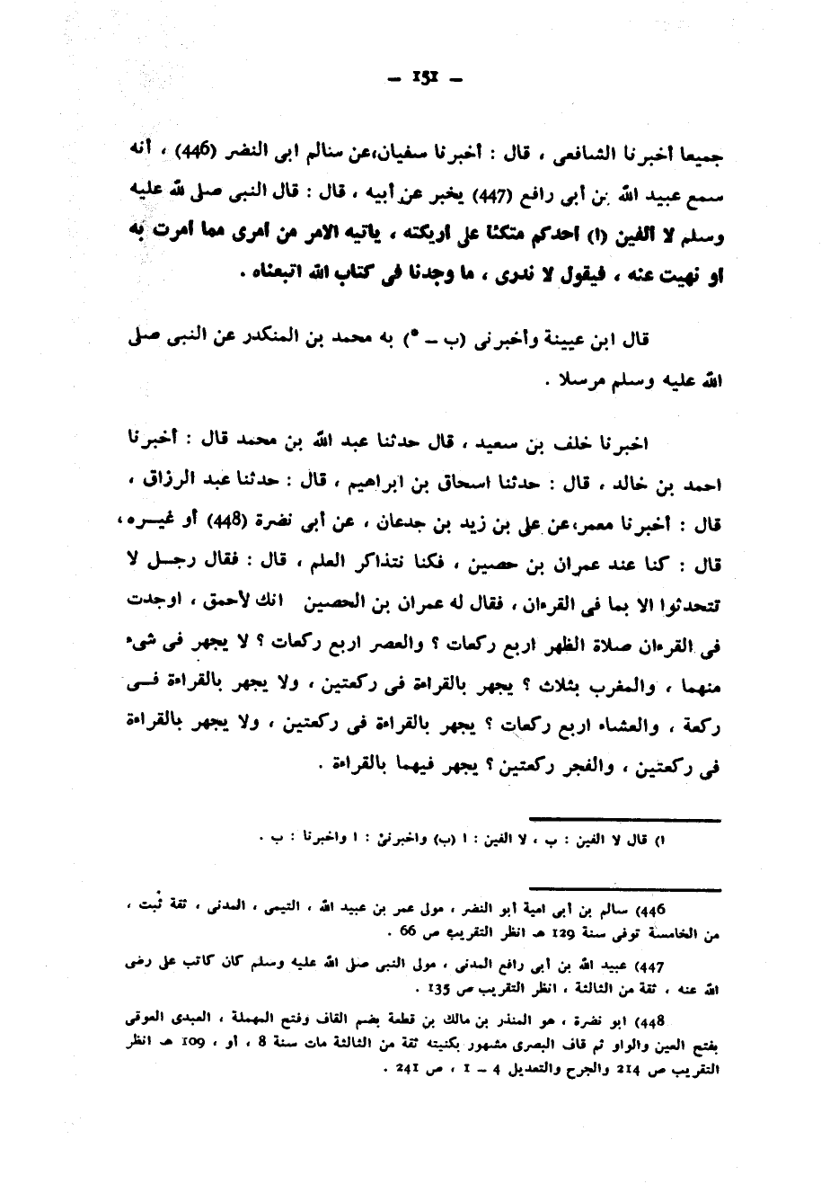 جَمِيعًا أَخْبَرَنَا الشَّافِعِيُّ قَالَ أَخْبَرَنَا سُفْيَانُ عَنْ سَالِمٍ أَبِي النَّضْرِ أَنَّهُ سَمِعَ عُبَيْدَ اللَّهِ بْنَ أَبِي رَافِعٍ يُخْبِرُ عَنْ أَبِيهِ قَالَ قَالَ النَّبِيُّ صَلَّى اللَّهُ عَلَيْهِ وَسَلَّمَ لَا أُلْفِيَنَّ أَحَدَكُمْ مُتَّكِئًا عَلَى أَرِيكَتِهِ يَأْتِيهِ الْأَمْرُ من أوي مِمَّا أَمَرْتُ بِهِ أَوْ نَهَيْتُ عَنْهُ فَيَقُولُ لَا نَدْرِي مَا وَجَدْنَا فِي كِتَابِ اللَّهِ اتَّبَعْنَاهُ قَالَ ابْنُ عُيَيْنَةَ وَأَخْبَرَنِي بِهِ مُحَمَّدُ بْنُ الْمُنْكَدِرِ عَنِ النَّبِيِّ صَلَّى اللَّهُ عَلَيْهِ وَسَلَّمَ مُرْسَلًا أَخْبَرَنَا خَلَفُ بْنُ سَعِيدٍ قَالَ حَدَّثَنَا عَبْدُ اللَّهِ بْنُ مُحَمَّدٍ قَالَ أَخْبَرَنَا أَحْمَدُ بْنُ خَالِدٍ قَالَ حَدَّثَنَا إِسْحَاقُ بْنُ إِبْرَاهِيمَ قَالَ حَدَّثَنَا عَبْدُ الرَّزَّاقِ قَالَ أَخْبَرَنَا مَعْمَرٌ عَنْ عَلِيِّ بْنِ زَيْدِ بْنِ جُدْعَانَ عَنْ أَبِي نَضْرَةَ أَوْ غَيْرِهِ قَالَ كُنَّا عِنْدَ عِمْرَانَ بْنِ حُصَيْنٍ فَكُنَّا نَتَذَاكَرُ الْعِلْمَ قَالَ فَقَالَ رَجُلٌ لَا تَتَحَدَّثُوا إِلَّا بِمَا في القرءان فَقَالَ لَهُ عِمْرَانُ بْنُ الْحُصَيْنِ إِنَّكَ لَأَحْمَقُ اوجدت في القرءان صَلَاةَ الظُّهْرِ أَرْبَعَ رَكَعَاتٍ وَالْعَصْرَ أَرْبَعَ رَكَعَاتٍ لَا يُجْهَرُ فِي شَيْءٍ مِنْهُمَا وَالْمَغْرِبَ بِثَلَاثٍ يُجْهَرُ بِالْقِرَاءَةِ فِي رَكْعَتَيْنِ وَلَا يُجْهَرُ بِالْقِرَاءَةِ فِي رَكْعَةٍ وَالْعِشَاءَ أَرْبَعَ رَكَعَاتٍ يُجْهَرُ بِالْقِرَاءَةِ فِي رَكْعَتَيْنِ وَلَا يُجْهَرُ بِالْقِرَاءَةِ فِي رَكْعَتَيْنِ وَالْفَجْرَ رَكْعَتَيْنِ يُجْهَرُ فِيهِمَا بِالْقِرَاءَةِ
