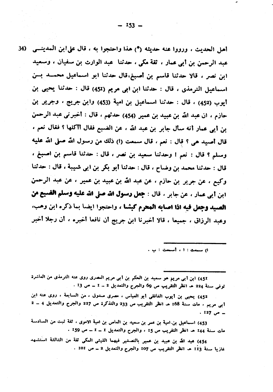 أَهْلِ الْحَدِيثِ وَرَوَوْا عَنْهُ حَدِيثَهُ هَذَا وَاحْتَجُّوا به قال علي ابن الْمَدِينِيِّ عَبْدُ الرَّحْمَنِ بْنُ أَبِي عَمَّارٍ ثِقَةٌ مَكِّيٌّ حَدَّثَنَا عَبْدُ الْوَارِثِ بْنُ سُفْيَانَ وَسَعِيدُ ابن نَصْرٍ قَالَا حَدَّثَنَا قَاسِمُ بْنُ أَصْبَغَ قَالَ حَدَّثَنَا أَبُو إِسْمَاعِيلَ مُحَمَّدُ بْنُ إِسْمَاعِيلَ التِّرْمِذِيُّ قَالَ حَدَّثَنَا ابْنُ أَبِي مَرْيَمَ قَالَ حَدَّثَنَا يَحْيَى بْنُ أَيُّوبَ قَالَ حَدَّثَنَا إِسْمَاعِيلُ بْنُ أُمَيَّةَ وَابْنُ جُرَيْجٍ وَجَرِيرُ بْنُ حَازِمٍ أَنَّ عَبْدَ اللَّهِ بْنَ عُبَيْدِ بْنِ عُمَيْرٍ حَدَّثَهُمْ قَالَ أَخْبَرَنِي عَبْدُ الرَّحْمَنِ بْنُ أَبِي عَمَّارٍ أَنَّهُ سَأَلَ جَابِرَ بْنَ عَبْدِ اللَّهِ عَنِ الضَّبُعِ فَقَالَ أَآكُلُلَهَا فَقَالَ نَعَمْ قَالَ أَصَيْدٌ هِيَ قَالَ نَعَمْ قَالَ سَمِعْتَ ذَلِكَ مِنْ رَسُولِ اللَّهِ صَلَّى اللَّهُ عَلَيْهِ وَسَلَّمَ قال نَعَمْ وَحَدَّثَنَا سَعِيدُ بْنُ نَصْرٍ قَالَ حَدَّثَنَا قَاسِمُ بْنُ أَصْبَغَ قَالَ حَدَّثَنَا مُحَمَّدُ بْنُ وَضَّاحٍ قَالَ حَدَّثَنَا أَبُو بَكْرِ بْنُ أَبِي شَيْبَةَ قَالَ حَدَّثَنَا وَكِيعٌ عَنْ جَرِيرِ بْنِ حَازِمٍ عَنْ عَبْدِ اللَّهِ بْنِ عُبَيْدِ بْنِ عُمَيْرٍ عَنْ عَبْدِ الرَّحْمَنِ بْنِ أَبِي عَمَّارٍ عَنْ جَابِرٍ قَالَ جَعَلَ رَسُولُ اللَّهِ صَلَّى اللَّهُ عَلَيْهِ وَسَلَّمَ الضَّبُعَ مِنَ الصَّيْدِ وَجَعَلَ فِيهِ إِذَا أَصَابَهُ الْمُحْرِمُ كَبْشًا وَاحْتَجُّوا أَيْضًا بِمَا ذَكَرَهُ ابْنُ وَهْبٍ وَعَبْدُ الرَّزَّاقِ جَمِيعًا قَالَا أَخْبَرَنَا ابْنُ جُرَيْجٍ أَنَّ نَافِعًا أَخْبَرَهُ أَنَّ رَجُلًا أَخْبَرَ