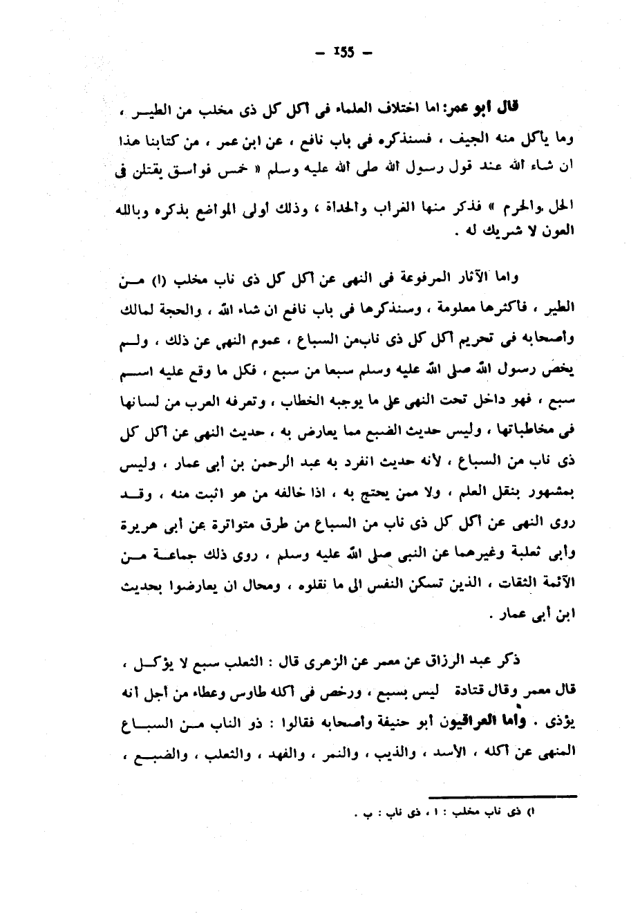 قَالَ أَبُو عُمَرَ أَمَّا اخْتِلَافُ الْعُلَمَاءِ فِي أَكْلِ كُلِّ ذِي مِخْلَبٍ مِنَ الطَّيْرِ وَمَا يَأْكُلُ مِنْهُ الْجِيَفَ فَسَنَذْكُرُهُ فِي بَابِ نَافِعٍ عَنِ ابْنِ عُمَرَ مِنْ كِتَابِنَا هَذَا إِنْ شَاءَ اللَّهُ عِنْدَ قَوْلِ رَسُولِ اللَّهِ صَلَّى اللَّهُ عَلَيْهِ وَسَلَّمَ خَمْسُ فَوَاسِقَ يُقْتَلْنَ فِي الْحِلِّ وَالْحَرَمِ فَذَكَرَ مِنْهَا الْغُرَابَ وَالْحِدَأَةَ وَذَلِكَ أَوْلَى الْمَوَاضِعِ بِذِكْرِهِ وَبِاللَّهِ الْعَوْنُ لَا شَرِيكَ لَهُ وَأَمَّا الْآثَارُ الْمَرْفُوعَةُ فِي النَّهْيِ عَنْ أكل كل ذي ناب مخلب مِنَ الطَّيْرِ فَأَكْثَرُهَا مَعْلُومَةٌ وَسَنَذْكُرُهَا فِي بَابِ نَافِعٍ إِنْ شَاءَ اللَّهُ وَالْحُجَّةُ لِمَالِكٍ وَأَصْحَابِهِ فِي تَحْرِيمِ أَكْلِ كُلِّ ذِي نَابٍ مِنَ السِّبَاعِ عُمُومُ النَّهْيِ عَنْ ذَلِكَ وَلَمْ يَخُصَّ رَسُولُ اللَّهِ صَلَّى اللَّهُ عَلَيْهِ وَسَلَّمَ سَبُعًا مِنْ سَبُعٍ فَكُلُّ مَا وَقَعَ عَلَيْهِ اسْمُ سَبُعٍ فَهُوَ دَاخِلٌ تَحْتَ النَّهْيِ عَلَى مَا يُوجِبُهُ الْخِطَابُ وَتَعْرِفُهُ الْعَرَبُ مِنْ لِسَانِهَا فِي مُخَاطَبَاتِهَا وَلَيْسَ حَدِيثُ الضَّبُعِ مِمَّا يُعَارَضُ بِهِ حَدِيثُ النَّهْيِ عَنْ أَكْلِ كُلِّ ذِي نَابٍ مِنَ السِّبَاعِ لِأَنَّهُ حَدِيثٌ انْفَرَدَ بِهِ عَبْدُ الرَّحْمَنِ بْنُ أَبِي عَمَّارٍ وَلَيْسَ بِمَشْهُورٍ بِنَقْلِ العلم ولا من يُحْتَجُّ بِهِ إِذَا خَالَفَهُ مَنْ هُوَ أَثْبَتُ مِنْهُ وَقَدْ رُوِيَ النَّهْيُ عَنْ أَكْلِ كُلِّ ذِي نَابٍ مِنَ السِّبَاعِ مِنْ طُرُقٍ مُتَوَاتِرَةٍ عَنْ أَبِي هُرَيْرَةَ وَأَبِي ثَعْلَبَةَ وَغَيْرِهِمَا عَنِ النَّبِيِّ صَلَّى اللَّهُ عَلَيْهِ وَسَلَّمَ رَوَى ذَلِكَ جَمَاعَةٌ مِنَ الْأَئِمَّةِ الثِّقَاتِ الَّذِينَ تَسْكُنُ النَّفْسُ إِلَى مَا نَقَلُوهُ وَمُحَالٌ أَنْ يُعَارَضُوا بِحَدِيثِ ابْنِ أَبِي عَمَّارٍ ذَكَرَ عَبْدُ الرَّزَّاقِ عَنْ مَعْمَرٍ عَنِ الزُّهْرِيِّ قَالَ الثَّعْلَبُ سَبُعٌ لَا يُؤْكَلُ قَالَ مَعْمَرٌ وَقَالَ قَتَادَةُ لَيْسَ بِسُبُعٍ وَرَخَّصَ فِي أَكْلِهِ طَاوُسٌ وَعَطَاءٌ مِنْ أَجْلِ أَنَّهُ يُؤْذِي وَأَمَّا الْعِرَاقِيُّونَ أَبُو حَنِيفَةَ وَأَصْحَابُهُ فقالوا ذو الناب من السباع المنهي عن أكله الأسد والذيب وَالنَّمِرُ وَالْفَهْدُ وَالثَّعْلَبُ وَالضَّبُعُ