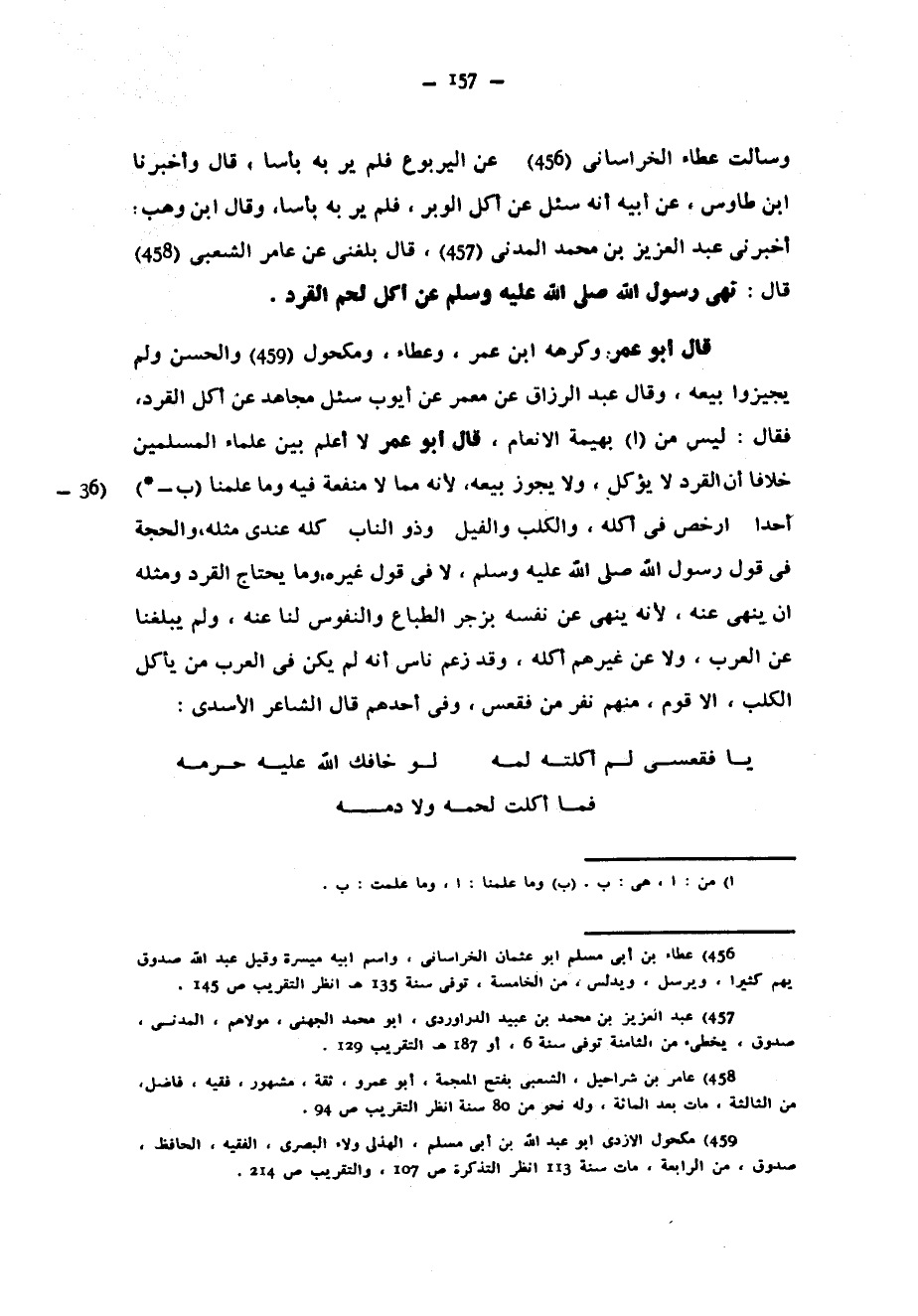 وسألت عطاء الخراساني عن اليربوع فلم يربه بَأْسًا قَالَ وَأَخْبَرَنَا ابْنُ طَاوُسٍ عَنْ أَبِيهِ أنه سئل عن أكل الوبر فلم يربه بَأْسًا وَقَالَ ابْنُ وَهْبٍ أَخْبَرَنَا عَبْدُ الْعَزِيزِ بْنُ مُحَمَّدٍ الْمَدَنِيُّ قَالَ بَلَغَنِي عَنْ عَامِرٍ الشَّعْبِيِّ قَالَ نَهَى رَسُولُ اللَّهِ صَلَّى اللَّهُ عَلَيْهِ وَسَلَّمَ عَنْ أَكْلِ لَحْمِ الْقِرْدِ قَالَ أَبُو عُمَرَ وَكَرِهَهُ ابْنُ عُمَرَ وَعَطَاءٌ وَمَكْحُولٌ وَالْحَسَنُ وَلَمْ يُجِيزُوا بَيْعَهُ وَقَالَ عَبْدُ الرَّزَّاقِ عَنْ مَعْمَرٍ عَنْ أَيُّوبَ سُئِلَ مُجَاهِدٌ عَنْ أَكْلِ الْقِرْدِ فَقَالَ لَيْسَ مِنْ بَهِيمَةِ الْأَنْعَامِ قال أبو عمر لاأعلم بَيْنَ عُلَمَاءِ الْمُسْلِمِينَ خِلَافًا أَنَّ الْقِرْدَ لَا يؤكل ولايجوز بَيْعُهُ لِأَنَّهُ مِمَّا لَا مَنْفَعَةَ فِيهِ وَمَا عَلِمْنَا أَحَدًا أَرْخَصَ فِي أَكْلِهِ وَالْكَلْبُ وَالْفِيلُ وَذُو النَّابِ كُلُّهُ عِنْدِي مِثْلُهُ وَالْحُجَّةُ فِي قَوْلِ رَسُولِ اللَّهِ صَلَّى اللَّهُ عَلَيْهِ وسلم لافي قَوْلِ غَيْرِهِ وَمَا يَحْتَاجُ الْقِرْدُ وَمِثْلُهُ أَنْ يَنْهَى عَنْهُ لِأَنَّهُ يُنْهِي عَنْ نَفْسِهِ بِزَجْرِ الطِّبَاعِ وَالنُّفُوسِ لَنَا عَنْهُ وَلَمْ يَبْلُغْنَا عَنِ الْعَرَبِ وَلَا عَنْ غَيْرِهِمْ أَكْلُهُ وَقَدْ زَعَمَ نَاسٌ أَنَّهُ لَمْ يَكُنْ فِي الْعَرَبِ مَنْ يأكل الكلب الاقوم مِنْهُمْ نَفَرٌ مَنْ فَقْعَسَ وَفِي أَحَدِهِمْ قَالَ الشاعر الاسدي ... يافقعسي لِمَ أَكَلْتَهُ لِمَهْ ... لَوْ خَافَكَ اللَّهُ عَلَيْهِ حرمه ... فما أكلت لحمه ولادمه