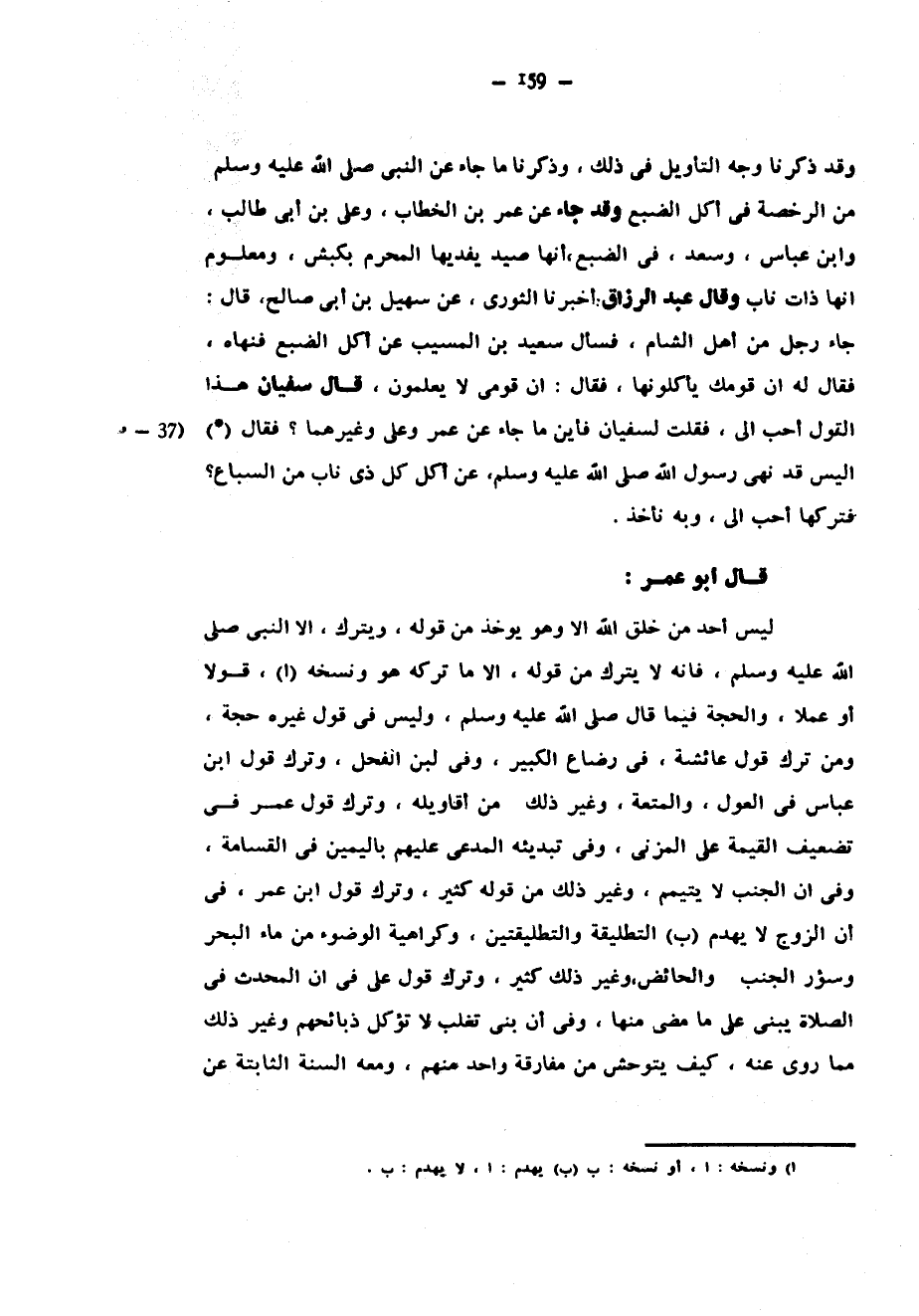 وَقَدْ ذَكَرْنَا وَجْهَ التَّأْوِيلِ فِي ذَلِكَ وَذَكَرْنَا مَا جَاءَ عَنِ النَّبِيِّ صَلَّى اللَّهُ عَلَيْهِ وَسَلَّمَ مِنَ الرُّخْصَةِ فِي أَكْلِ الضَّبُعِ وَقَدْ جَاءَ عَنْ عُمَرَ بْنِ الْخَطَّابِ وَعَلِيِّ بْنِ أَبِي طَالِبٍ وَابْنِ عَبَّاسٍ وَسَعْدٍ فِي الضَّبُعِ أنها صيد يفديها المحرك بِكَبْشٍ وَمَعْلُومٌ أَنَّهَا ذَاتُ نَابٍ وَقَالَ عَبْدُ الرَّزَّاقِ أَخْبَرَنَا الثَّوْرِيُّ عَنْ سُهَيْلِ بْنِ أَبِي صَالِحٍ قَالَ جَاءَ رَجُلٌ مِنْ أَهْلِ الشَّامِ فَسَأَلَ سَعِيدَ بْنَ الْمُسَيَّبِ عَنْ أَكْلِ الضَّبُعِ فَنَهَاهُ فَقَالَ لَهُ إِنَّ قَوَّمَكَ يَأْكُلُونَهَا فَقَالَ إِنَّ قَوْمِي لَا يَعْلَمُونَ قَالَ سُفْيَانُ هَذَا الْقَوْلُ أَحَبُّ إِلَيَّ فَقُلْتُ لِسُفْيَانَ فَأَيْنَ مَا جَاءَ عَنْ عُمَرَ وَعَلِيٍّ وَغَيْرِهِمَا فَقَالَ أَلَيْسَ قَدْ نَهَى رَسُولُ اللَّهِ صَلَّى اللَّهُ عَلَيْهِ وَسَلَّمَ عَنْ أَكْلِ كُلِّ ذِي نَابٍ مِنَ السِّبَاعِ فَتَرْكُهَا أَحَبُّ إِلَيَّ وَبِهِ نَأْخُذُ قَالَ أَبُو عُمَرَ لَيْسَ أَحَدٌ مِنْ خَلْقِ اللَّهِ الا وهو يوخذ من قوله ويترك إلا النبي صلى الله عَلَيْهِ وَسَلَّمَ فَإِنَّهُ لَا يُتْرَكُ مِنْ قَوْلِهِ إِلَّا مَا تَرَكَهُ هُوَ وَنَسَخَهُ قَوْلًا أَوْ عَمَلًا وَالْحُجَّةُ فِيمَا قَالَ صَلَّى اللَّهُ عَلَيْهِ وَسَلَّمَ وَلَيْسَ فِي قَوْلِ غَيْرِهِ حُجَّةٌ وَمَنْ تَرَكَ قَوْلَ عَائِشَةَ فِيِ رَضَاعِ الْكَبِيرِ وَفِي لَبَنِ الْفَحْلِ وَتَرَكَ قَوْلَ ابْنِ عَبَّاسٍ فِي الْعَوْلِ وَالْمُتْعَةِ وَغَيْرِ ذَلِكَ مِنْ أَقَاوِيلِهِ وَتَرَكَ قَوْلَ عُمَرَ فِي تَضْعِيفِ الْقِيمَةِ عَلَى الْمُزْنِي وَفِي تَبْدِيئِهِ الْمُدَّعَى عَلَيْهِمْ بِالْيَمِينِ فِي الْقَسَامَةِ وَفِي أَنَّ الْجُنَبَ لَا يَتَيَمَّمُ وَغَيْرُ ذَلِكَ مِنْ قَوْلِهِ كَثِيرٌ وَتَرَكَ قَوْلَ ابْنَ عُمَرَ فِي أَنَّ الزَّوْجَ لَا يَهْدِمُ التَّطْلِيقَةَ وَالتَّطْلِيقَتَيْنِ وَكَرَاهِيَةِ الْوُضُوءِ مِنْ مَاءِ الْبَحْرِ وَسُؤْرِ الْجُنُبِ وَالْحَائِضِ وَغَيْرُ ذَلِكَ كَثِيرٌ وَتَرَكَ قَوْلَ عَلِيٍّ فِي أَنَّ الْمُحْدِثَ فِي الصَّلَاةِ يَبْنِي عَلَى مَا مَضَى مِنْهَا وَفِي أَنَّ بَنِي تَغْلِبَ لَا تُؤْكَلُ ذَبَائِحُهُمْ وَغَيْرُ ذَلِكَ مِمَّا رُوِيَ عَنْهُ كَيْفَ يَتَوَحَّشُ مِنْ مُفَارَقَةِ وَاحِدٍ مِنْهُمْ وَمَعَهُ السُّنَّةُ الثَّابِتَةُ عَنِ