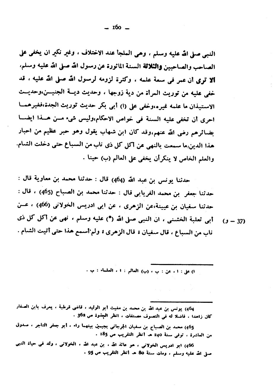 النَّبِيِّ صَلَّى اللَّهُ عَلَيْهِ وَسَلَّمَ وَهِيَ الْمَلْجَأُ عِنْدَ الِاخْتِلَافِ وَغَيْرُ نَكِيرٍ أَنْ يَخْفَى عَلَى الصَّاحِبِ وَالصَّاحِبَيْنِ وَالثَّلَاثَةِ السُّنَّةُ الْمَأْثُورَةُ عَنْ رَسُولِ اللَّهِ صَلَّى اللَّهُ عَلَيْهِ وَسَلَّمَ أَلَا تَرَى أَنَّ عُمَرَ فِي سِعَةِ عِلْمِهِ وَكَثْرَةِ لُزُومِهِ لِرَسُولِ اللَّهِ صَلَّى اللَّهُ عَلَيْهِ وَسَلَّمَ قَدْ خَفِيَ عَلَيْهِ مِنْ تَوْرِيثِ الْمَرْأَةِ مِنْ دِيَةِ زوجها وحديث دية الجنين فَغَيْرُهُمَا أَحْرَى أَنْ تَخْفَى عَلَيْهِ السُّنَّةُ فِي خَوَاصِّ الْأَحْكَامِ وَلَيْسَ شَيْءٌ مِنْ هَذَا أَيْضًا بضائرهم رضي الله عنهم وَقَدْ كَانَ ابْنُ شِهَابٍ يَقُولُ وَهُوَ حَبْرٌ عَظِيمٌ مِنْ أَحْبَارِ هَذَا الدِّينِ مَا سَمِعْتُ بِالنَّهْيِ عَنْ أَكْلِ كُلِّ ذِي نَابٍ مِنَ السِّبَاعِ حَتَّى دَخَلْتُ الشَّامَ وَالْعِلْمُ الْخَاصُّ لَا يُنْكَرُ أَنْ يَخْفَى عَلَى الْعَالِمِ حِينًا حَدَّثَنَا يُونُسُ بْنُ عَبْدِ اللَّهِ قَالَ حَدَّثَنَا مُحَمَّدُ بْنُ مُعَاوِيَةَ قَالَ حَدَّثَنَا جَعْفَرُ بْنُ مُحَمَّدٍ الْفِرْيَابِيُّ قَالَ حَدَّثَنَا مُحَمَّدُ بْنُ الصَّبَاحِ قَالَ حَدَّثَنَا سُفْيَانُ بْنُ عُيَيْنَةَ عَنِ الزُّهْرِيِّ عَنْ أَبِي إِدْرِيسَ الْخَوْلَانِيِّ عَنْ أَبِي ثَعْلَبَةَ الْخُشَنِيِّ أَنَّ النَّبِيَّ صَلَّى اللَّهُ عَلَيْهِ وَسَلَّمَ نَهَى عَنْ أَكْلِ كُلِّ ذِي نَابٍ مِنَ السِّبَاعِ قَالَ سُفْيَانُ قَالَ الزُّهْرِيُّ وَلَمْ أَسْمَعْ هَذَا حَتَّى أَتَيْتُ الشَّامَ