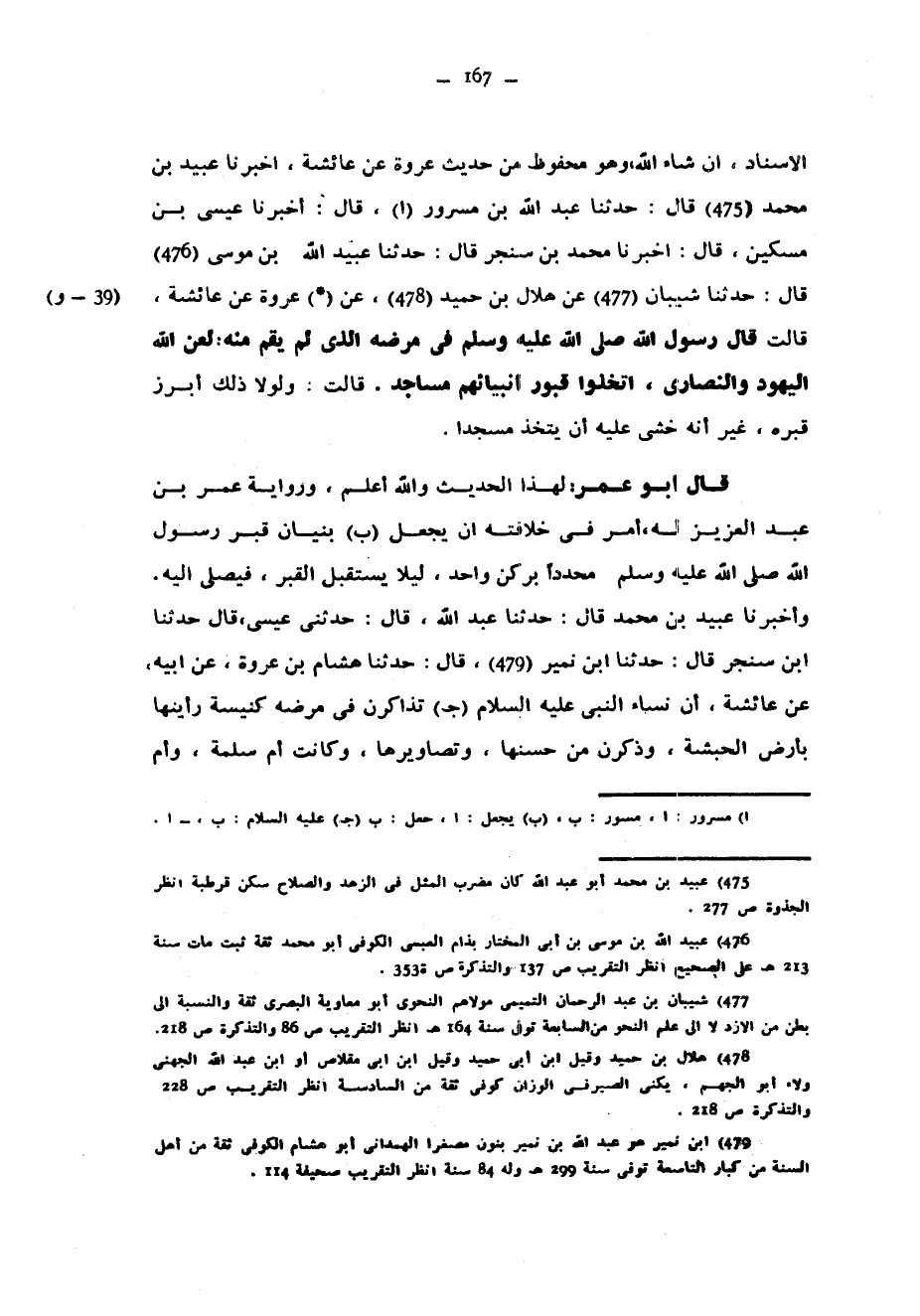 الْإِسْنَادِ إِنْ شَاءَ اللَّهُ وَهُوَ مَحْفُوظٌ مِنْ حَدِيثِ عُرْوَةَ عَنْ عَائِشَةَ أَخْبَرَنَا عُبَيْدُ بْنُ مُحَمَّدٍ قَالَ حَدَّثَنَا عَبْدُ اللَّهِ بْنُ مَسْرُورٍ قَالَ أَخْبَرَنَا عِيسَى بْنُ مِسْكِينٍ قَالَ أَخْبَرَنَا ممحمد بن سنجر قَالَ حَدَّثَنَا عُبَيْدُ اللَّهِ بْنُ مُوسَى قَالَ حَدَّثَنَا شَيْبَانُ عَنْ هِلَالِ بْنِ حَمِيدٍ عَنْ عُرْوَةَ عَنْ عَائِشَةَ قَالَتْ قَالَ رَسُولُ اللَّهِ صَلَّى اللَّهُ عَلَيْهِ وَسَلَّمَ فِي مَرَضِهِ الَّذِي لَمْ يَقُمْ مِنْهُ لَعَنَ اللَّهُ اليهود والنصارى اتَّخَذُوا قُبُورَ أَنْبِيَائِهِمْ مَسَاجِدَ قَالَتْ وَلَوْلَا ذَلِكَ أَبْرَزَ قَبْرَهُ غَيْرَ أَنَّهُ خَشِيَ عَلَيْهِ أَنْ يُتَّخَذَ مَسْجِدًا قَالَ أَبُو عُمَرَ لِهَذَا الْحَدِيثِ وَاللَّهُ أَعْلَمُ وَرِوَايَةُ عُمَرَ بْنِ عَبْدِ الْعَزِيزِ لَهُ أَمَرَ فِي خِلَافَتِهِ أَنْ يُجْعَلَ بُنْيَانُ قَبْرِ رَسُولِ اللَّهِ صَلَّى اللَّهُ عَلَيْهِ وَسَلَّمَ محددا بركن واحد ليلا يُسْتَقْبَلَ الْقَبْرُ فَيُصَلَّى إِلَيْهِ وَأَخْبَرَنَا عُبَيْدُ بْنُ مُحَمَّدٍ قَالَ حَدَّثَنَا عَبْدُ اللَّهِ قَالَ حَدَّثَنِي عِيسَى قَالَ حَدَّثَنَا ابْنُ سِنْجِرٍ قَالَ حَدَّثَنَا ابْنُ نُمَيْرٍ قَالَ حَدَّثَنَا هِشَامُ بْنُ عُرْوَةَ عَنْ أَبِيهِ عَنْ عَائِشَةَ أَنَّ نِسَاءَ النَّبِيِّ عَلَيْهِ السَّلَامُ تَذَاكَرْنَ فِي مَرَضِهِ كَنِيسَةً رَأَيْنَهَا بِأَرْضِ الْحَبَشَةِ وَذَكَرْنَ مِنْ حُسْنِهَا وَتَصَاوِيرِهَا وَكَانَتْ أُمُّ سَلَمَةَ وَأُمُّ