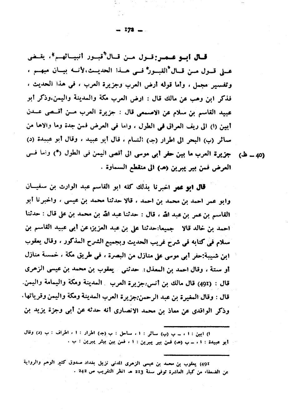 قَالَ أَبُو عُمَرَ قَوْلُ مَنْ قَالَ قُبُورُ أَنْبِيَائِهِمْ يَقْضِي عَلَى قَوْلِ مَنْ قَالَ الْقُبُورُ فِي هَذَا الْحَدِيثِ لِأَنَّهُ بَيَانٌ مُبْهَمٌ وَتَفْسِيرٌ مُجْمَلٌ وَأَمَّا قَوْلُهُ أَرْضُ الْعَرَبِ وَجَزِيرَةُ الْعَرَبِ فِي هَذَا الْحَدِيثِ فَذَكَرَ ابْنُ وَهْبٍ عَنْ مَالِكٍ قَالَ أَرْضُ الْعَرَبِ مَكَّةُ وَالْمَدِينَةُ وَالْيَمَنُ وَذَكَرَ أَبُو عُبَيْدٍ الْقَاسِمُ بْنُ سَلَامٍ عَنِ الْأَصْمَعِيِّ قَالَ جَزِيرَةُ الْعَرَبِ مِنْ أَقْصَى عَدَنِ أَبْيَنَ إِلَى رِيفِ الْعِرَاقِ فِي الطُّولِ وَأَمَّا فِي الْعَرْضِ فَمِنْ جَدَّةَ وَمَا وَالَاهَا مِنْ سَائِرِ الْبَحْرِ إِلَى أَطْرَارِ الشَّامِ قَالَ أَبُو عُبَيْدٍ وَقَالَ أَبُو عُبَيْدَةَ جَزِيرَةُ الْعَرَبِ مَا بَيْنَ حَفْرِ أَبِي مُوسَى إِلَى أَقْصَى الْيَمَنِ في اطول واما في العرض فمن بير يبرين (هـ) إِلَى مُنْقَطَعِ السَّمَاوَةِ قَالَ أَبُو عُمَرَ أَخْبَرَنَا بِذَلِكَ كُلِّهِ أَبُو الْقَاسِمِ عَبْدُ الْوَارِثِ بْنُ سُفْيَانَ وَأَبُو عُمَرَ أَحْمَدُ بْنُ مُحَمَّدِ بْنِ أَحْمَدَ قَالَا حَدَّثَنَا مُحَمَّدُ بْنُ عِيسَى وَأَخْبَرَنَا أَبُو الْقَاسِمِ بْنُ عُمَرَ بْنِ عَبْدِ اللَّهِ قَالَ حَدَّثَنَا عَبْدُ اللَّهِ بْنُ مُحَمَّدِ بْنِ عَلِيٍّ قَالَ حَدَّثَنَا أَحْمَدُ بْنُ خَالِدٍ قَالَا جَمِيعًا حَدَّثَنَا عَلِيُّ بْنُ عَبْدِ الْعَزِيزِ عَنْ أَبِي عُبَيْدٍ الْقَاسِمِ بْنِ سَلَامٍ فِي كِتَابِهِ فِي شَرْحِ غَرِيبِ الْحَدِيثِ وَبِجَمِيعِ الشَّرْحِ الْمَذْكُورِ وقال يعقوب ابن شَيْبَةَ حَفَرَ أَبِي مُوسَى عَلَى مَنَازِلَ مِنَ الْبَصْرَةِ فِي طَرِيقِ مَكَّةَ خَمْسَةَ مَنَازِلَ أَوْ سِتَّةً وَقَالَ أَحْمَدُ بْنُ الْمُعَذَّلِ حَدَّثَنِي يَعْقُوبُ بْنُ مُحَمَّدِ بْنِ عِيسَى الزُّهْرِيِّ قَالَ قَالَ مَالِكُ بْنُ أَنَسٍ جَزِيرَةُ الْعَرَبِ الْمَدِينَةُ وَمَكَّةُ وَالْيَمَامَةُ وَالْيَمَنُ قَالَ وَقَالَ الْمُغِيرَةُ بْنُ عَبْدِ الرَّحْمَنِ جَزِيرَةُ الْعَرَبِ الْمَدِينَةُ وَمَكَّةُ وَالْيَمَنُ وَقَرْيَاتُهَا وَذَكَرَ الْوَاقِدِيُّ عَنْ مُعَاذِ بْنِ مُحَمَّدٍ الْأَنْصَارِيِّ أَنَّهُ حَدَّثَهُ عَنْ أَبِي وَجْزَةَ يَزِيدَ بْنِ