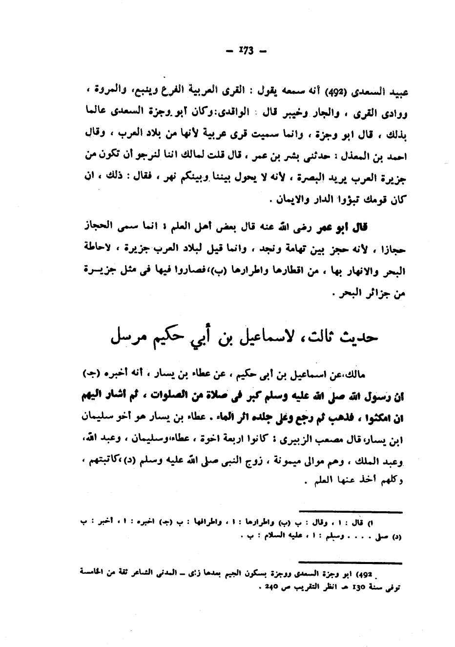 عُبَيْدٍ السَّعْدِيِّ أَنَّهُ سَمِعَهُ يَقُولُ الْقُرَى الْعَرَبِيَّةُ الْفَرْعُ وَيَنْبُعُ وَالْمَرْوَةُ وَوَادِي الْقُرَى وَالْجَارُ وَخَيْبَرُ قَالَ الْوَاقِدِيُّ وَكَانَ أَبُو وَجْزَةَ السَّعْدِيُّ عَالِمًا بِذَلِكَ قَالَ أَبُو وَجْزَةَ وَإِنَّمَا سُمِّيَتْ قُرًى عرية لِأَنَّهَا مِنْ بِلَادِ الْعَرَبِ وَقَالَ أَحْمَدُ بْنُ الْمُعَذَّلِ حَدَّثَنِي بِشْرُ بْنُ عُمَرَ قَالَ قُلْتُ لمالك إِنَّنَا لَنَرْجُوَ أَنْ تَكُونَ مِنْ جَزِيرَةِ الْعَرَبِ يُرِيدُ الْبَصْرَةَ لِأَنَّهُ لَا يَحُولُ بَيْنَنَا وَبَيْنَكُمْ نهر فقال ذلك ان كان قومك تبؤوا الدَّارَ وَالْإِيمَانِ قَالَ أَبُو عُمَرَ رَضِيَ اللَّهُ عَنْهُ قَالَ بَعْضُ أَهْلِ الْعِلْمِ إِنَّمَا سُمِّيَ الحجاز حجازا لأنه يحجز بني تِهَامَةَ وَنَجْدٍ وَإِنَّمَا قِيلَ لِبِلَادِ الْعَرَبِ جَزِيرَةٌ لِإِحَاطَةِ الْبَحْرِ وَالْأَنْهَارِ بِهَا مِنْ أَقْطَارِهَا وَأَطْرَارِهَا فَصَارُوا فِيهَا فِي مِثْلِ جَزِيرَةٍ مِنْ جَزَائِرِ الْبَحْرِ