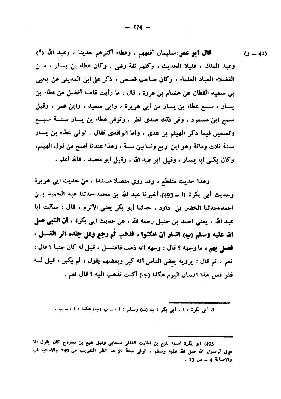 وَهَذَا حَدِيثٌ مُنْقَطِعٌ وَقَدْ رُوِيَ مُتَّصِلًا مُسْنَدًا مِنْ حَدِيثِ أَبِي هُرَيْرَةَ وَحَدِيثِ أَبِي بَكْرَةَ أَخْبَرَنَا عَبْدُ اللَّهِ بْنُ مُحَمَّدٍ حَدَّثَنَا عَبْدُ الْحَمِيدِ بْنُ أَحْمَدَ حَدَّثَنَا الْخَضِرُ بْنُ دَاوُدَ حَدَّثَنَا أَبُو بَكْرٍ يَعْنِي الْأَثْرَمَ قَالَ سَأَلْتُ أَبَا عَبْدِ اللَّهِ يَعْنِي أَحْمَدَ بْنَ حَنْبَلٍ رَحِمَهُ اللَّهُ عَنْ حَدِيثِ أَبِي بَكْرَةَ أَنَّ النَّبِيَّ صَلَّى اللَّهُ عَلَيْهِ وَسَلَّمَ أَشَارَ أَنِ امْكُثُوا فَذَهَبَ ثُمَّ رَجَعَ وَعَلَى جِلْدِهِ أَثَرُ الْغُسْلِ فَصَلَّى بِهِمْ مَا وَجْهُهُ قَالَ وَجْهُهُ أَنَّهُ ذَهَبَ فَاغْتَسَلَ قِيلَ لَهُ كَانَ جُنُبًا قَالَ نَعَمْ ثُمَّ قَالَ يَرْوِيهِ بَعْضُ النَّاسِ أَنَّهُ كَبَّرَ وَبَعْضُهُمْ يَقُولُ لم يكبر قيل له فتلو فَعَلَ هَذَا إِنْسَانٌ الْيَوْمَ هَكَذَا أَكُنْتَ تَذْهَبُ إِلَيْهِ قَالَ نَعَمْ