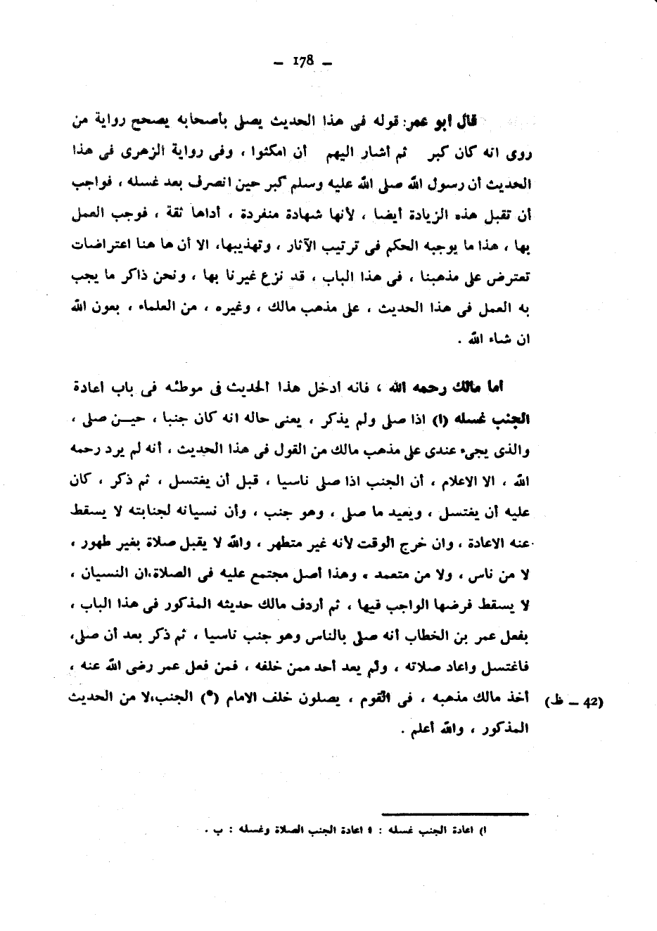 قَالَ أَبُو عُمَرَ قَوْلُهُ فِي هَذَا الْحَدِيثِ يُصَلِّي بِأَصْحَابِهِ يُصَحِّحُ رِوَايَةَ مَنْ رَوَى أَنَّهُ كَانَ كَبَّرَ ثُمَّ أَشَارَ إِلَيْهِمْ أَنِ امْكُثُوا وَفِي رِوَايَةِ الزُّهْرِيِّ فِي هَذَا الْحَدِيثِ أَنَّ رَسُولَ اللَّهِ صَلَّى اللَّهُ عَلَيْهِ وَسَلَّمَ كَبَّرَ حِينَ انْصَرَفَ بَعْدَ غُسْلِهِ فَوَاجِبٌ أَنْ تُقْبَلَ هَذِهِ الزِّيَادَةُ أَيْضًا لِأَنَّهَا شَهَادَةٌ مُنْفَرِدَةٌ أَدَّاهَا ثِقَةٌ فَوَجَبَ الْعَمَلُ بِهَا هَذَا مَا يُوجِبُهُ الْحُكْمُ فِي تَرْتِيبِ الْآثَارِ وَتَهْذِيبِهَا إِلَّا أَنَّ هَا هُنَا اعْتِرَاضَاتٍ تَعْتَرِضُ عَلَى مَذْهَبِنَا فِي هَذَا الْبَابِ قَدْ نَزَعَ غَيْرُنَا بِهَا وَنَحْنُ ذاكر ما يجب به العلم فِي هَذَا الْحَدِيثِ عَلَى مَذْهَبِ مَالِكٍ وَغَيْرِهِ مِنَ الْعُلَمَاءِ بِعَوْنِ اللَّهِ إِنْ شَاءَ اللَّهُ أَمَّا مَالِكٌ رَحِمَهُ اللَّهُ فَإِنَّهُ أَدْخَلَ هَذَا الْحَدِيثَ فِي مُوَطَّئِهِ فِي بَابِ إِعَادَةِ الْجُنُبِ غُسْلَهُ إِذَا صَلَّى وَلَمْ يَذْكُرْ يَعْنِي حَالَهُ أَنَّهُ كَانَ جُنُبًا حِينَ صَلَّى وَالَّذِي يَجِيءُ عِنْدِي عَلَى مَذْهَبِ مَالِكٍ مِنَ الْقَوْلِ فِي هَذَا الْحَدِيثِ أَنَّهُ لَمْ يُرِدْ رَحِمَهُ اللَّهُ إِلَّا الْإِعْلَامَ أَنَّ الْجُنُبَ إِذَا صَلَّى نَاسِيًا قَبْلَ أَنْ يَغْتَسِلَ ثُمَّ ذَكَرَ كَانَ عَلَيْهِ أَنْ يَغْتَسِلَ وَيُعِيدَ مَا صَلَّى وَهُوَ جُنُبٌ وَأَنَّ نِسْيَانَهُ لِجَنَابَتِهِ لَا يُسْقِطُ عَنْهُ الْإِعَادَةَ وَإِنْ خَرَجَ الْوَقْتُ لِأَنَّهُ غَيْرُ مُتَطَهِّرٍ وَاللَّهُ لَا يَقْبَلُ صَلَاةً بِغَيْرٍ طَهُورٍ لَا مِنْ نَاسٍ وَلَا مِنْ مُتَعَمِّدٍ وَهَذَا أَصْلٌ مُجْتَمَعٌ عَلَيْهِ فِي الصَّلَاةِ أَنَّ النِّسْيَانَ لَا يُسْقِطُ فَرْضَهَا الْوَاجِبَ فِيهَا ثُمَّ أَرْدَفَ مَالِكٌ حَدِيثَهُ الْمَذْكُورَ فِي هَذَا الْبَابِ بِفِعْلِ عُمَرَ بْنِ الْخَطَّابِ أَنَّهُ صَلَّى بِالنَّاسِ وَهُوَ جُنُبٌ نَاسِيًا ثُمَّ ذَكَرَ بَعْدَ أَنْ صَلَّى فَاغْتَسَلَ وَأَعَادَ صَلَاتَهُ وَلَمْ يُعِدْ أَحَدٌ مِمَّنْ خَلْفَهُ فَمِنْ فِعْلِ عُمَرَ رَضِيَ اللَّهُ عَنْهُ أَخَذَ مَالِكٌ مَذْهَبَهُ فِي الْقَوْمِ يُصَلُّونَ خَلْفَ الْإِمَامِ الْجُنُبِ لَا مِنَ الْحَدِيثِ الْمَذْكُورِ وَاللَّهُ أَعْلَمُ