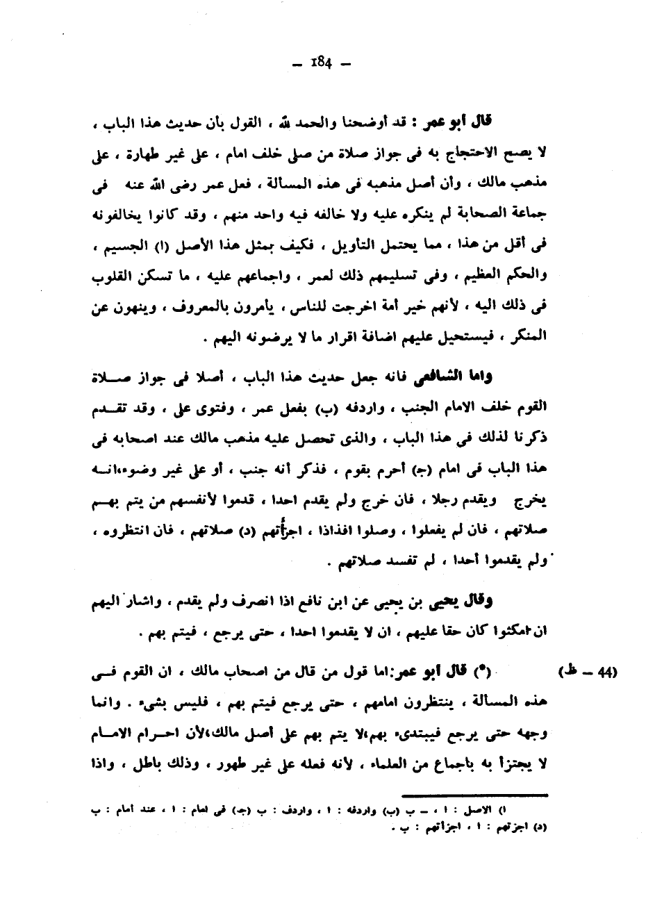 قَالَ أَبُو عُمَرَ قَدْ أَوْضَحْنَا وَالْحَمْدُ لِلَّهِ الْقَوْلَ بِأَنَّ حَدِيثَ هَذَا الْبَابِ لَا يَصِحُّ الِاحْتِجَاجُ بِهِ فِي جَوَازِ صَلَاةِ مَنْ صَلَّى خَلَفَ إِمَامٍ عَلَى غَيْرِ طَهَارَةٍ عَلَى مَذْهَبِ مَالِكٍ وَأَنَّ أَصْلَ مَذْهَبِهِ فِي هَذِهِ الْمَسْأَلَةِ فِعْلُ عُمَرَ رَضِيَ اللَّهُ عَنْهُ فِي جَمَاعَةِ الصَّحَابَةِ لَمْ يُنْكِرْهُ عَلَيْهِ وَلَا خَالَفَهُ فِيهِ وَاحِدٌ مِنْهُمْ وَقَدْ كَانُوا يُخَالِفُونَهُ فِي أَقَلِّ مِنْ هَذَا مِمَّا يَحْتَمِلُ التَّأْوِيلَ فَكَيْفَ بِمِثْلِ هَذَا الْأَصْلِ الْجَسِيمِ وَالْحُكْمِ الْعَظِيمِ وَفِي تَسْلِيمِهِمْ ذَلِكَ لِعُمَرَ وَإِجْمَاعِهِمْ عَلَيْهِ مَا تَسْكُنُ الْقُلُوبُ فِي ذَلِكَ إِلَيْهِ لِأَنَّهُمْ خَيْرُ أُمَّةٍ أُخْرِجَتْ لِلنَّاسِ يَأْمُرُونَ بِالْمَعْرُوفِ وَيَنْهَوْنَ عَنِ الْمُنْكَرِ فَيَسْتَحِيلُ عَلَيْهِمْ إِضَافَةُ إِقْرَارِ مَا لَا يَرْضَوْنَهُ إِلَيْهِمْ وَأَمَّا الشَّافِعِيُّ فَإِنَّهُ جَعَلَ حَدِيثَ هَذَا الْبَابِ أَصْلًا فِي جَوَازِ صَلَاةِ الْقَوْمِ خَلْفَ الْإِمَامِ الجنب وأردفه بفعل عمرر وَفَتْوَى عَلِيٍّ وَقَدْ تَقَدَّمَ ذِكْرُنَا لِذَلِكَ فِي هَذَا الْبَابِ وَالَّذِي تَحَصَّلَ عَلَيْهِ مَذْهَبُ مَالِكٍ عِنْدَ أَصْحَابِهِ فِي هَذَا الْبَابِ فِي إِمَامٍ أَحْرَمَ بِقَوْمٍ فَذَكَرَ أَنَّهُ جُنُبٌ أَوْ عَلَى غَيْرِ وُضُوءٍ أَنَّهُ يَخْرُجُ وَيُقَدِّمُ رَجُلًا فَإِنْ خَرَجَ وَلَمْ يُقَدِّمْ أَحَدًا قَدَّمُوا لِأَنْفُسِهِمْ مِنْ يُتِمُّ بِهِمْ صَلَاتَهُمْ فَإِنْ لَمْ يَفْعَلُوا وَصَلَّوْا أَفْذَاذًا أَجْزَأَتْهُمْ صَلَاتُهُمْ فَإِنِ انْتَظَرُوهُ وَلَمْ يُقَدِّمُوا أَحَدًا لَمْ تَفْسَدْ صَلَاتُهُمْ وَقَالَ يَحْيَى بْنُ يَحْيَى عَنِ ابْنِ نَافِعٍ إِذَا انْصَرَفَ وَلَمْ يقدم واشار اليهم ان امكنوا كَانَ حَقًّا عَلَيْهِمْ أَنْ لَا يُقَدِّمُوا أَحَدًا حَتَّى يَرْجِعَ فَيُتِمُّ بِهِمْ قَالَ أَبُو عُمَرَ أَمَّا قَوْلُ مَنْ قَالَ مِنْ أَصْحَابِ مَالِكٍ إِنَّ الْقَوْمَ فِي هَذِهِ الْمَسْأَلَةِ يَنْتَظِرُونَ إِمَامَهُمْ حَتَّى يَرْجِعَ فَيُتِمُّ بِهِمْ فَلَيْسَ بِشَيْءٍ وَإِنَّمَا وجهه حتى يرجع فيبتدىء بِهِمْ لَا يُتِمُّ بِهِمْ عَلَى أَصْلِ مَالِكٍ لِأَنَّ إِحْرَامَ الْإِمَامِ لَا يُجْتَزَأُ بِهِ بِإِجْمَاعٍ مِنَ الْعُلَمَاءِ لِأَنَّهُ فَعَلَهُ عَلَى غَيْرِ طَهُورٍ وذلك باطل واذا