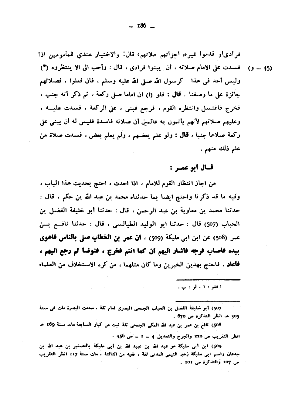 فُرَادَى أَوْ قَدَّمُوا غَيْرَهُ أَجْزَأَتْهُمْ صَلَاتُهُمْ قَالَ وَالِاخْتِيَارُ عِنْدِي لِلْمَأْمُومِينَ إِذَا فَسَدَتْ عَلَى الْإِمَامِ صَلَاتُهُ أَنْ يَبْنُوا فُرَادَى قَالَ وَأَحَبُّ إِلَيَّ أَلَّا يَنْتَظِرُوهُ وَلَيْسَ أَحَدٌ فِي هَذَا كَرَسُولِ اللَّهِ صَلَّى اللَّهُ عَلَيْهِ وَسَلَّمَ فَإِنْ فَعَلُوا فَصَلَاتُهُمْ جَائِزَةٌ عَلَى مَا وَصَفْنَا قَالَ فَلَوْ أَنَّ إِمَامًا صَلَّى رَكْعَةً ثُمَّ ذَكَرَ أَنَّهُ جُنُبٌ فَخَرَجَ فَاغْتَسَلَ وَانْتَظَرَهُ الْقَوْمُ فَرَجَعَ فَبَنَى عَلَى الرَّكْعَةِ فَسَدَتْ عَلَيْهِ وَعَلَيْهِمْ صَلَاتُهُمْ لِأَنَّهُمْ يَأْتَمُّونَ بِهِ عَالِمِينَ أَنَّ صَلَاتَهُ فَاسِدَةٌ فَلَيْسَ له أن يبنى على رجعة صَلَّاهَا جُنُبًا قَالَ وَلَوْ عَلِمَ بَعْضُهُمْ وَلَمْ يَعْلَمْ بَعْضٌ فَسَدَتْ صَلَاةُ مَنْ عَلِمَ ذَلِكَ مِنْهُمْ قَالَ أَبُو عُمَرَ مَنْ أَجَازَ انْتِظَارَ الْقَوْمِ لِلْإِمَامِ إِذَا أَحْدَثَ احْتَجَّ بِحَدِيثِ هَذَا الْبَابِ وَفِيهِ مَا قَدْ ذَكَرْنَا وَاحْتَجَّ أَيْضًا بِمَا حَدَّثَنَاهُ مُحَمَّدُ بْنُ عَبْدِ اللَّهِ بْنِ حَكَمٍ قَالَ حَدَّثَنَا مُحَمَّدُ بْنُ مُعَاوِيَةَ بْنِ عَبْدِ الرَّحْمَنِ قَالَ حَدَّثَنَا أَبُو خَلِيفَةَ الْفَضْلُ بْنُ الْحُبَابِ قَالَ حَدَّثَنَا أَبُو الْوَلِيدِ الطَّيَالِسِيُّ قَالَ حَدَّثَنَا نَافِعُ بْنُ عُمَرَ عَنِ ابْنِ أَبِي مُلَيْكَةَ أَنَّ عُمَرَ بْنَ الْخَطَّابِ صَلَّى بِالنَّاسِ فَأَهْوَى بِيَدِهِ فَأَصَابَ فَرْجَهُ فَأَشَارَ إِلَيْهِمْ أَنْ كَمَا أَنْتُمْ فَخَرَجَ فَتَوَضَّأَ ثُمَّ رَجَعَ إِلَيْهِمْ فَأَعَادَ فَاحْتَجَّ بِهَذَيْنِ الْخَبَرَيْنِ وَمَا كَانَ مِثْلُهُمَا مَنْ كَرِهَ الِاسْتِخْلَافَ مِنَ الْعُلَمَاءِ