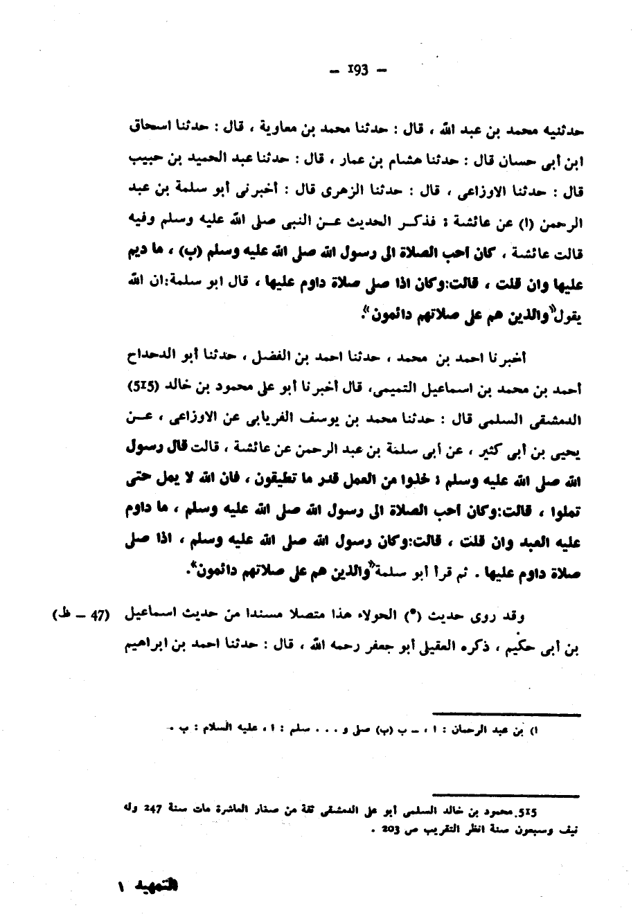 حَدَّثَنِيهِ مُحَمَّدُ بْنُ عَبْدِ اللَّهِ قَالَ حَدَّثَنَا مُحَمَّدُ بن معاوية قال حدثنا اسحاق ابْنُ أَبِي حَسَّانَ قَالَ حَدَّثَنَا هِشَامُ بْنُ عَمَّارٍ قَالَ حَدَّثَنَا عَبْدُ الْحَمِيدِ بْنُ حَبِيبٍ قَالَ حَدَّثَنَا الْأَوْزَاعِيُّ قَالَ حَدَّثَنَا الزُّهْرِيُّ قَالَ أَخْبَرَنِي أَبُو سَلَمَةَ بْنُ عَبْدِ الرَّحْمَنِ عَنْ عَائِشَةَ فَذَكَرَ الْحَدِيثَ عَنِ النَّبِيِّ صَلَّى اللَّهُ عَلَيْهِ وَسَلَّمَ وَفِيهِ قَالَتْ عَائِشَةُ كَانَ أَحَبُّ الصَّلَاةِ إِلَى رَسُولِ اللَّهِ صَلَّى اللَّهُ عَلَيْهِ وَسَلَّمَ مَا دِيمَ عَلَيْهَا وَإِنْ قَلَّتْ قَالَتْ وَكَانَ إِذَا صَلَّى صَلَاةً دَاوَمَ عَلَيْهَا قَالَ أَبُو سَلَمَةَ إِنَّ اللَّهَ يَقُولُ الَّذِينَ هُمْ عَلَى صَلَاتِهِمْ دَائِمُونَ أَخْبَرَنَا أَحْمَدُ بْنُ مُحَمَّدٍ حَدَّثَنَا أَحْمَدُ بْنُ الْفَضْلِ حَدَّثَنَا أَبُو الدَّحْدَاحِ أَحْمَدُ بْنُ مُحَمَّدِ بْنِ إِسْمَاعِيلَ التَّمِيمِيُّ قَالَ أَخْبَرَنَا أَبُو عَلِيٍّ مَحْمُودُ بْنُ خَالِدٍ الدِّمَشْقِيُّ السُّلَمِيُّ قَالَ حَدَّثَنَا مُحَمَّدُ بْنُ يُوسُفَ الْفِرْيَابِيُّ عَنِ الْأَوْزَاعِيِّ عَنْ يَحْيَى بْنِ أَبِي كَثِيرٍ عَنْ أَبِي سَلَمَةَ بْنِ عَبْدِ الرَّحْمَنِ عَنْ عَائِشَةَ قَالَتْ قَالَ رَسُولُ اللَّهِ صَلَّى اللَّهُ عَلَيْهِ وَسَلَّمَ خُذُوا مِنَ الْعَمَلِ قَدْرَ مَا تُطِيقُونَ فَإِنَّ اللَّهَ لَا يَمَلُّ حَتَّى تَمَلُّوا قَالَتْ وَكَانَ أَحَبُّ الصَّلَاةِ إِلَى رَسُولِ اللَّهِ صَلَّى اللَّهُ عَلَيْهِ وَسَلَّمَ مَا دَاوَمَ عَلَيْهِ الْعَبْدُ وَإِنْ قَلَّتْ قَالَتْ وَكَانَ رَسُولُ اللَّهِ صَلَّى اللَّهُ عَلَيْهِ وَسَلَّمَ إِذَا صَلَّى صَلَاةً دَاوَمَ عليها ثم قرأ أبو سلمة والذين هُمْ عَلَى صَلَاتِهِمْ دَائِمُونَ وَقَدْ رُوِيَ حَدِيثُ الْحَوْلَاءِ هَذَا مُتَّصِلًا مُسْنَدًا مِنْ حَدِيثِ إِسْمَاعِيلَ بْنِ أَبِي حَكِيمٍ ذَكَرَهُ الْعُقَيْلِيُّ أَبُو جَعْفَرٍ رَحِمَهُ اللَّهُ قَالَ حَدَّثَنَا أَحْمَدُ بْنُ إِبْرَاهِيمَ