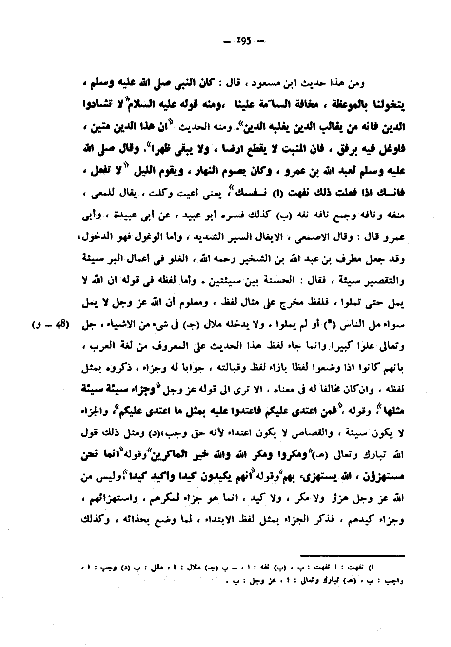 وَمِنْ هَذَا حَدِيثُ ابْنِ مَسْعُودٍ قَالَ كَانَ النَّبِيُّ صَلَّى اللَّهُ عَلَيْهِ وَسَلَّمَ يَتَخَوَّلُنَا بِالْمَوْعِظَةِ مَخَافَةَ السَّآمَةِ عَلَيْنَا وَمِنْهُ قَوْلُهُ عَلَيْهِ السَّلَامُ لَا تُشَادُّوا الدِّينَ فَإِنَّهُ مَنْ يُغَالِبُ الدِّينَ يَغْلِبُهُ الدِّينُ وَمِنْهُ الْحَدِيثُ إِنَّ هَذَا الدِّينَ مَتِينٌ فَأَوْغِلْ فِيهِ بِرِفْقٍ فَإِنَّ الْمُنْبَتَّ لَا يَقْطَعُ أَرْضًا وَلَا يُبْقِي ظَهْرًا وَقَالَ صَلَّى اللَّهُ عَلَيْهِ وَسَلَّمَ لِعَبْدِ اللَّهِ بْنِ عَمْرٍو وَكَانَ يَصُومُ النَّهَارَ وَيَقُومُ اللَّيْلَ لَا تَفْعَلْ فَإِنَّكَ إِذَا فَعَلْتَ ذَلِكَ نَفِهَتْ نَفْسُكَ يَعْنِي أَعْيَتْ وَكَلَّتْ يُقَالُ لِلْمُعْيِ مُنْفِهٍ وَنَافِهٍ وَجَمْعُ نَافِهٍ نُفْهٍ كَذَلِكَ فَسَّرَهُ أَبُو عُبَيْدٍ عَنْ أَبِي عُبَيْدَةَ وَأَبِي عَمْرٍو قَالَ وَقَالَ الْأَصْمَعِيُّ الايغال السير الشديد وأما الوغول فَهُوَ الدُّخُولُ وَقَدْ جَعَلَ مُطَرِّفُ بْنُ عَبْدِ اللَّهِ بْنِ الشِّخِّيرِ رَحِمَهُ اللَّهُ الْغُلُوَّ فِي أَعْمَالِ الْبِرِّ سَيِّئَةً وَالتَّقْصِيرَ سَيِّئَةً فَقَالَ الْحَسَنَةُ بَيْنَ سَيِّئَتَيْنِ وَأَمَّا لَفْظُهُ فِي قَوْلِهِ إِنَّ اللَّهَ لَا يَمَلُّ حَتَّى تَمَلُّوا فَلَفْظٌ مُخْرَجٌ عَلَى مِثَالِ لَفْظٍ وَمَعْلُومٌ أَنَّ اللَّهَ عَزَّ وَجَلَّ لَا يَمَلُّ سَوَاءً مَلَّ النَّاسُ أَوْ لَمْ يَمَلُّوا وَلَا يَدْخُلُهُ مَلَالٌ فِي شَيْءٍ مِنَ الْأَشْيَاءِ جَلَّ وَتَعَالَى عُلُوًّا كَبِيرًا وَإِنَّمَا جَاءَ لَفْظُ هَذَا الْحَدِيثِ عَلَى الْمَعْرُوفِ مِنْ لُغَةِ الْعَرَبِ بِأَنَّهُمْ كَانُوا إِذَا وَضَعُوا لَفْظًا بِإِزَاءِ لَفْظٍ وَقُبَالَتِهِ جَوَابًا لَهُ وَجَزَاءً ذَكَرُوهُ بِمِثْلِ لَفْظِهِ وَإِنْ كَانَ مُخَالِفًا لَهُ فِي مَعْنَاهُ أَلَا تَرَى إِلَى قَوْلِهِ عَزَّ وَجَلَّ وجزاء سيئة بسيئة مِثْلُهَا وَقَوْلُهُ فَمَنِ اعْتَدَى عَلَيْكُمْ فَاعْتَدُوا عَلَيْهِ بِمِثْلِ مَا اعْتَدَى عَلَيْكُمْ وَالْجَزَاءُ لَا يَكُونُ سَيِّئَةً وَالْقِصَاصُ لَا يَكُونُ اعْتِدَاءً لِأَنَّهُ حَقٌّ وَجَبَ وَمِثْلُ ذَلِكَ قَوْلُ اللَّهِ تَبَارَكَ وَتَعَالَى (هـ) وَمَكَرُوا وَمَكَرَ اللَّهُ وَاللَّهُ خَيْرُ الْمَاكِرِينَ وَقَوْلُهُ انما نحن مستهزؤن الله يستهزىء بهم وقوله انهم يكيدون كيدا واكيدا كَيْدًا وَلَيْسَ مِنَ اللَّهِ عَزَّ وَجَلَّ هُزُؤٌ وَلَا مَكْرٌ وَلَا كَيْدٌ إِنَّمَا هُوَ جَزَاءٌ لِمَكْرِهِمْ وَاسْتِهْزَائِهِمْ وَجَزَاءُ كَيْدِهِمْ فَذَكَرَ الْجَزَاءَ بِمِثْلِ لَفْظِ الِابْتِدَاءِ لَمَّا وُضِعَ بِحِذَائِهِ وَكَذَلِكَ